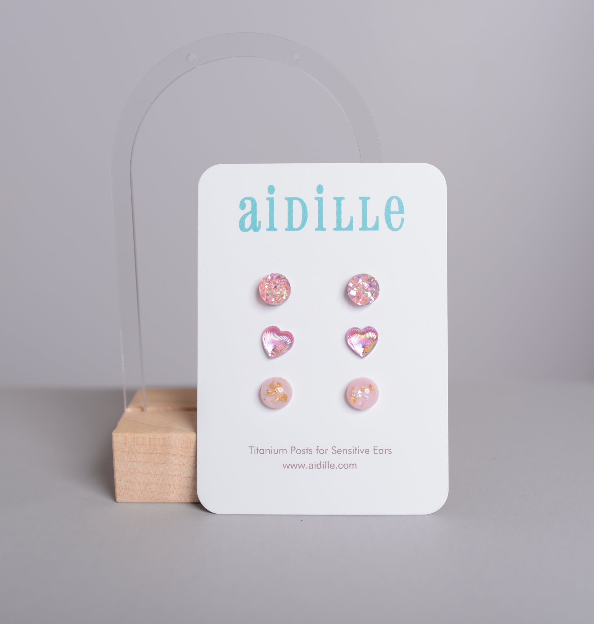One iridescent shell heart, one sparkly druzy, and one iridescent foil circle pair