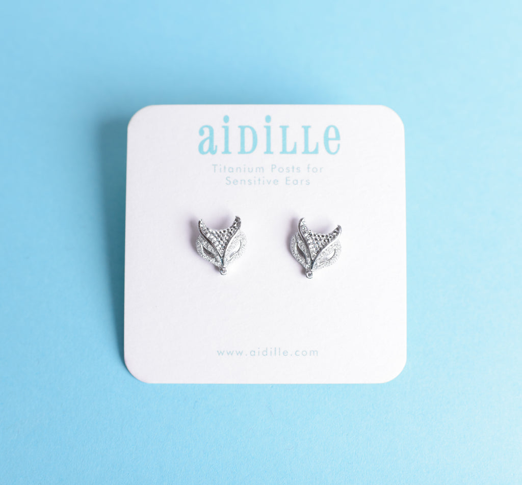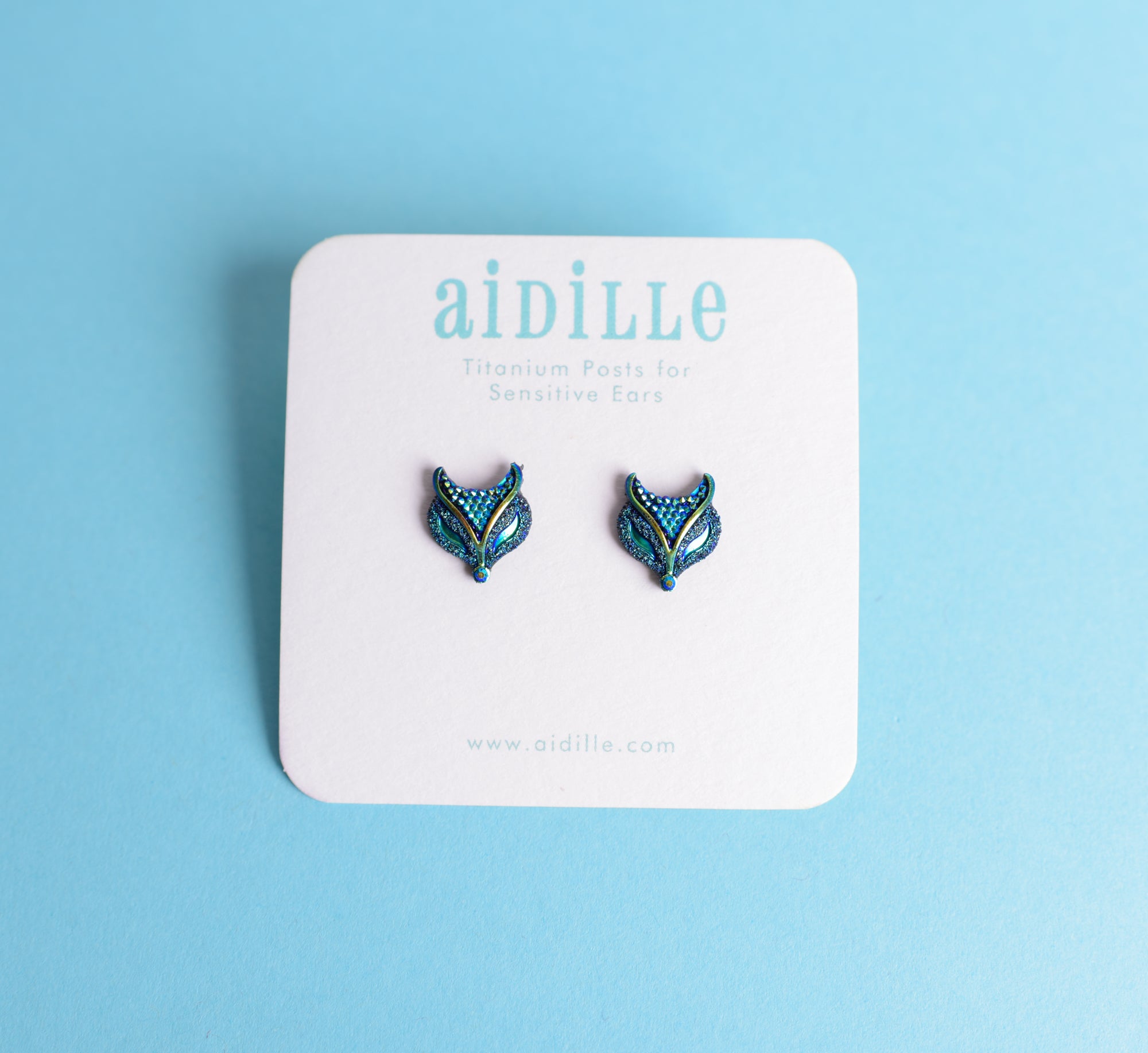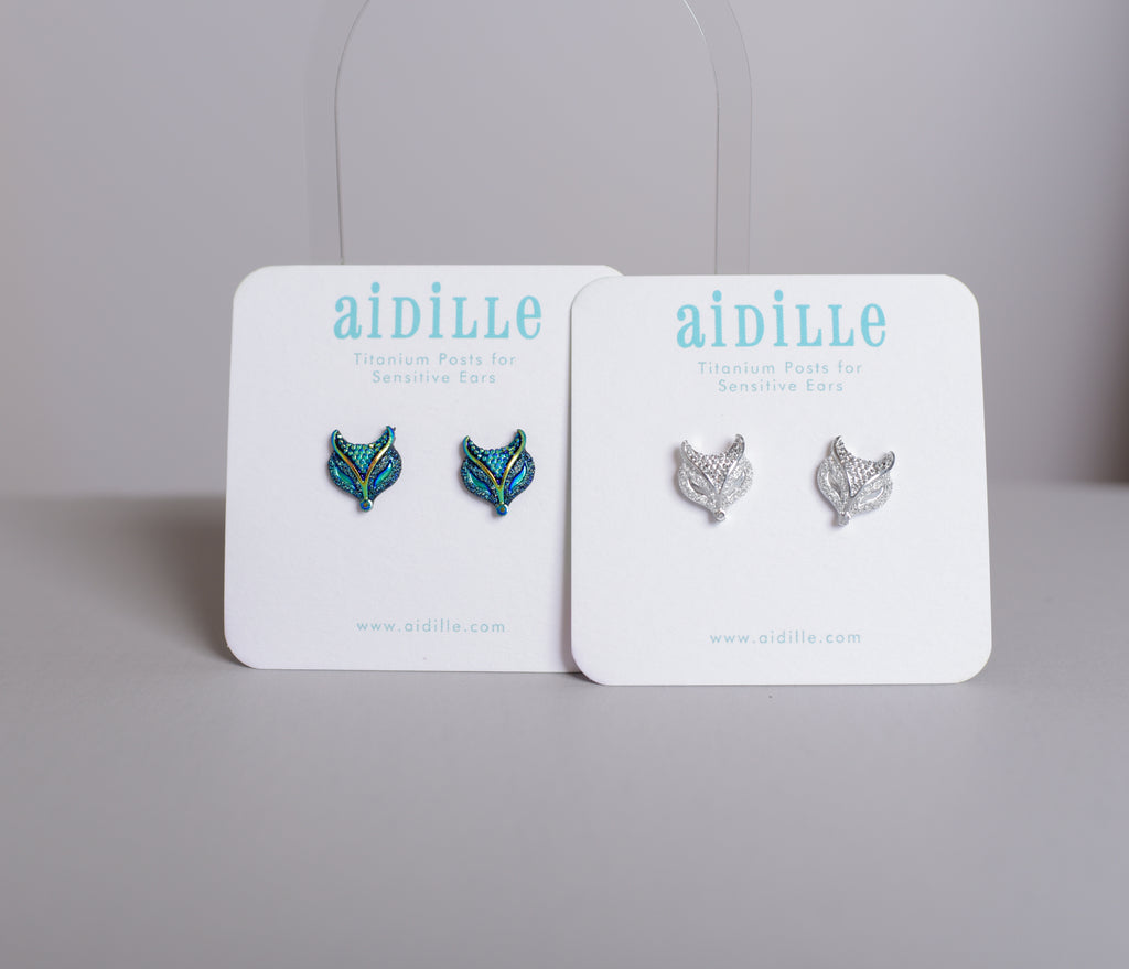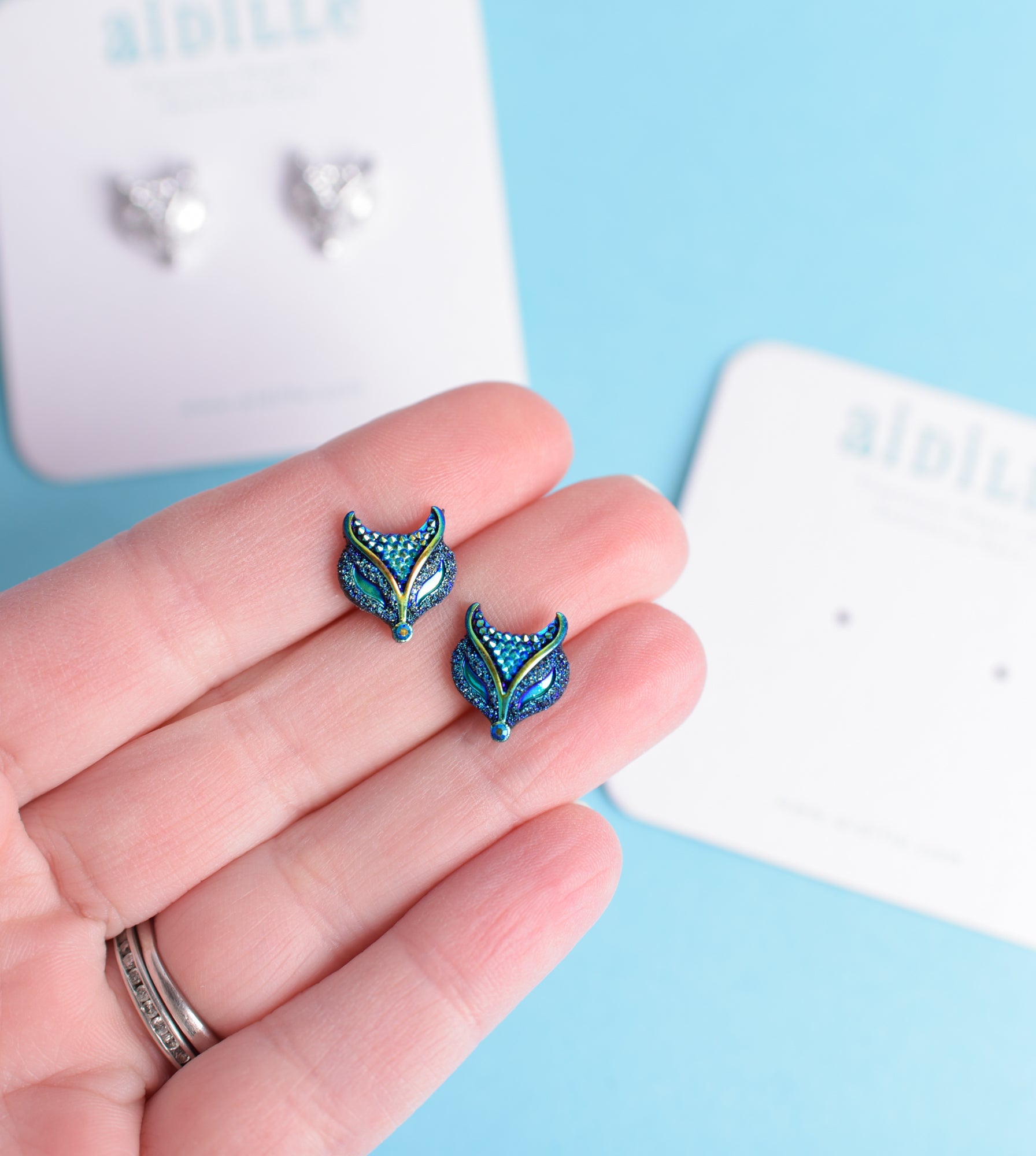 One pair of glitter fox earrings in your choice of silver or peacock blue. Earrings are hand assembled using commercial lightweight resin charms and made in the USA hypoallergenic titanium posts. Earrings measure about 1/2" wide and include both silicone and stainless steel backings for choice.