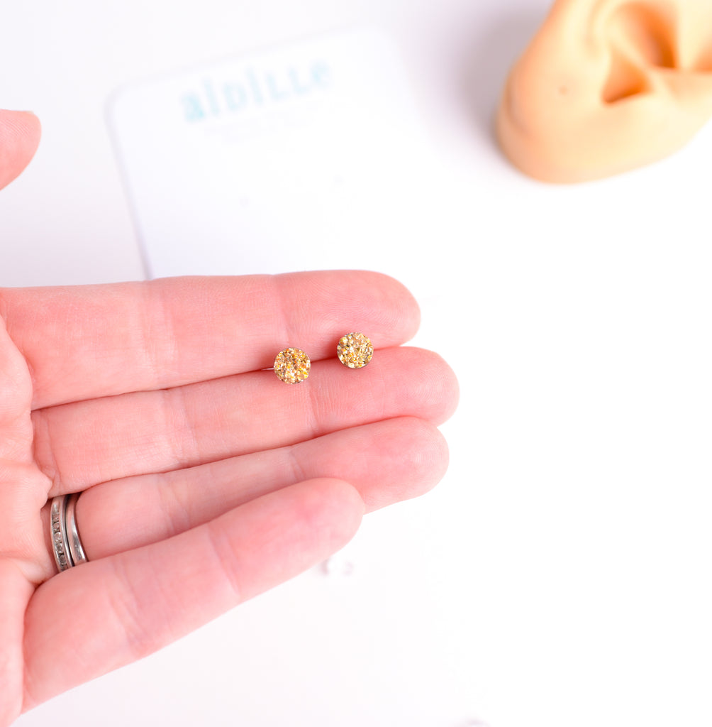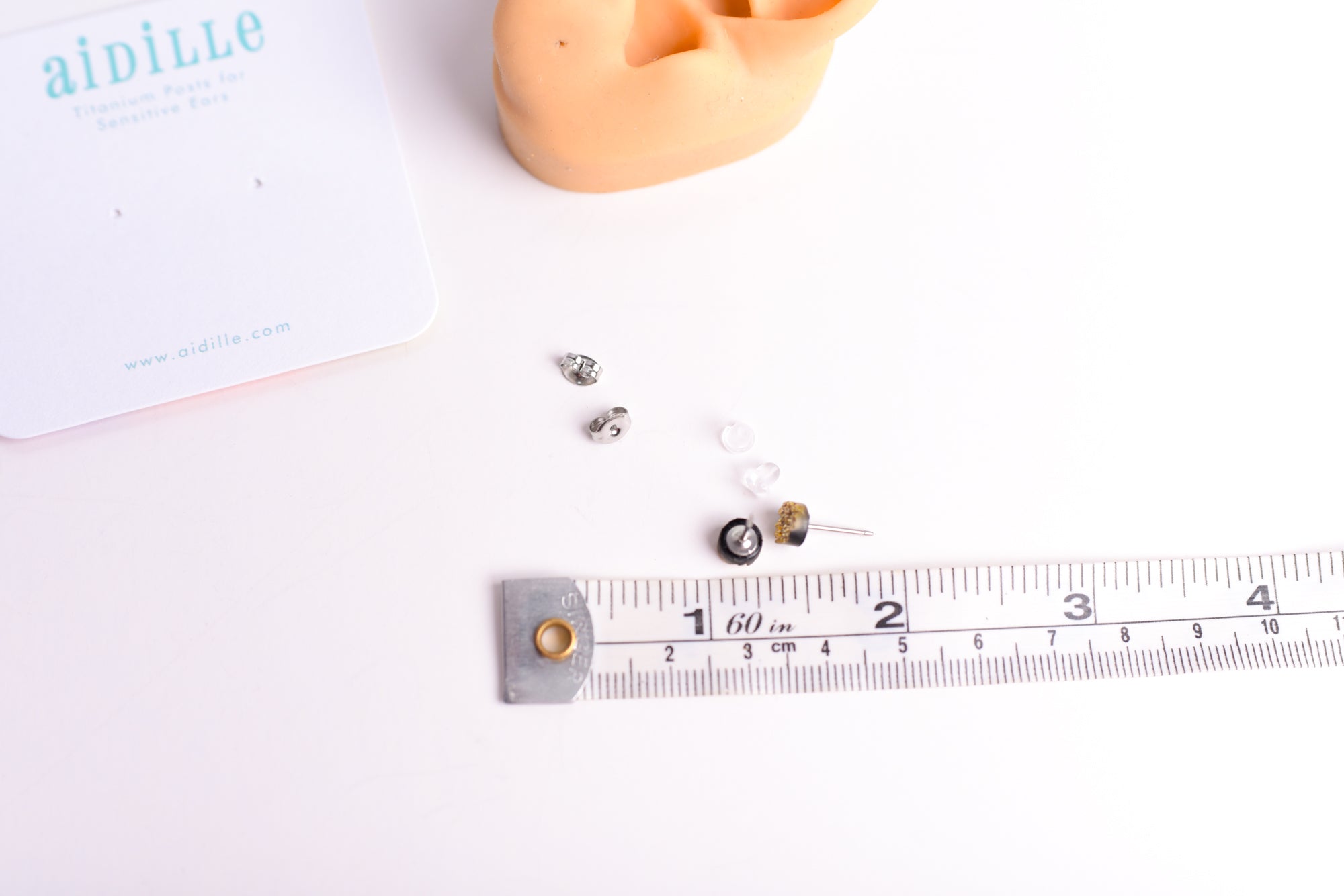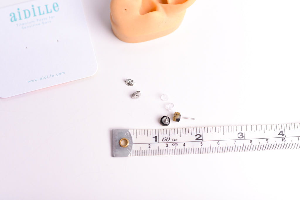 Nickel free titanium studs with stainless steel pads; posts measure 9.5mm long and are 21 gauge. Titanium is Grade 1.