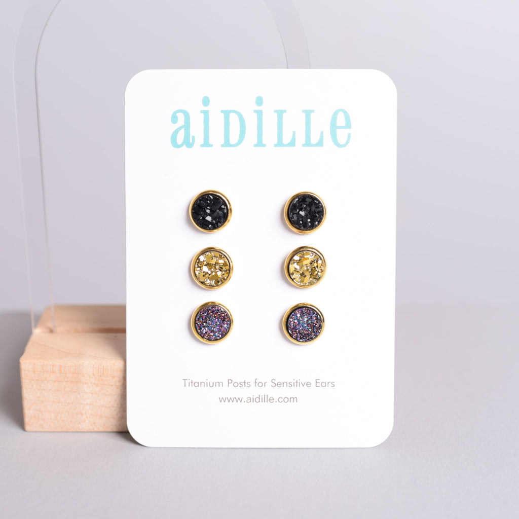 Gold and Black Mini Druzy Earring Trio with Titanium Posts