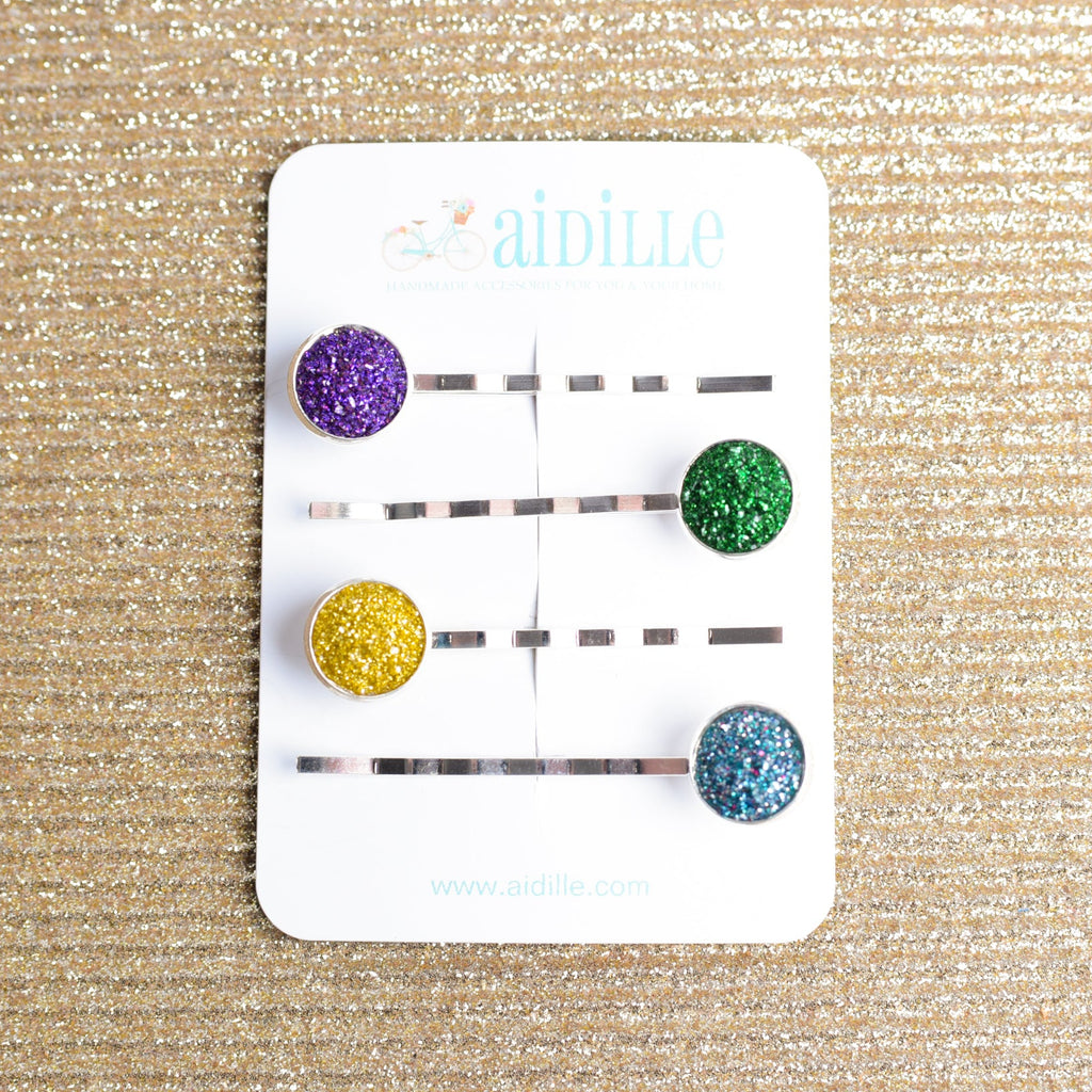 Mardi Gras Sparkly Druzy Bobby Pins- Set of 4