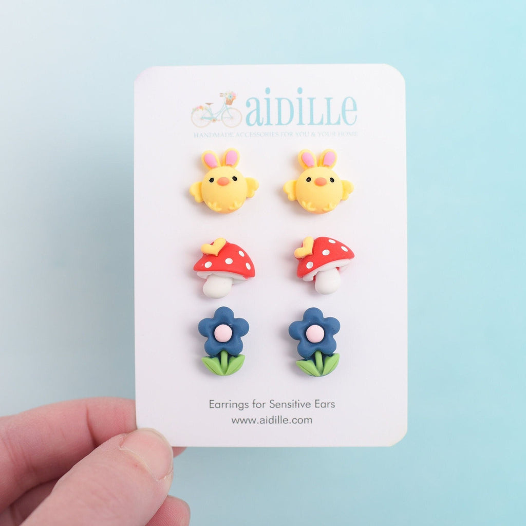 Spring Chick, Mushroom, and Flower Earring Trio with Titanium Posts