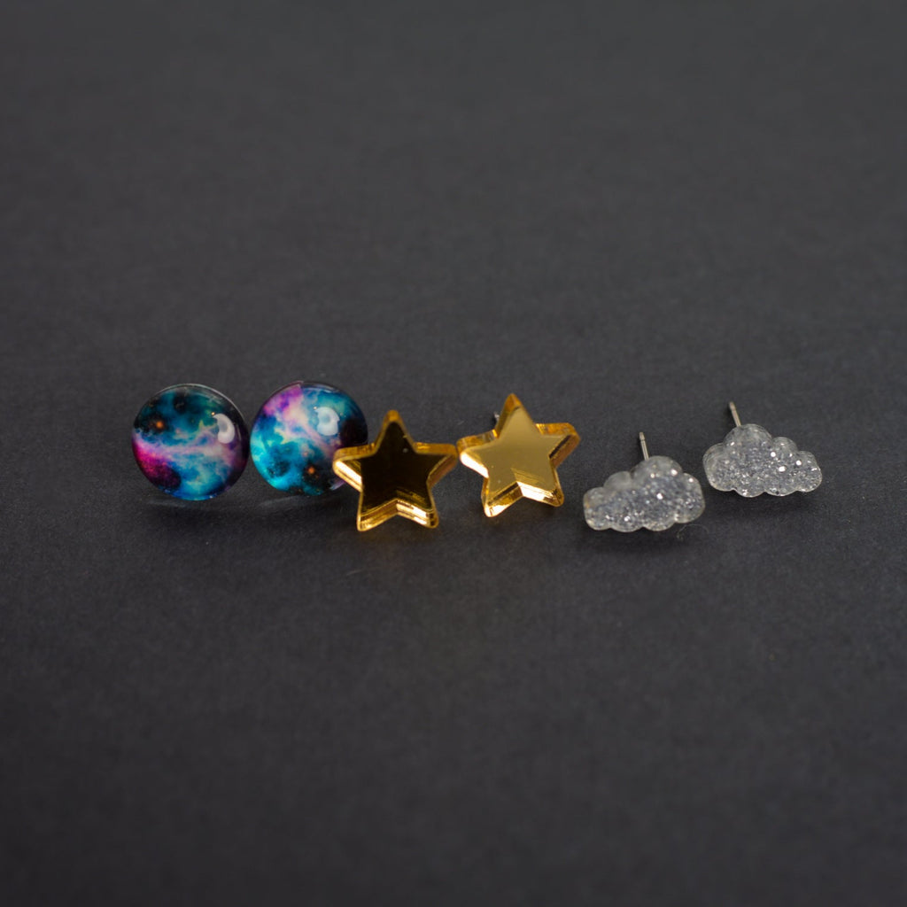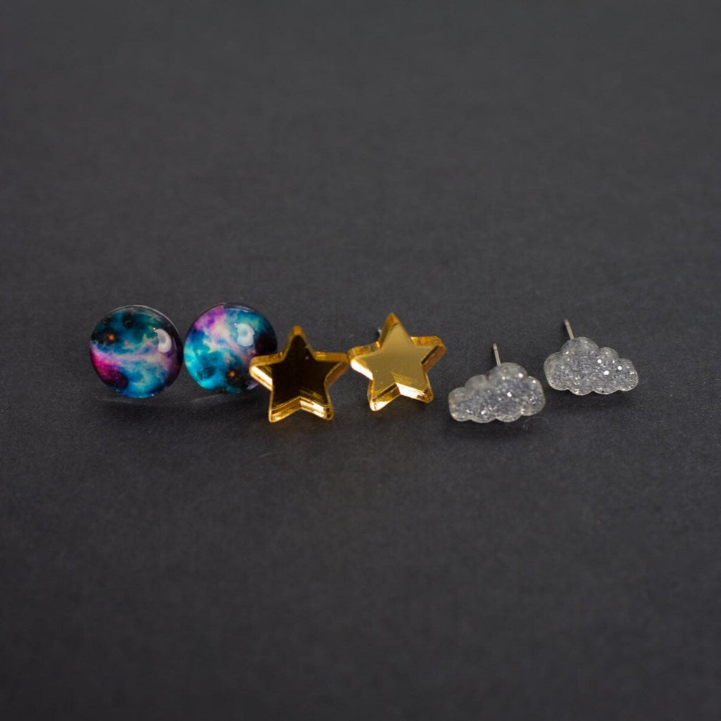 Celestial Earring Trio with Titanium Posts: Outer Space, Gold Stars, Silver Clouds