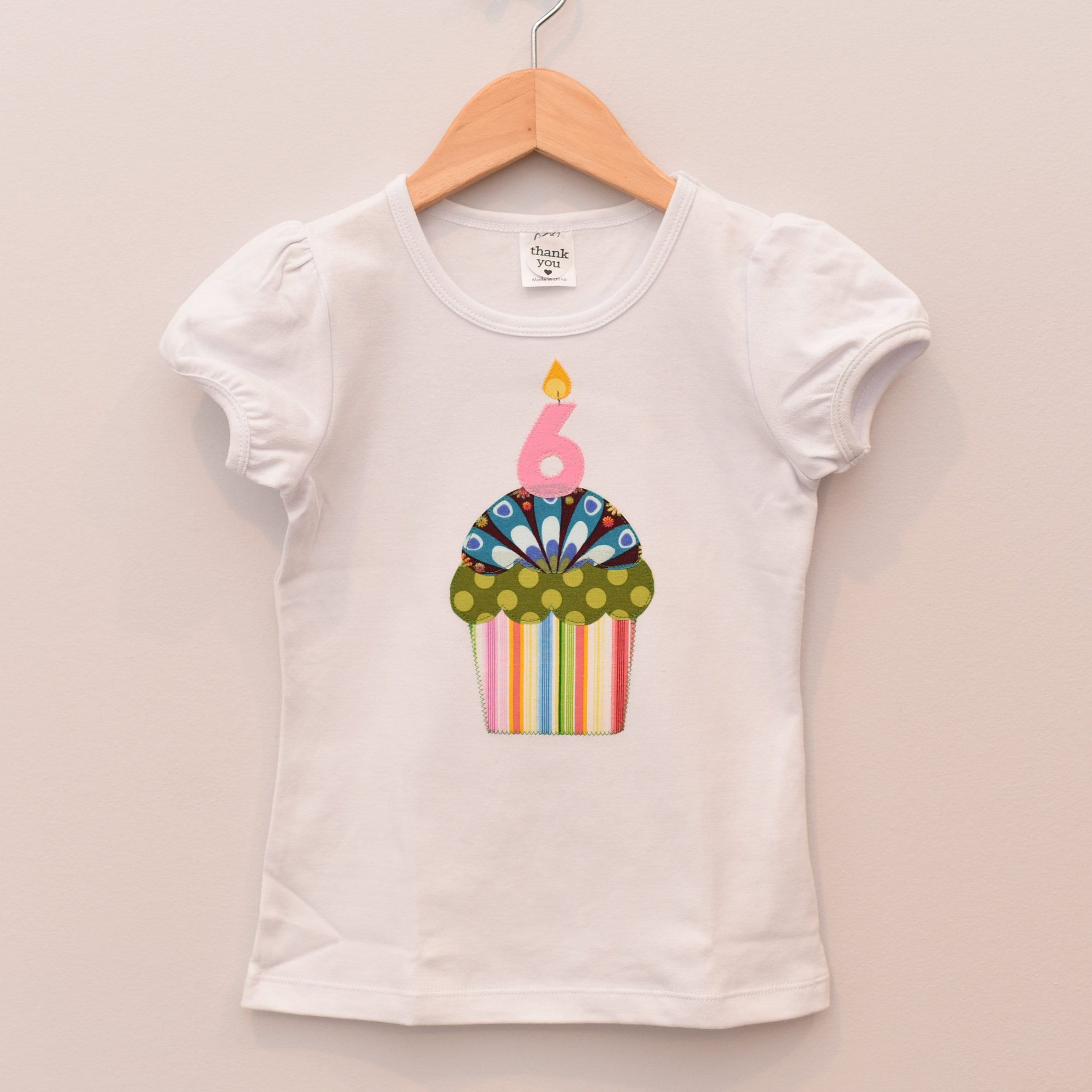DETAILS: 1 in stock, ships in 1-3 business days Size 6 (measures approx. 18" long by 12" wide) White short puff sleeve tee Cupcake applique with #6 candle