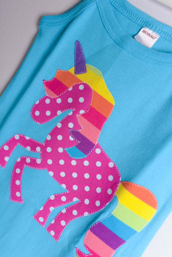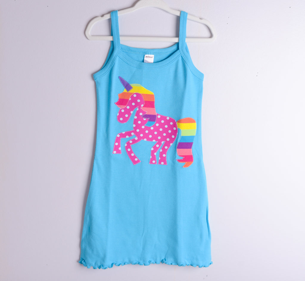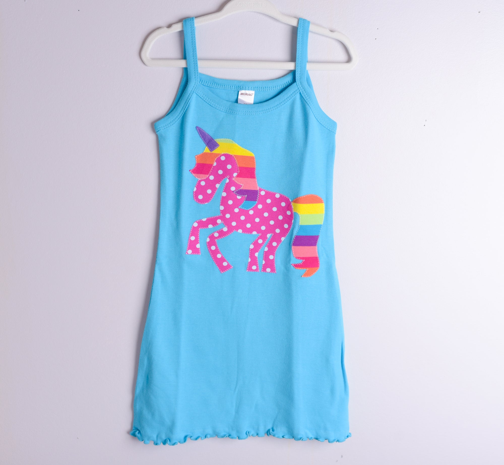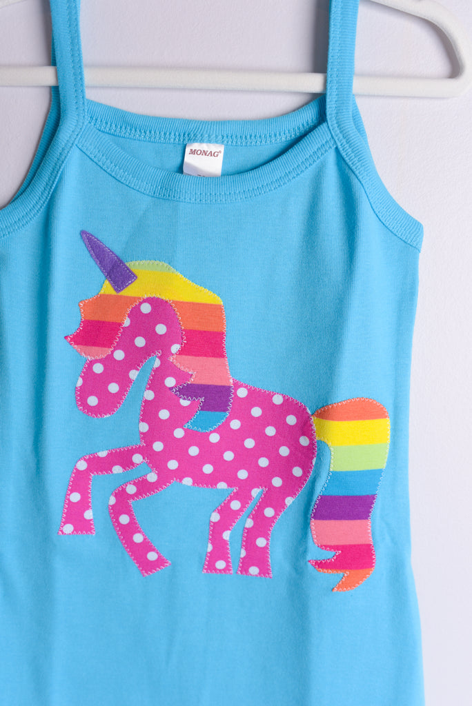 This adorable Size 2 Monag brand tank dress features a hand-drawn unicorn applique made from colorful rainbow and pink polka dot fabrics. Measuring 21" long by 9" wide flat, it’s crafted from soft 100% cotton in a cheerful aqua shade and finished with a cute scalloped hem. Hurry—there’s only one of these magical dresses available!