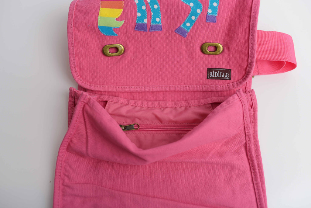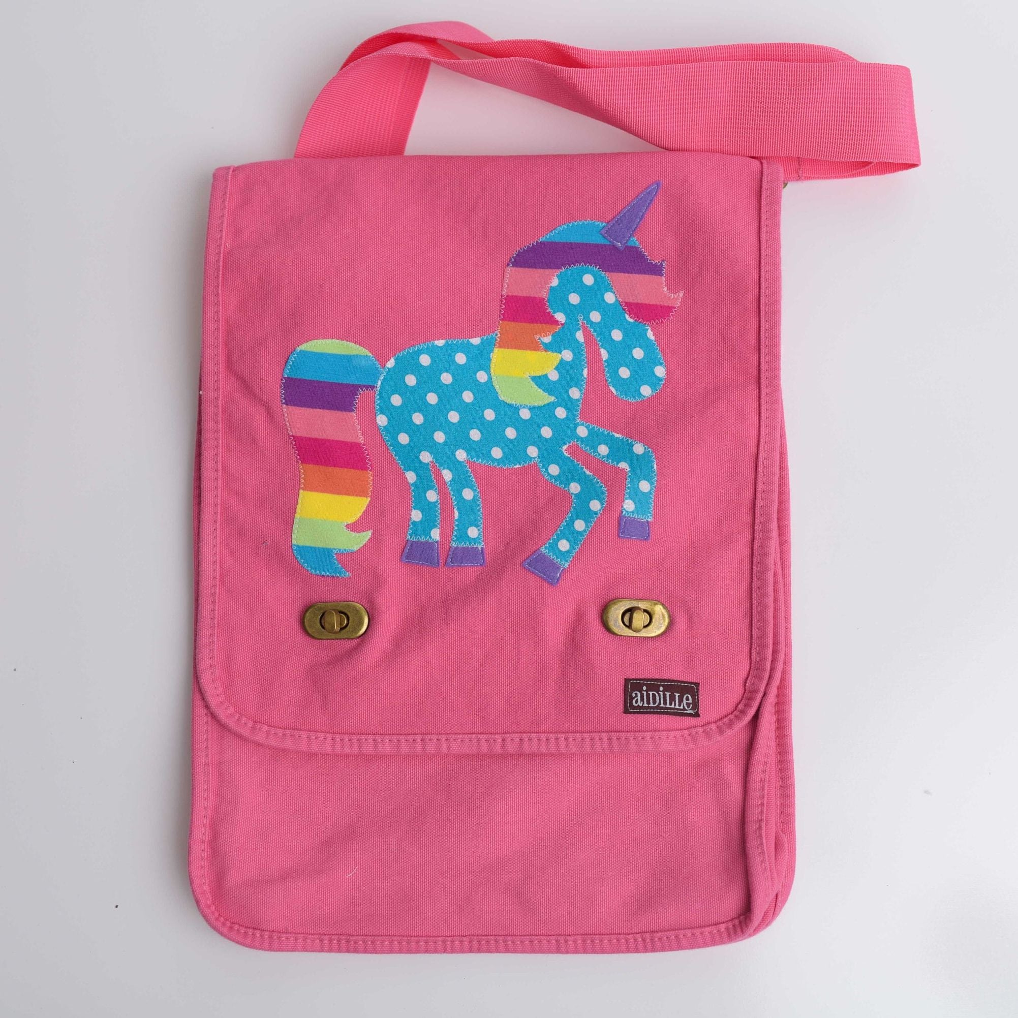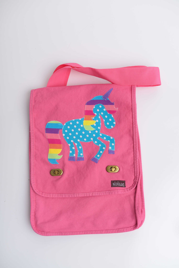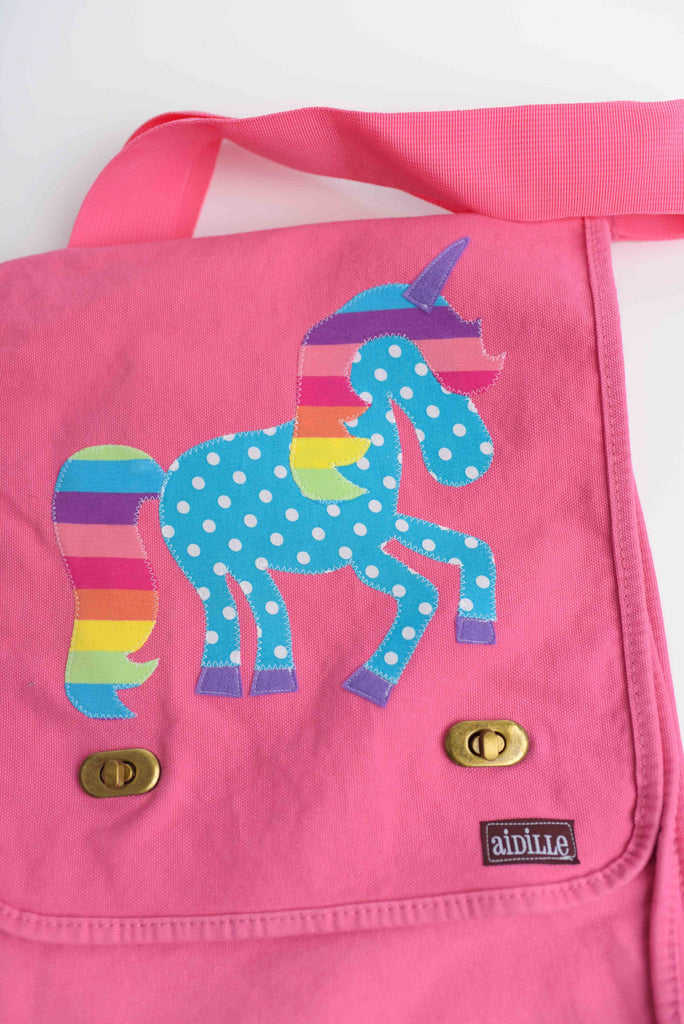 Original Aidlle design rainbow unicorn applique sewn to the front