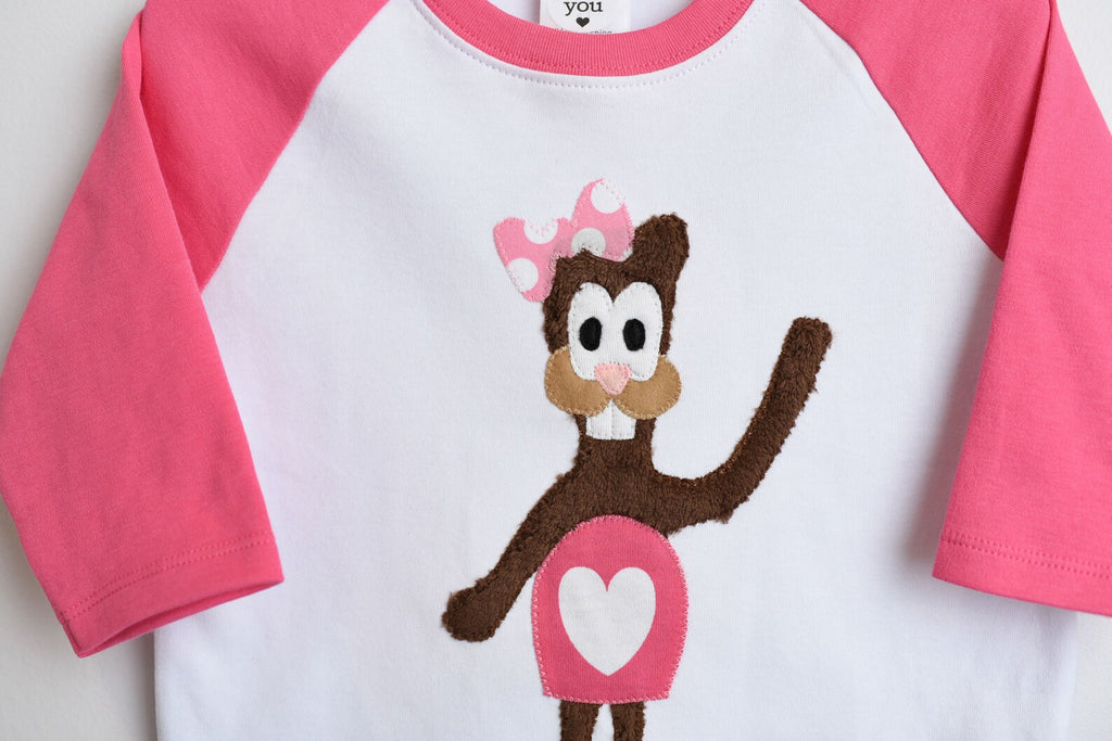 This original Aidille furry beaver in a bubble romper applique design is sewn to a pink and white raglan shirt.