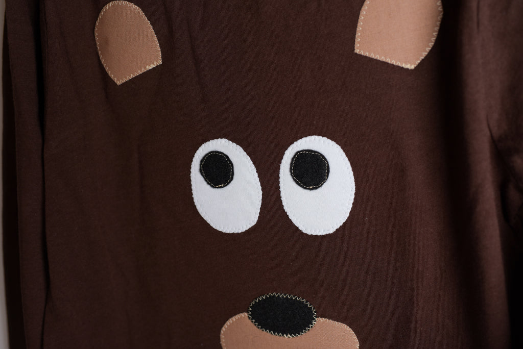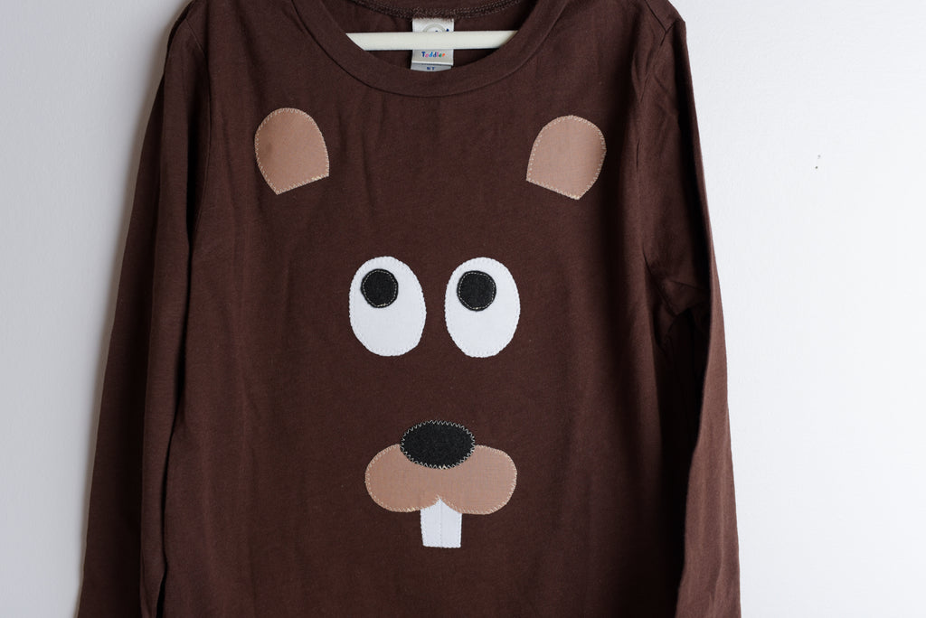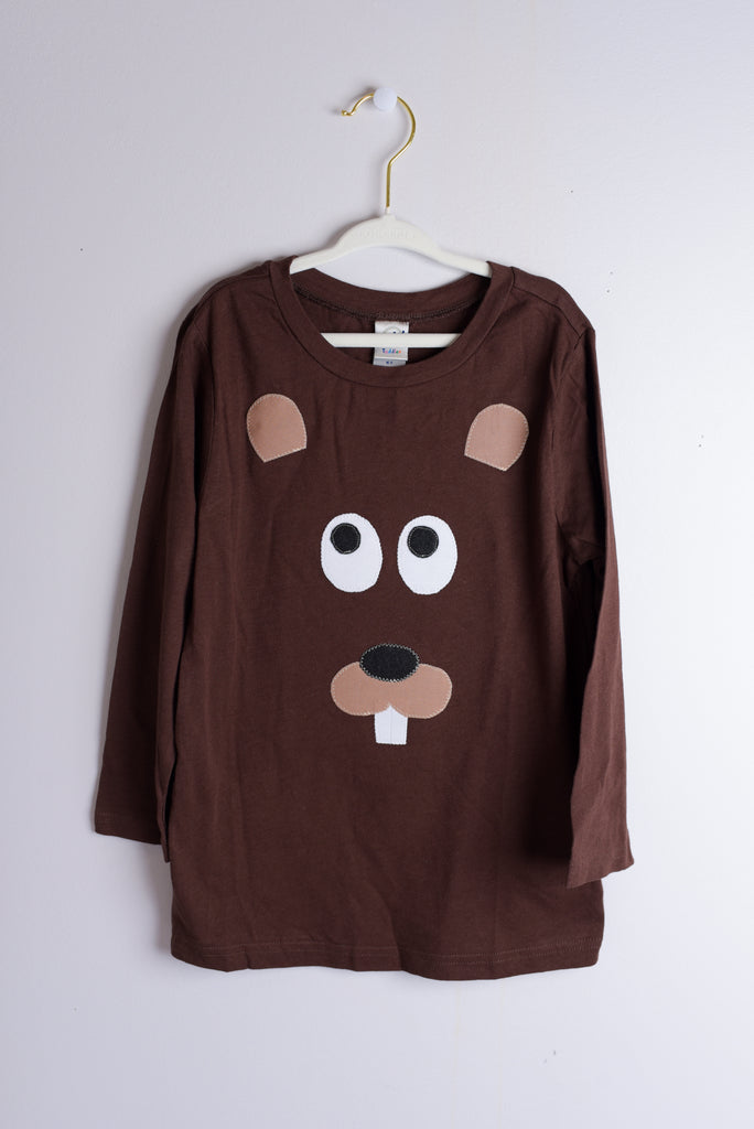This size 5T brown three quarter length sleeve 100% cotton tee features a playful beaver face applique, hand-drawn and cut from cotton fabric, then sewn on with care. An original Aidille design. Hurry, only one available!