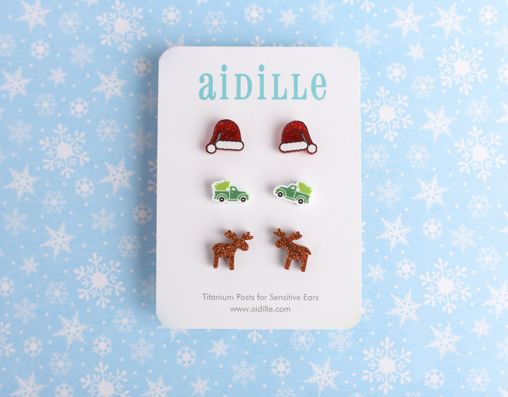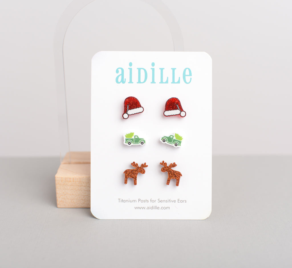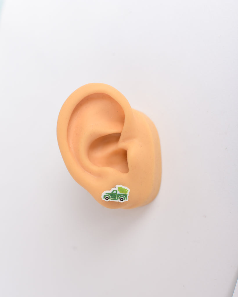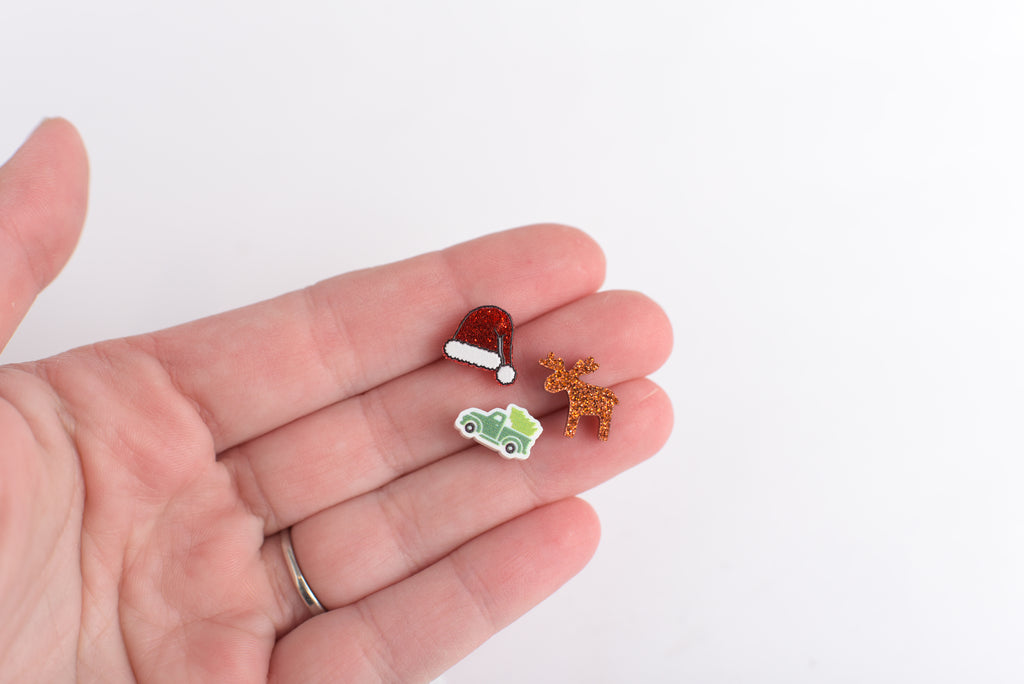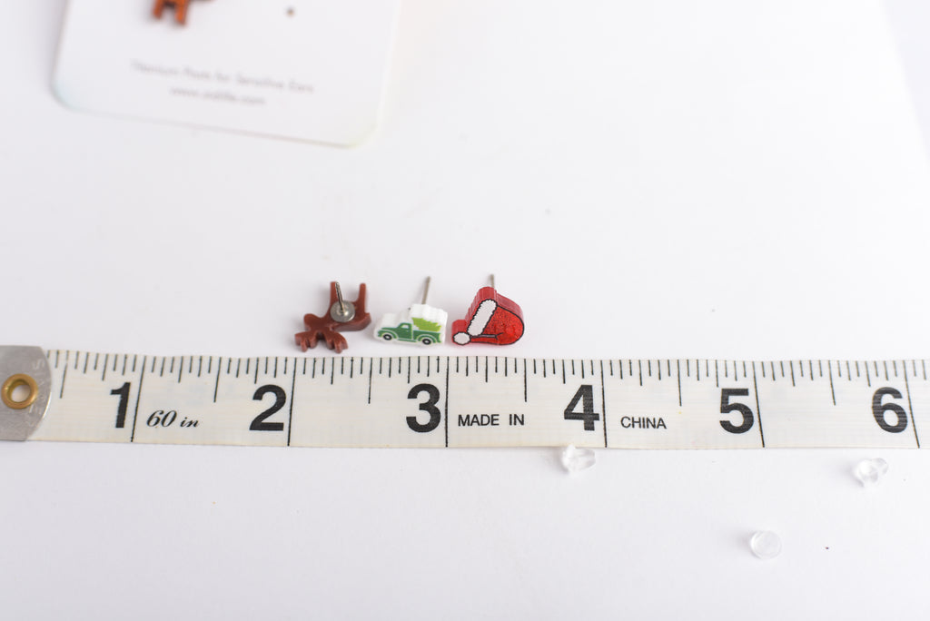 This sweet Christmas earring multi pack set includes 3 pairs of holiday styles in lightweight acrylic: Santa hats, green vintage trucks, and coppper reindeer. Earrings are handmade using made in the USA laser cut charms and hypoallergenic titanium posts; perfect for the most sensitive of ears. Styles measure around 1/2" +/-; see images for scale. Silicone ear is based off the size of an average adult woman. Only one of these sets are available!