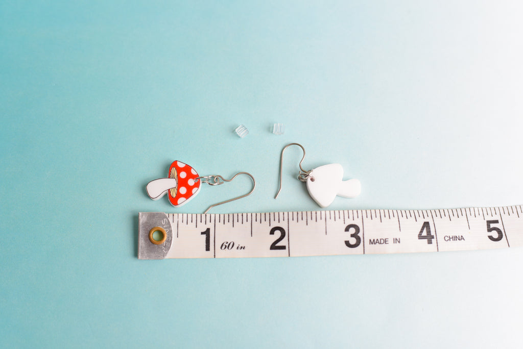Sweet lightweight red and white polka dotted mushroom dangle earrings with hypoallergenic, nickel free titanium ear wires. The reverse side is white and the earrings measure around 1.5" tall. Silicone backings are included for a secure fit.