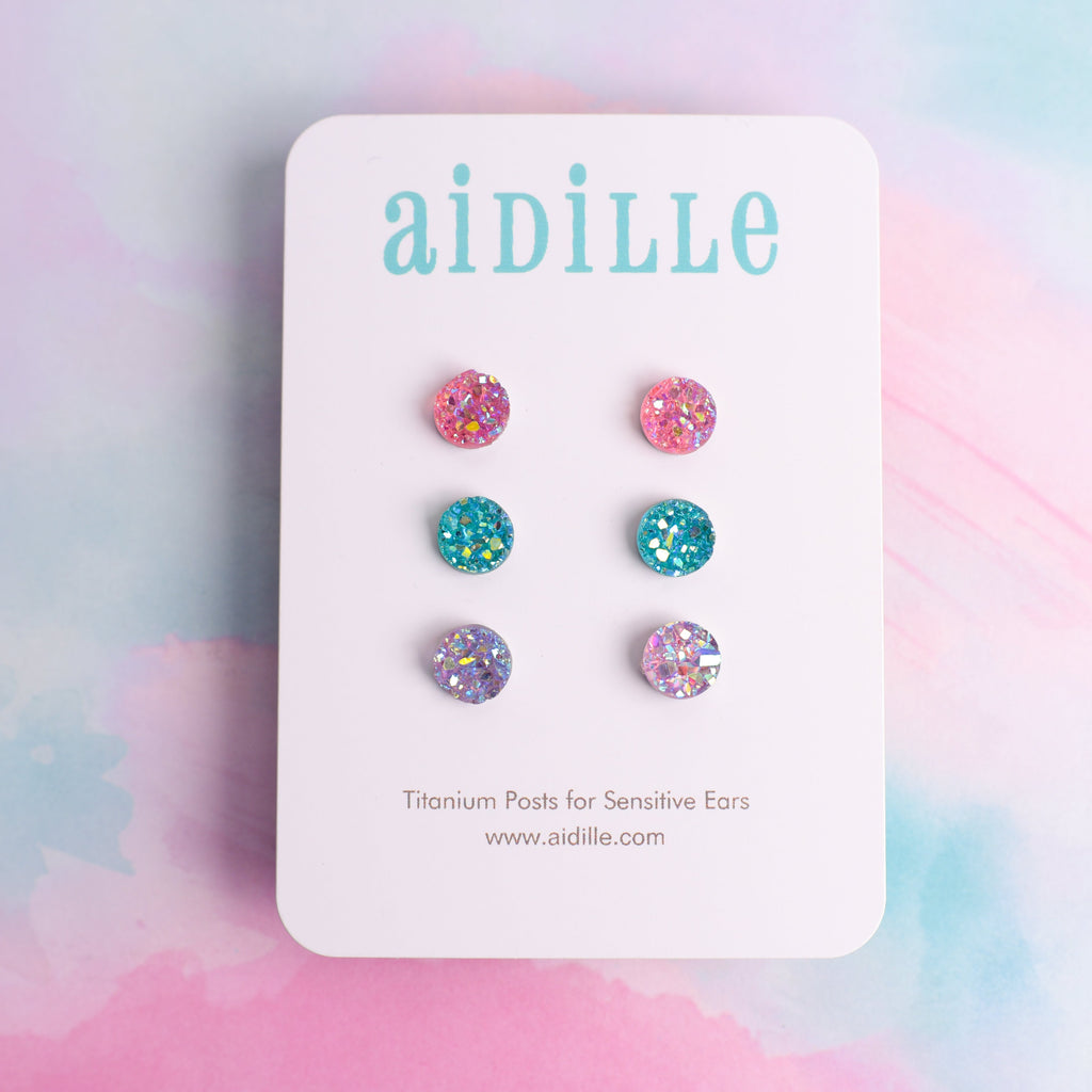 An Aidille favorite; earring trios! Get 3 complimentary styles all on one card. Trios are composed of either handmade fabric buttons or from resin charms with attached hypoallergenic studs. All Aidille earrings use titanium posts; perfect for even the most sensitive of ears, and include both silicone and stainless steel butterfly backings for choice.
