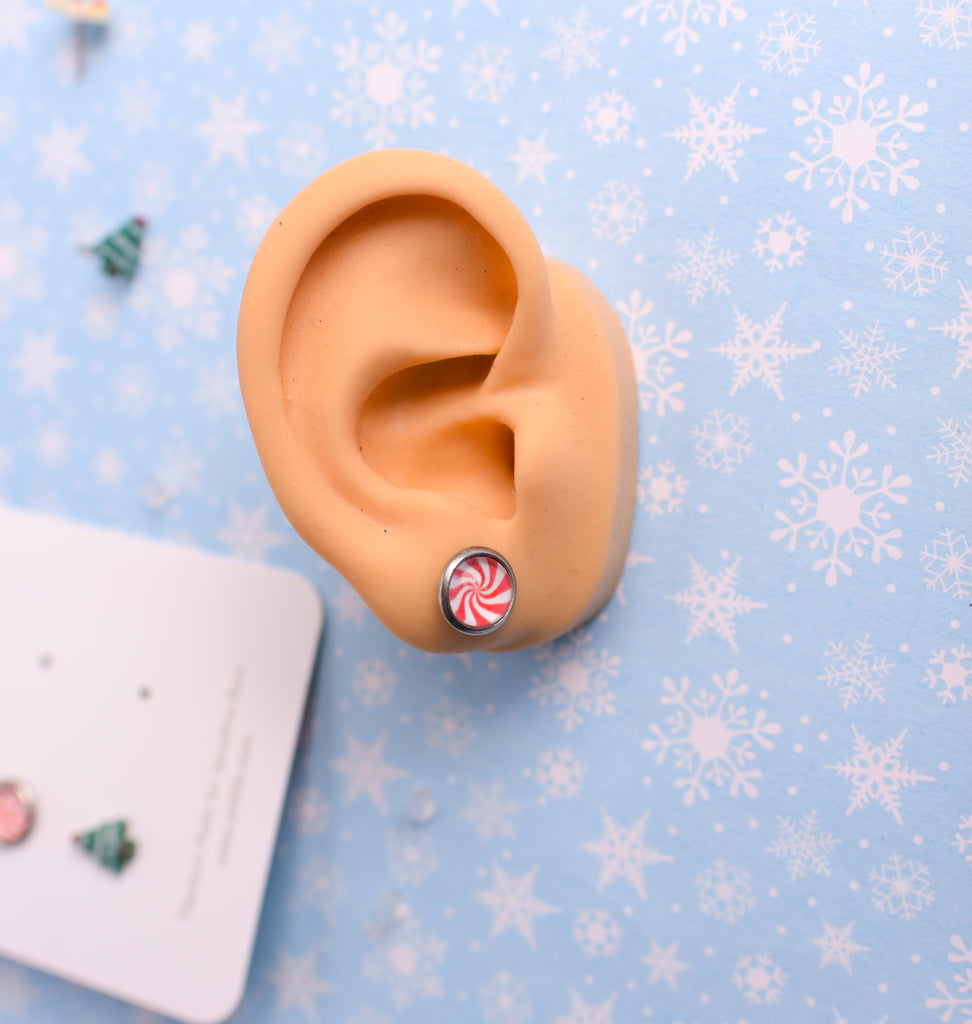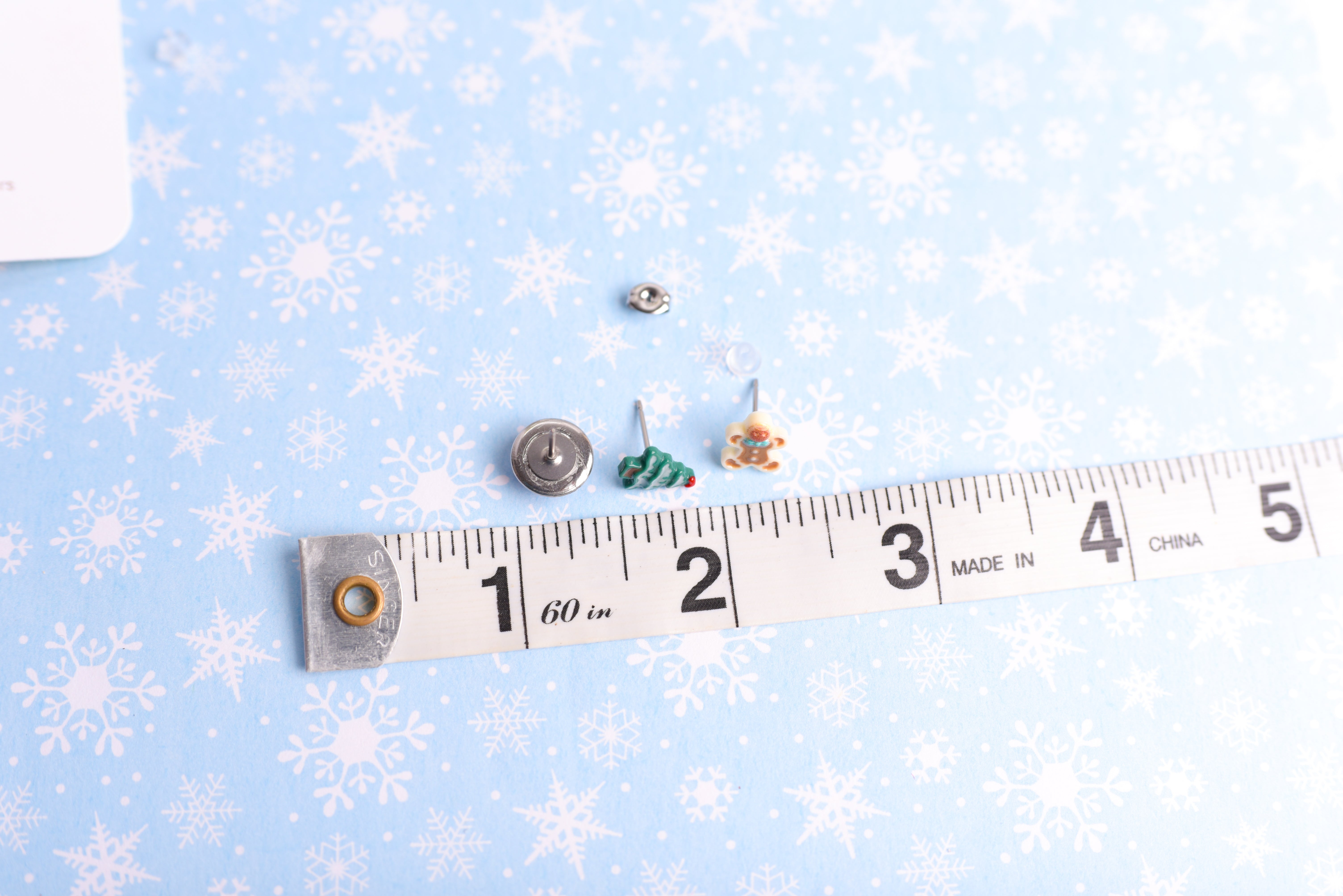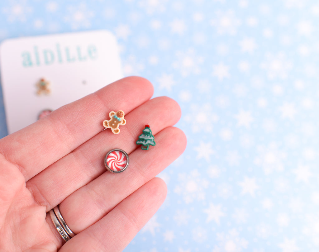 This sweet winter holiday earring trio features little resin gingerbread men, peppermint swirls, and snow capped pine trees. *Peppermint earrings are now placed in stainless steel trays for longevity; just like the first image. Enjoy at Christmas time and for all of the cheerful season! Earrings are lightweight and great for sensitive ears with hypoallergenic titanium posts. Dainty styles measure between 1/4-1/2"; see images for scale and note the silicone ear is based off the size of an average adult woman.