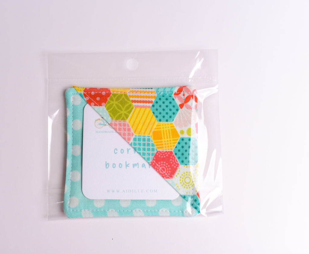 This fun fabric corner bookmark is handmade using quality quilt and polka dot 100% cotton fabrics in cherry shades of blue, yellow, and red. Fabric is from designer Riley Blake. You will receive ONE bookmark; images show front and back. Bookmark is top stitched and measures around 3.5" square.