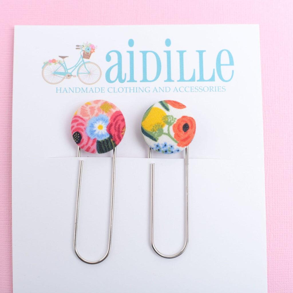 Handmade fabric bookmarks are sewn using beautiful designer fabrics. Simply place in the corner of your favorite book and voila; a stylish and functional place holder! Corner bookmarks make wonderful stocking stuffers and teacher gifts. Fun jumbo planner clips using colorful charms and buttons are also available.