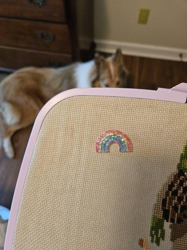 Glitter resin rainbow needle minder Measures around 32mm wide by 20mm tall Two magnets for a strong hold Needle/hoop not included Also use as a magnet or magnetic brooch