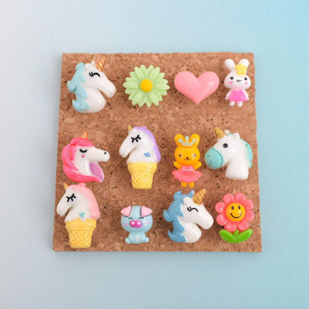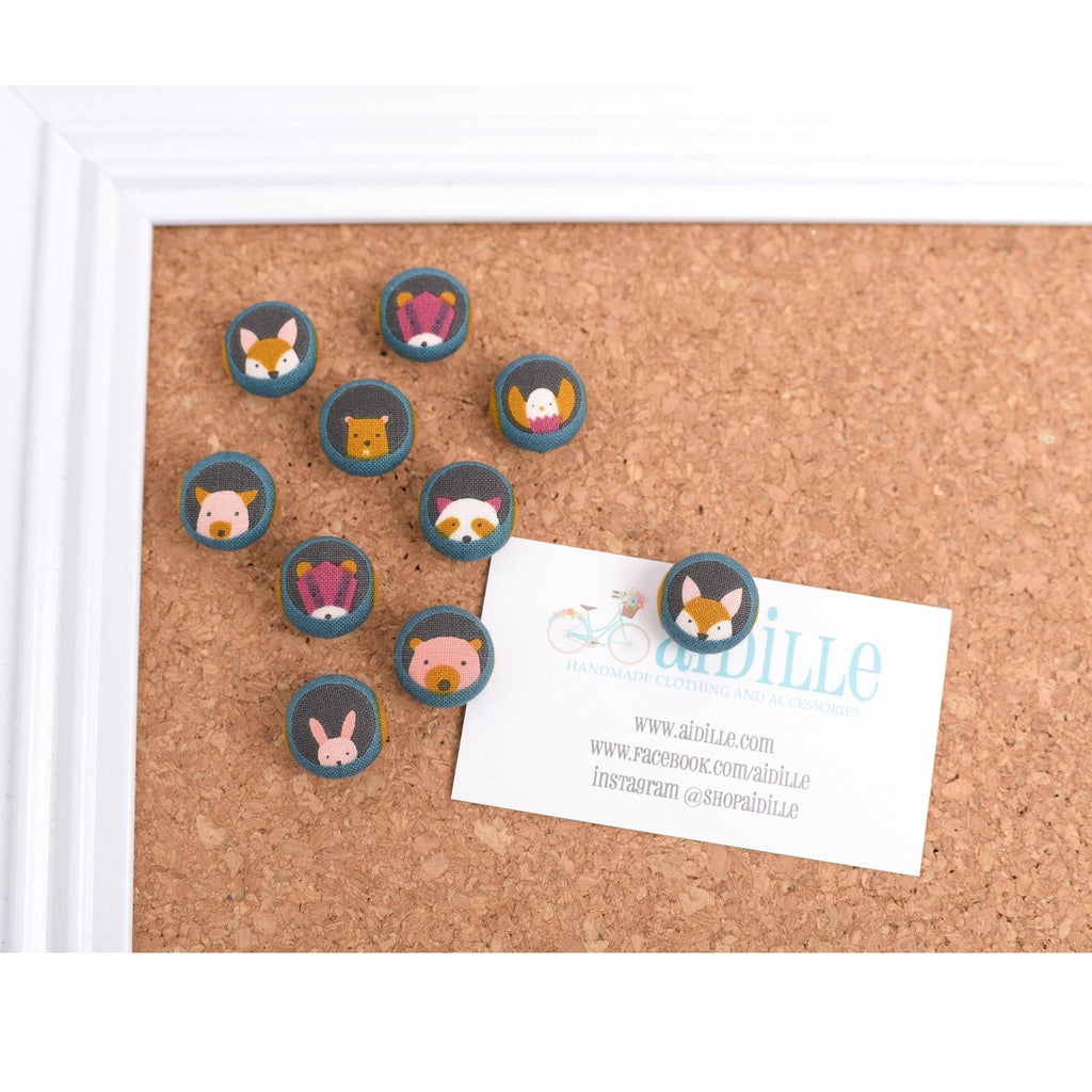 Novelty push pins are crafted right here in our home studio using either fabric buttons that we handmake or from resin pieces that we procure and then add backings. Dress up your home or office decorative corkboard with these fun pieces! Made with sturdy metal push pins that are upholstery grade.