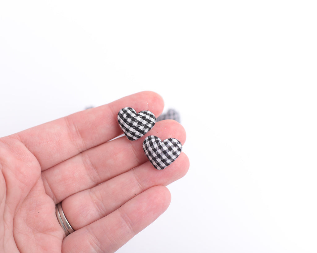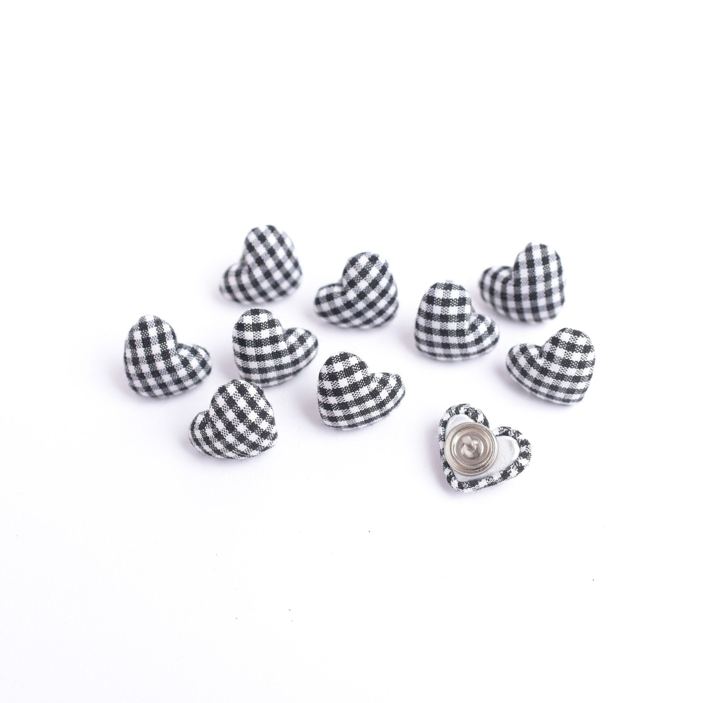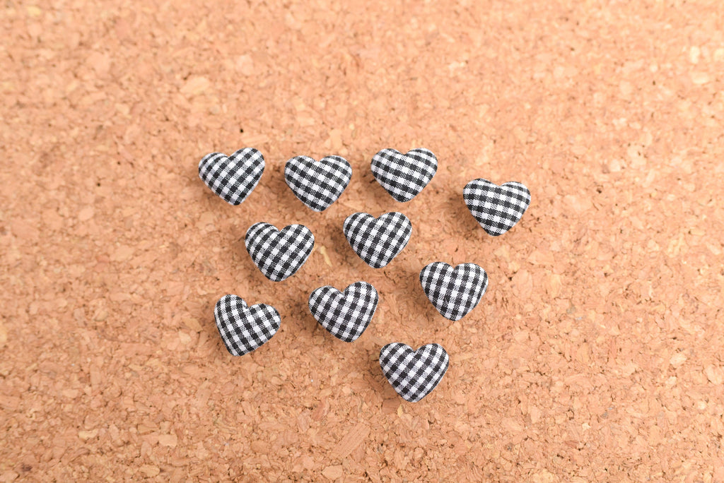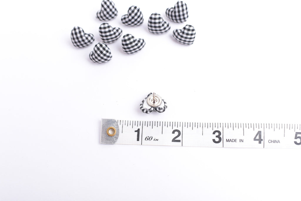 Set of 10 Black and White Gingham Plaid Heart Fabric Button Push Pins