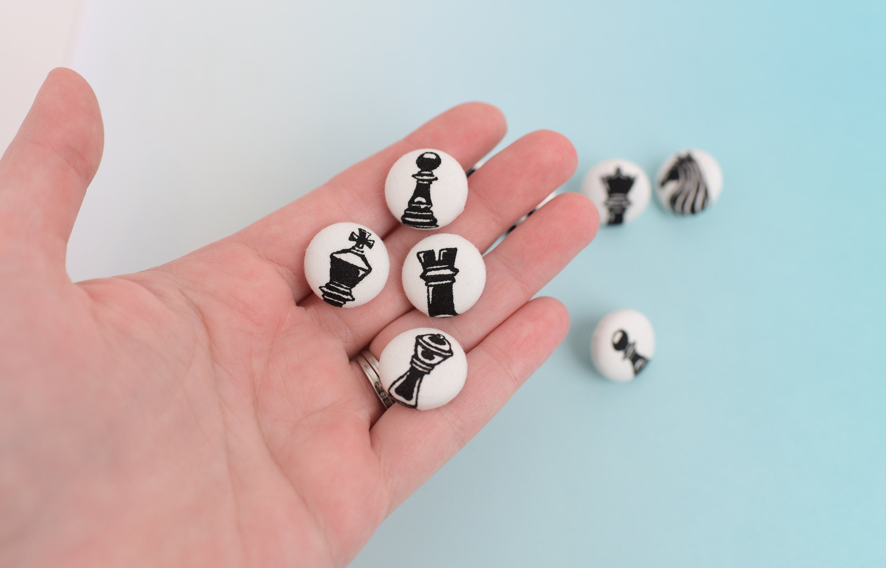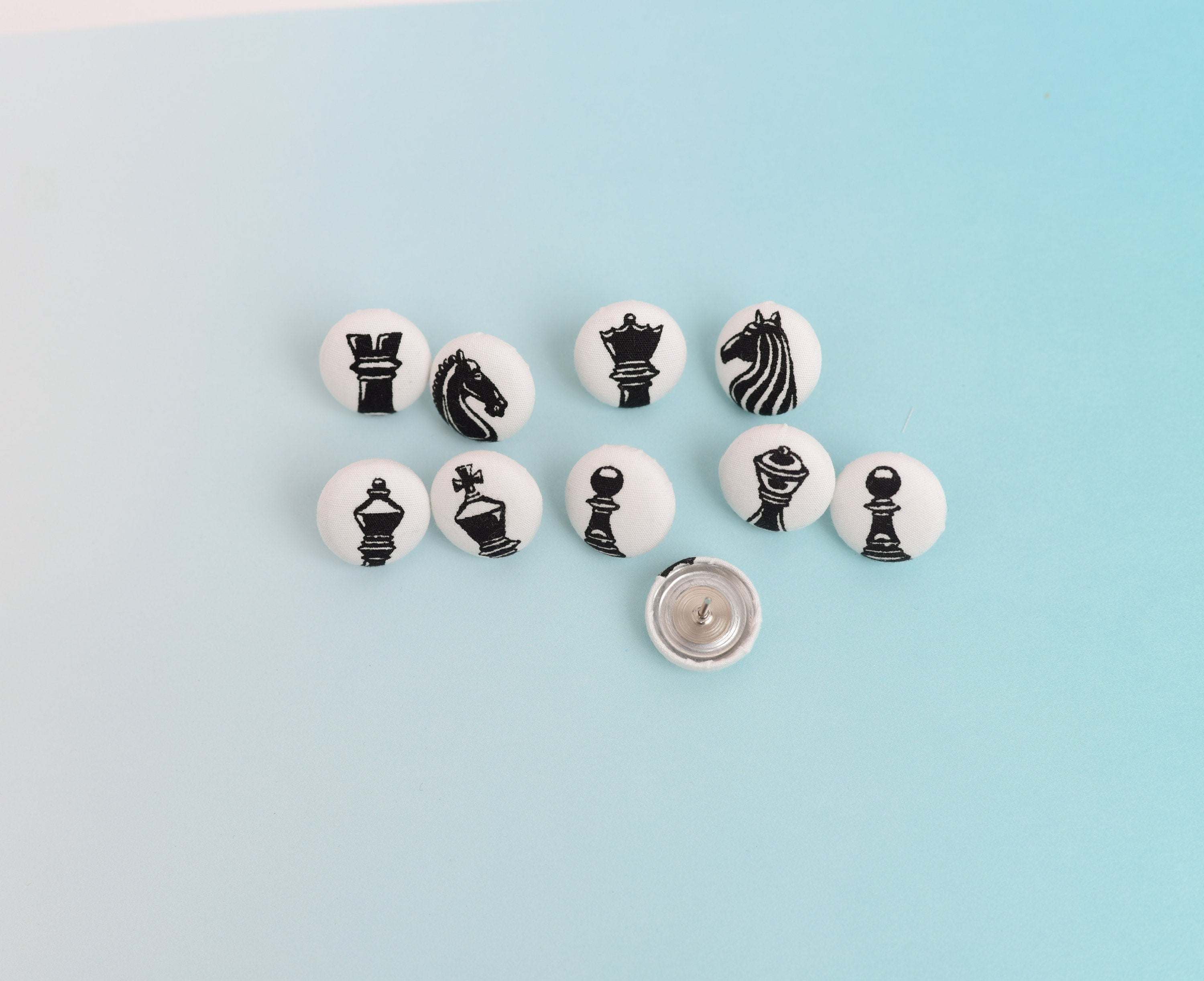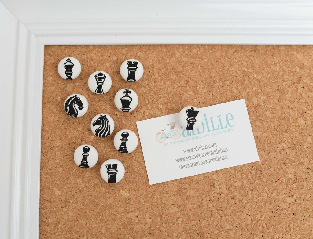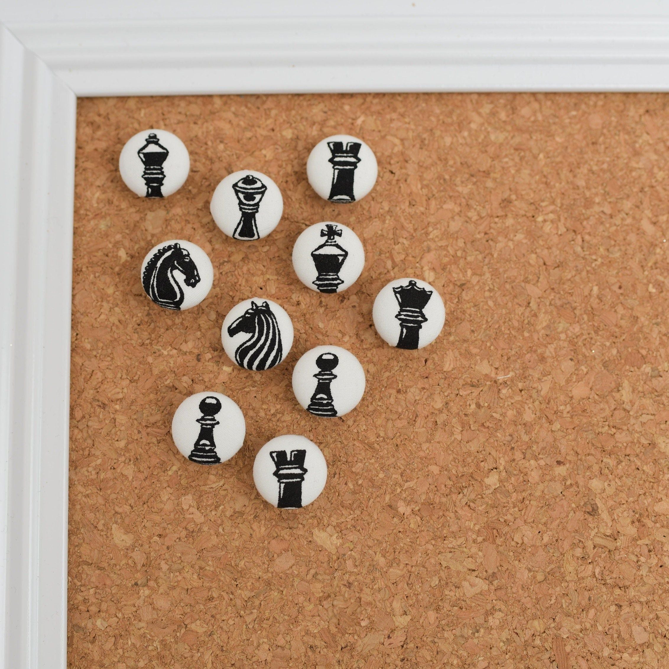 This cool set of fabric button decorative push pins includes assorted chess piece patterns. These thumb tacks can be used on cork boards, bulletin boards, cubicles, dorm rooms, or anywhere else you need. Keep for yourself or give as a gift; a cute AND practical gift idea for office workers and teachers.