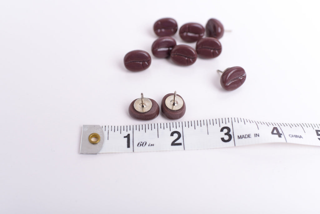 Resin coffee beans measure a little over 1/2" wide; quality metal thumb tack prongs range from 10-13 deep (depending on availability).
