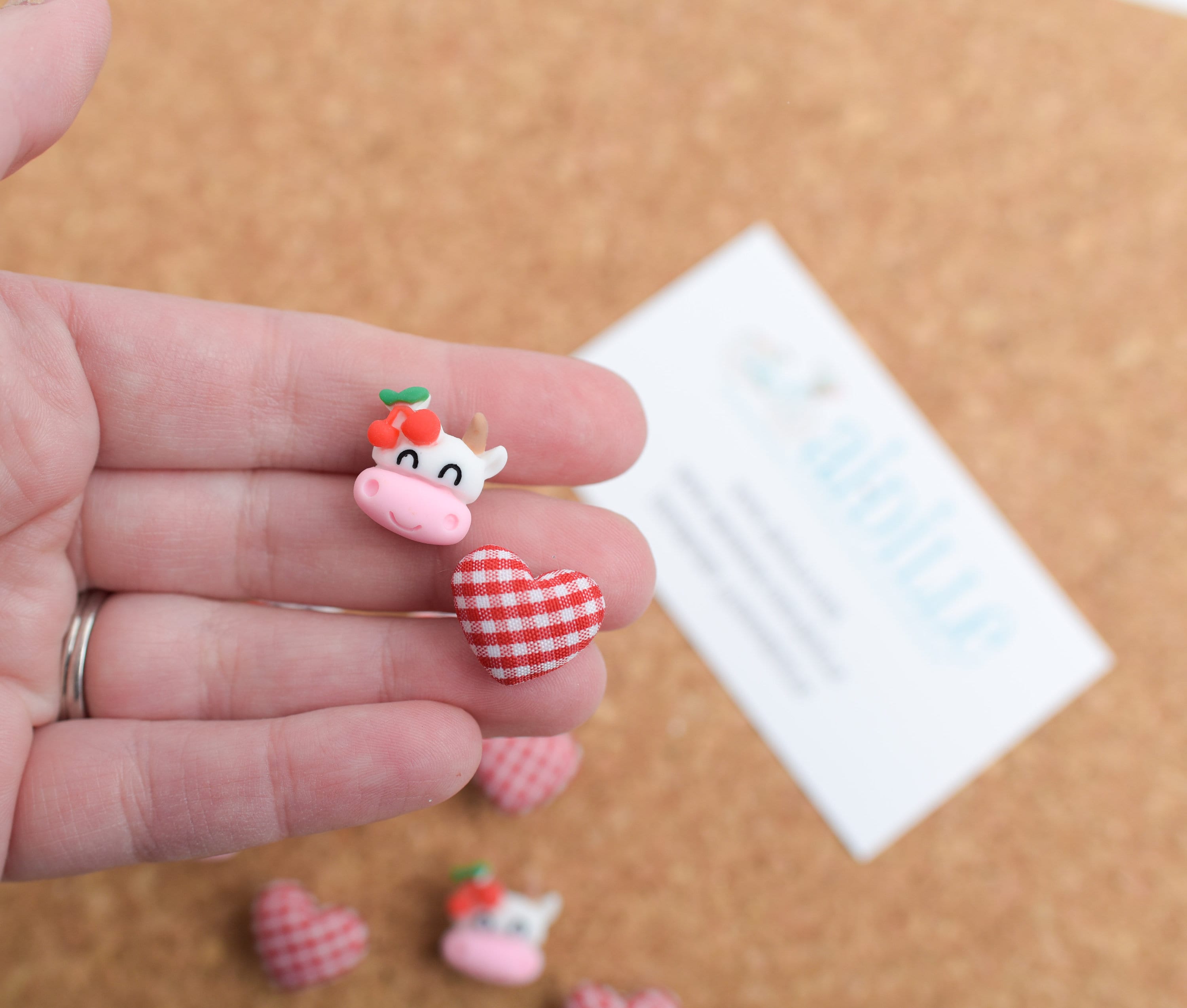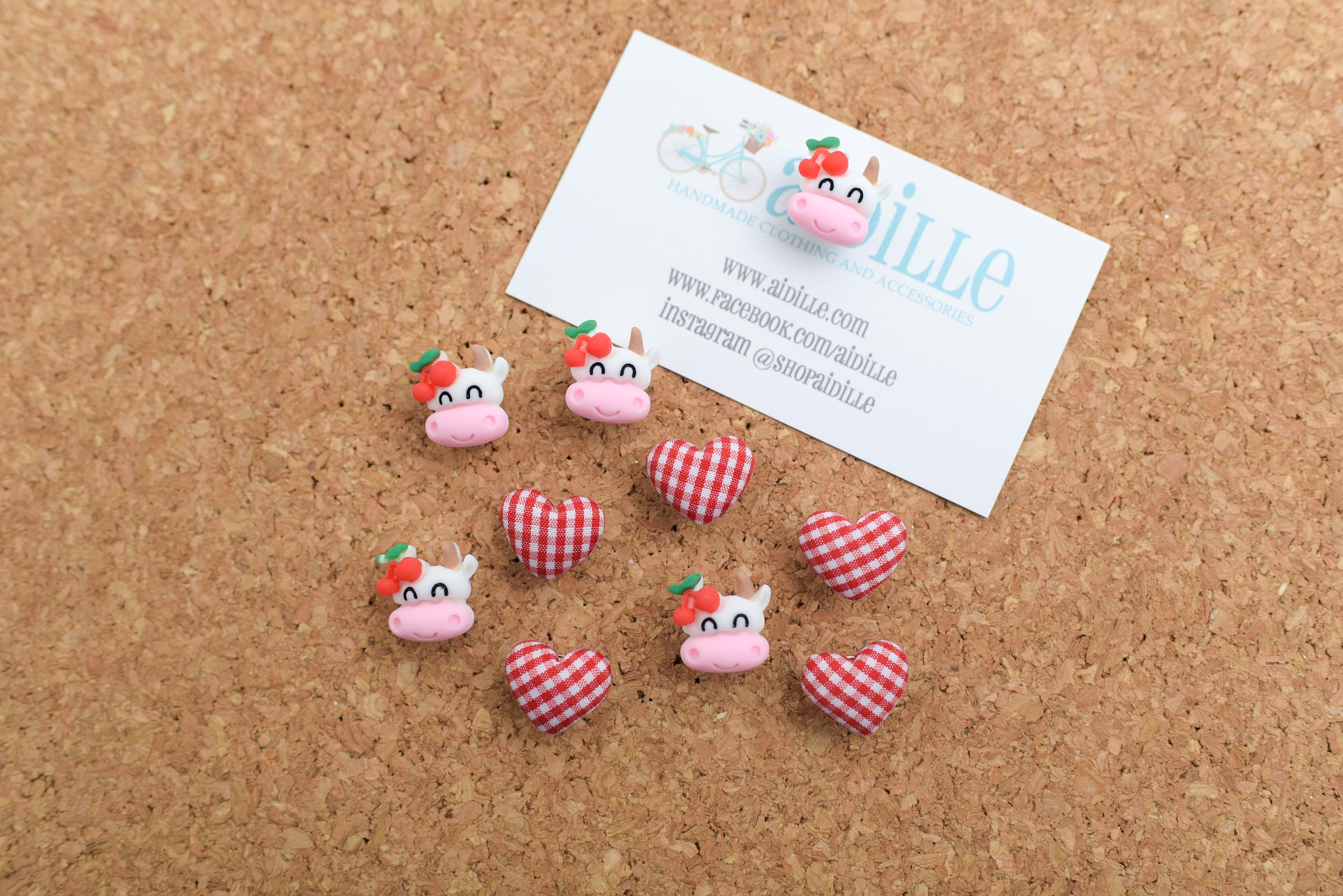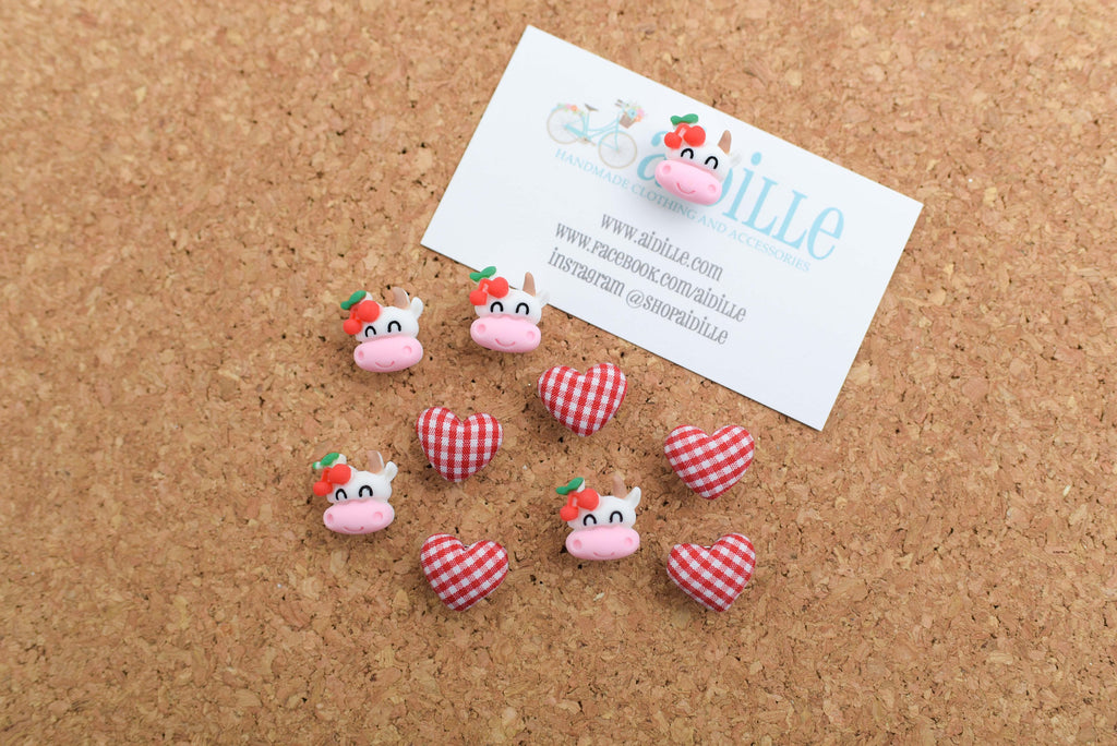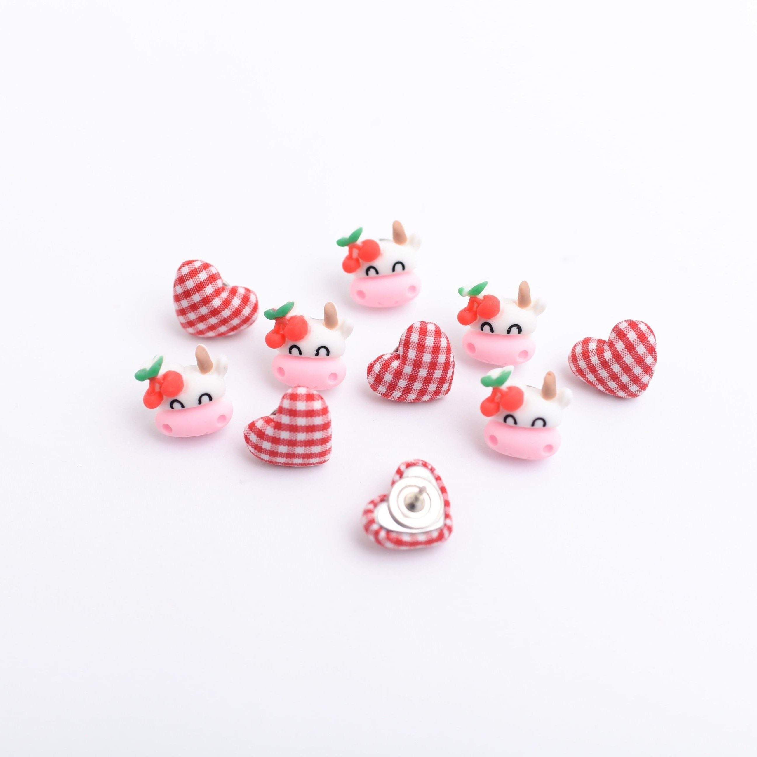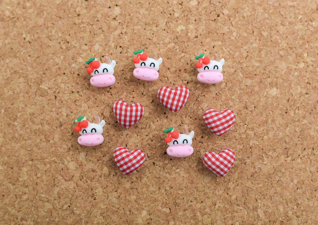 Set of 10: 5 Red and White Gingham Plaid Heart Fabric Button Push Pins and 5 Resin Cherry Cows