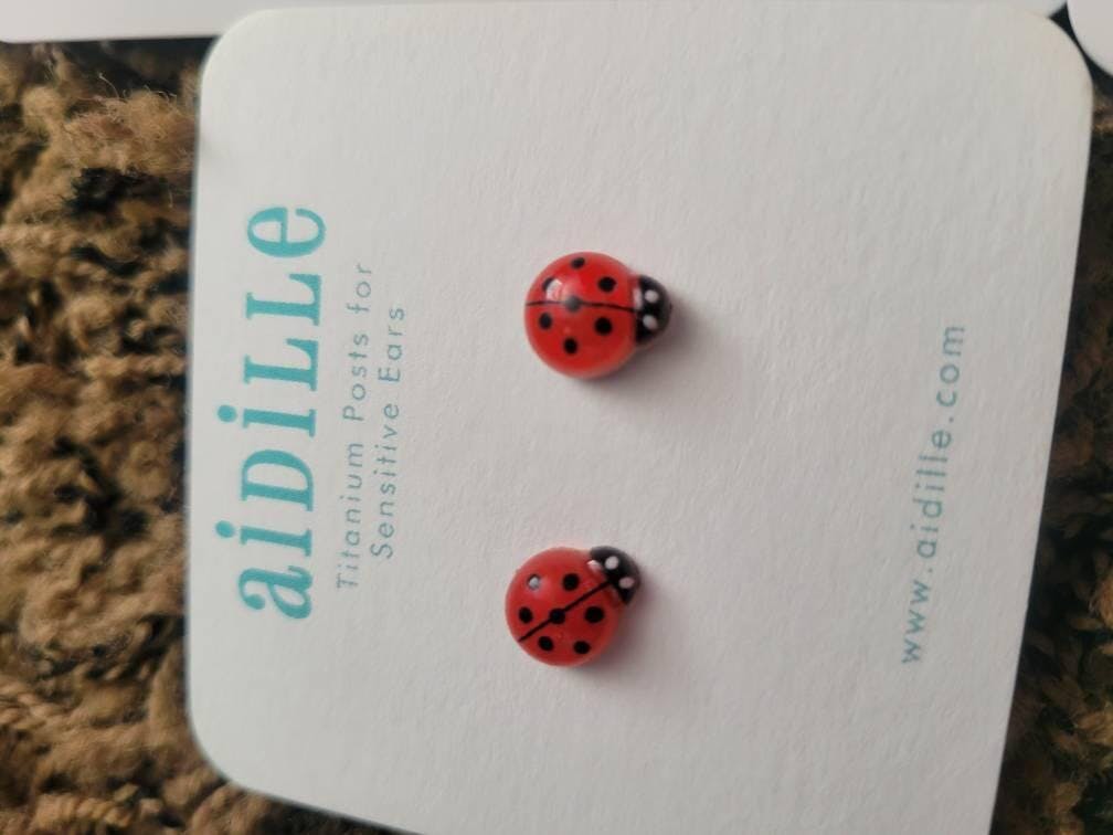 ONE pair of resin lightweight little ladybug earrings Measure a little over 1/4" tall Choose from 8 colors Titanium posts with silicone and stainless steel backings for choice