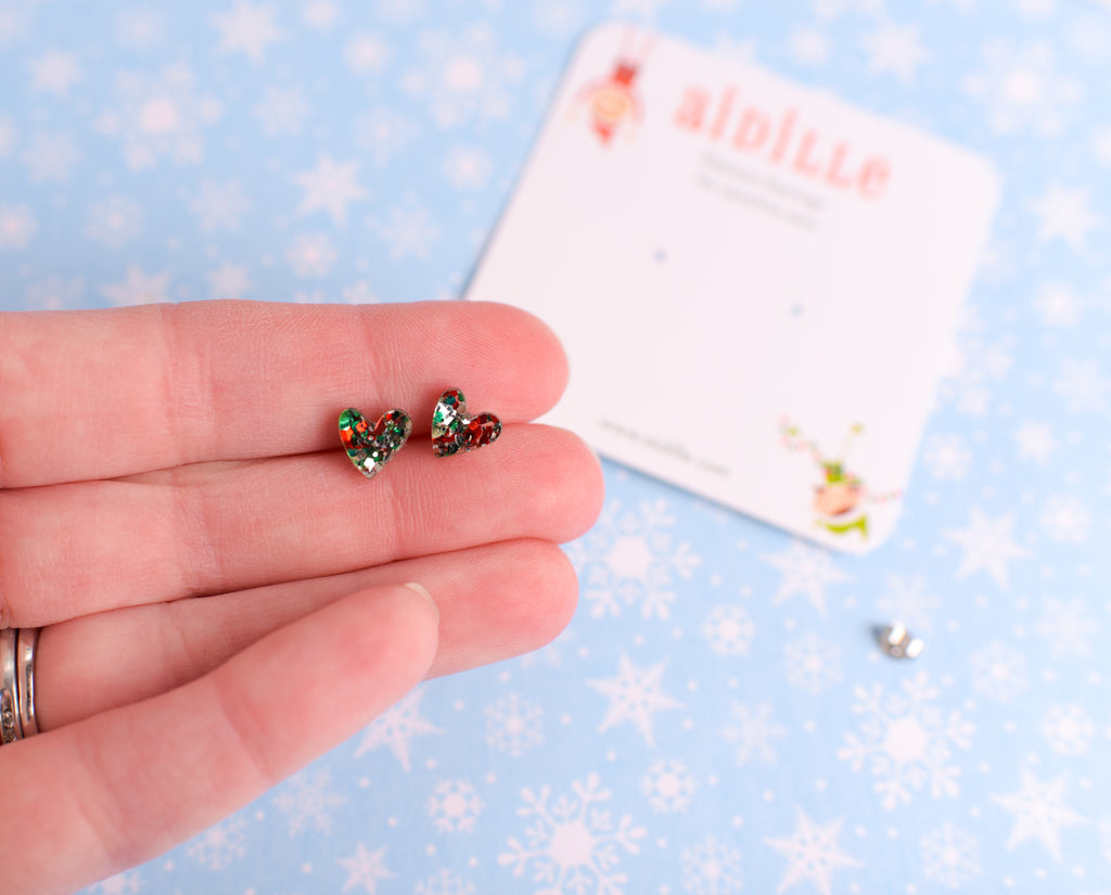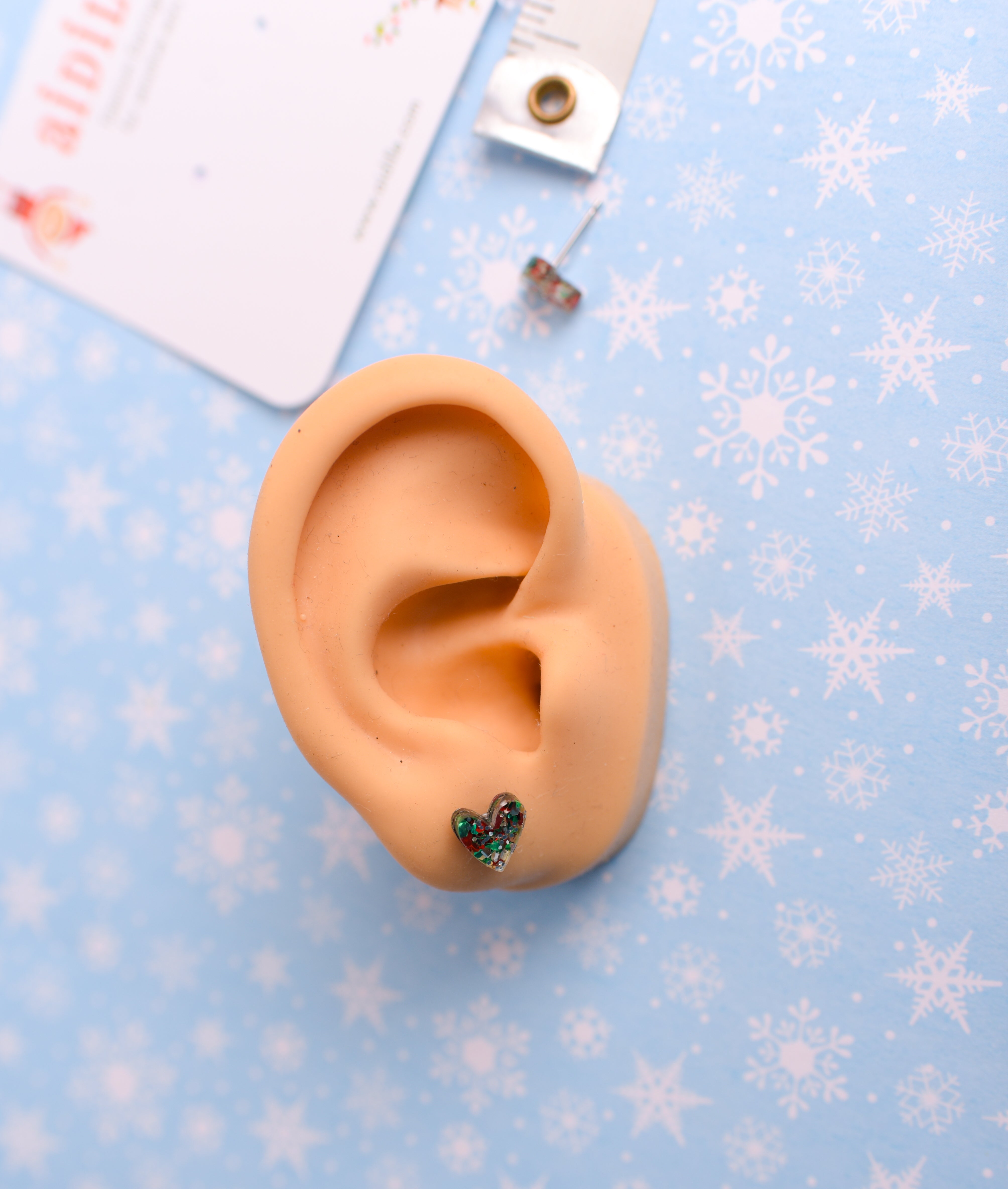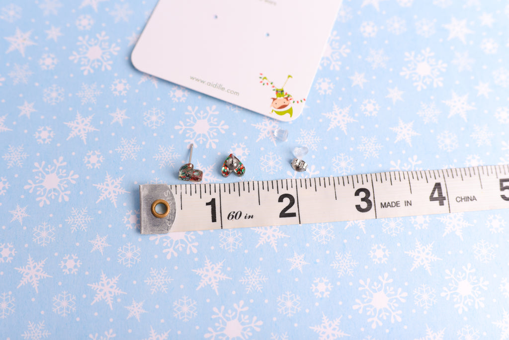 One pair of mini acrylic silver/red/green glitter confetti earrings
