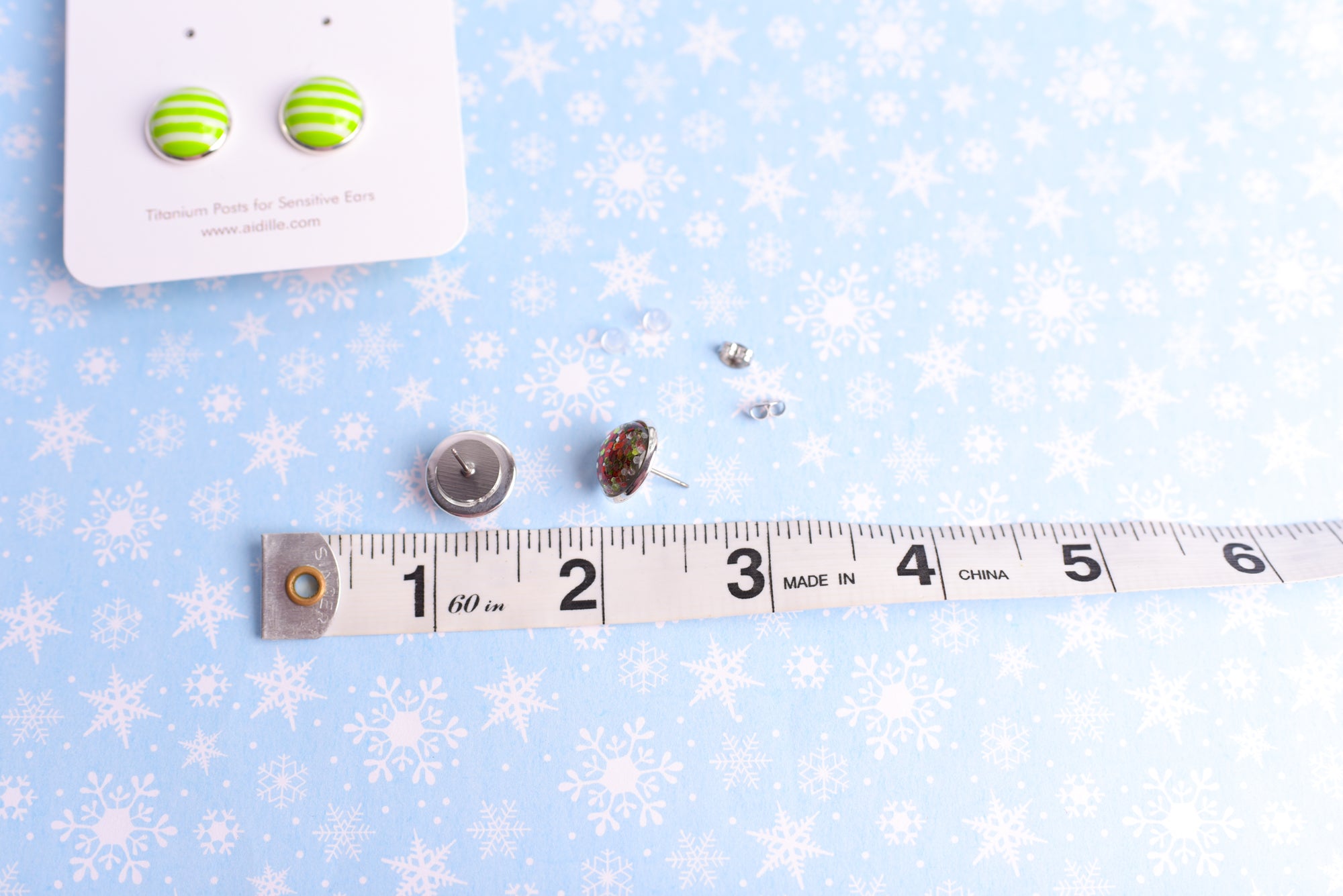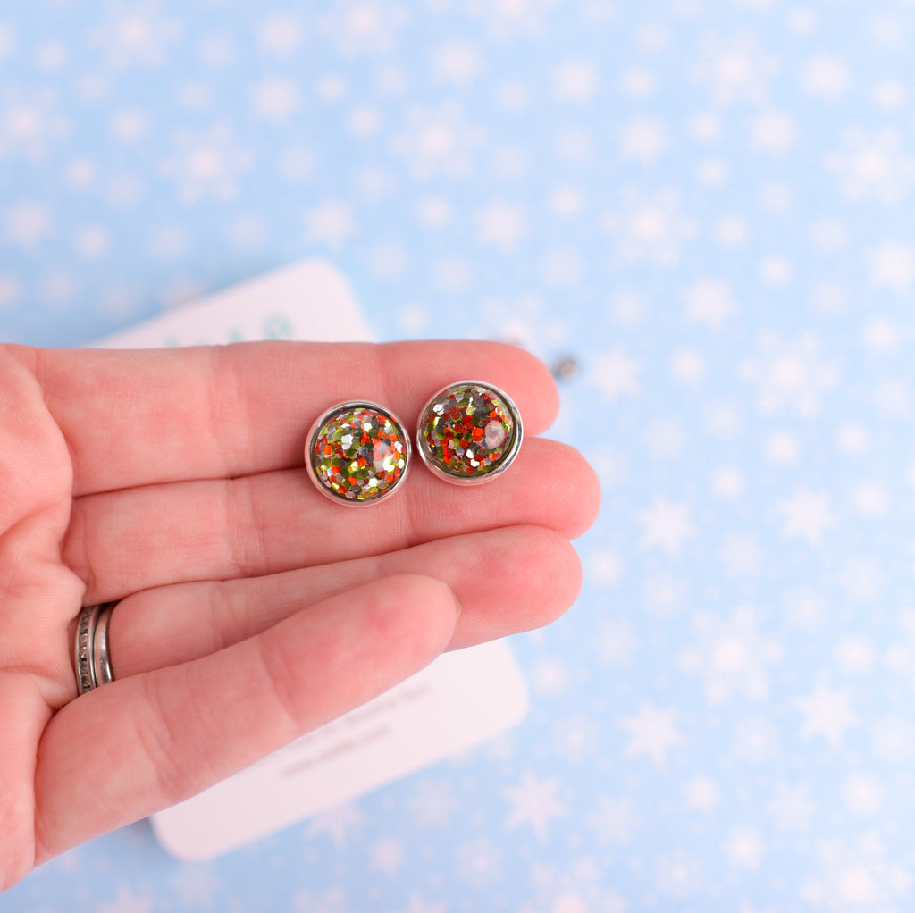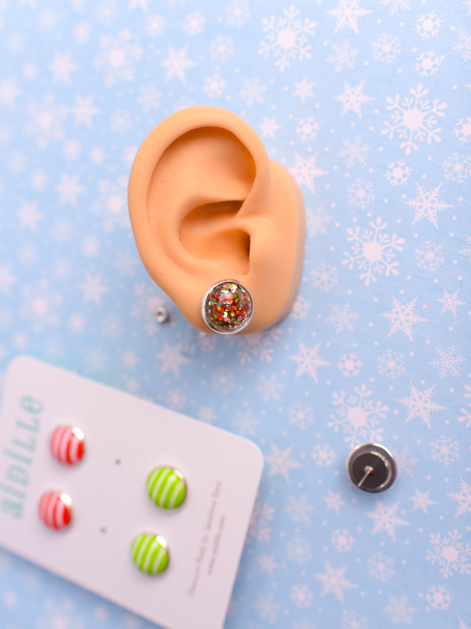 Festive red and lime green stripe and confetti earring multi pack set- perfect for Christmas! Resin charms are placed into stainless steel trays and then securely attached to nickel free, titanium posts that are great for sensitive ears. Earrings measure a little over 12mm, about 1/2". Both silicone and stainless steel backings are included for choice.