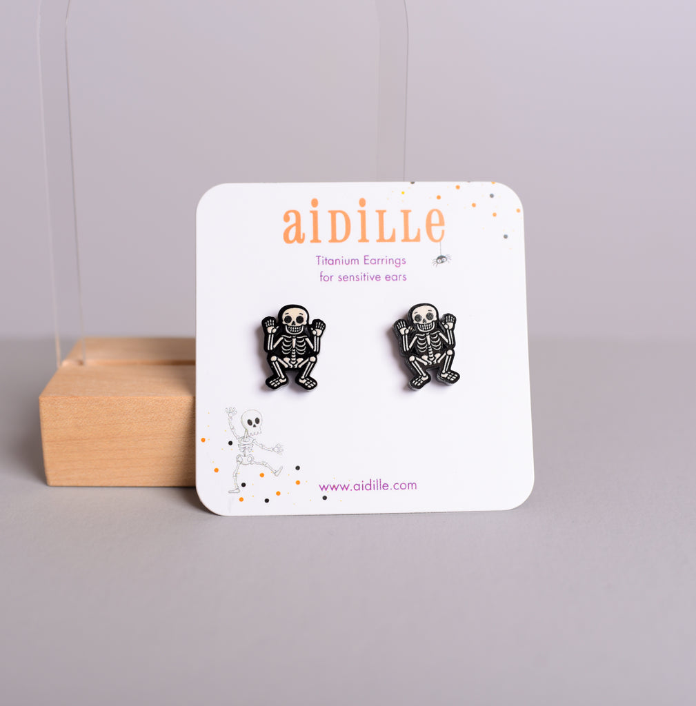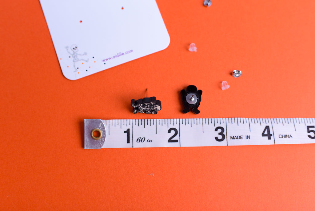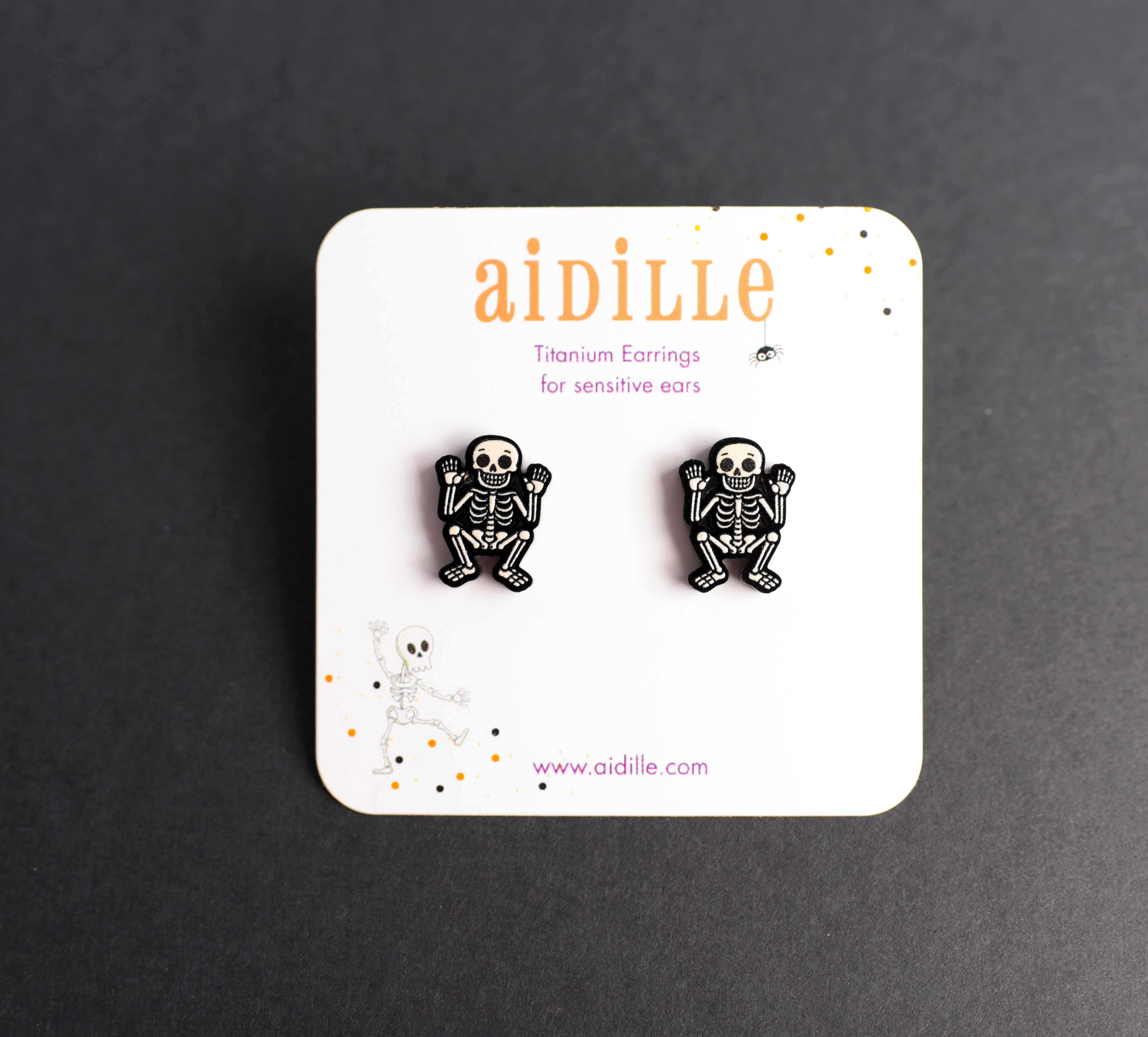 Fun printed acrylic skeleton earrings are made from US sourced charms and hypoallergenic titanium posts. Earrings measure a little over 1/2" tall; silicone model is based off the size of an average woman. Both stainless steel and silicone backings are included for choice. Only ONE pair available on a limited edition Aidille halloween card!