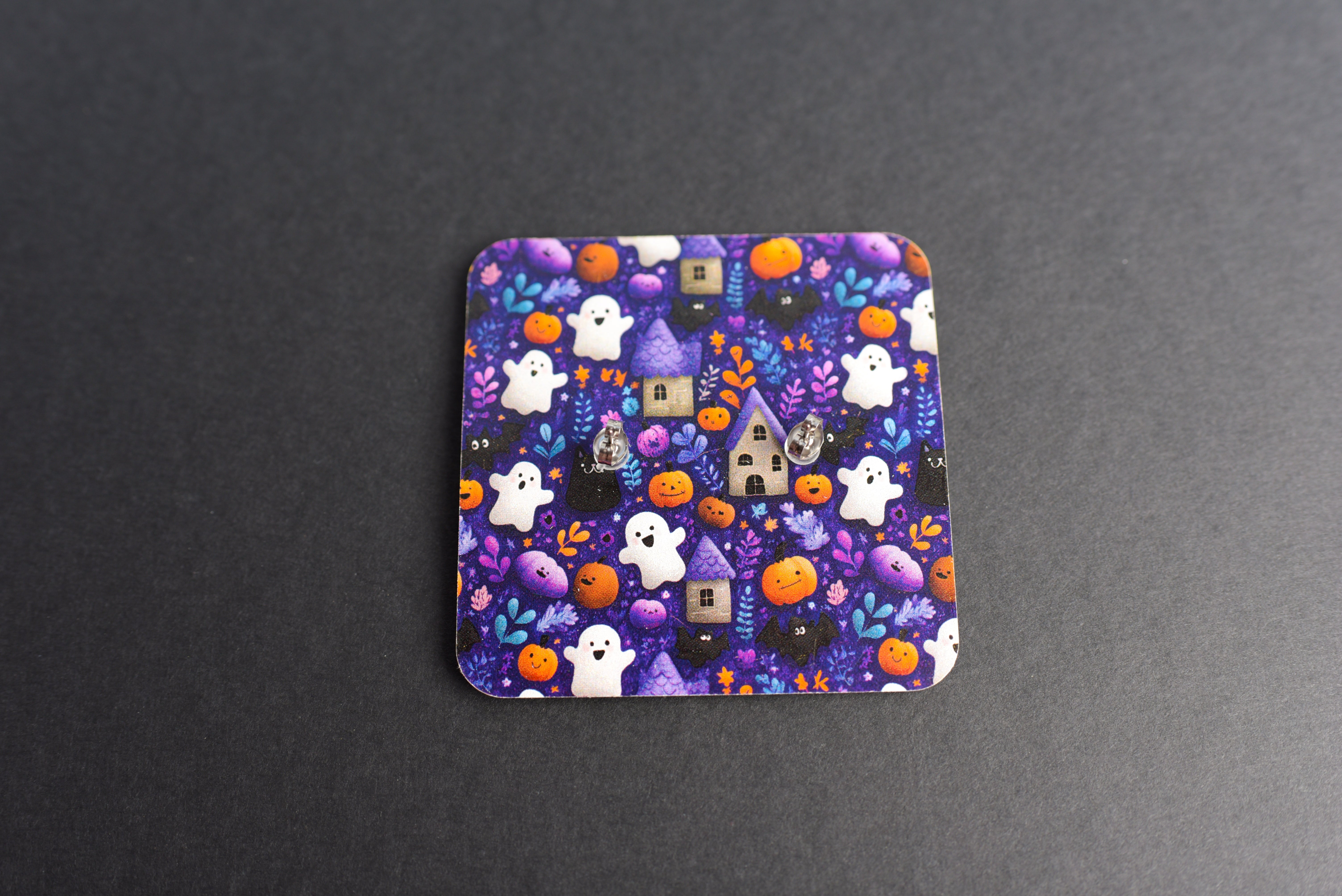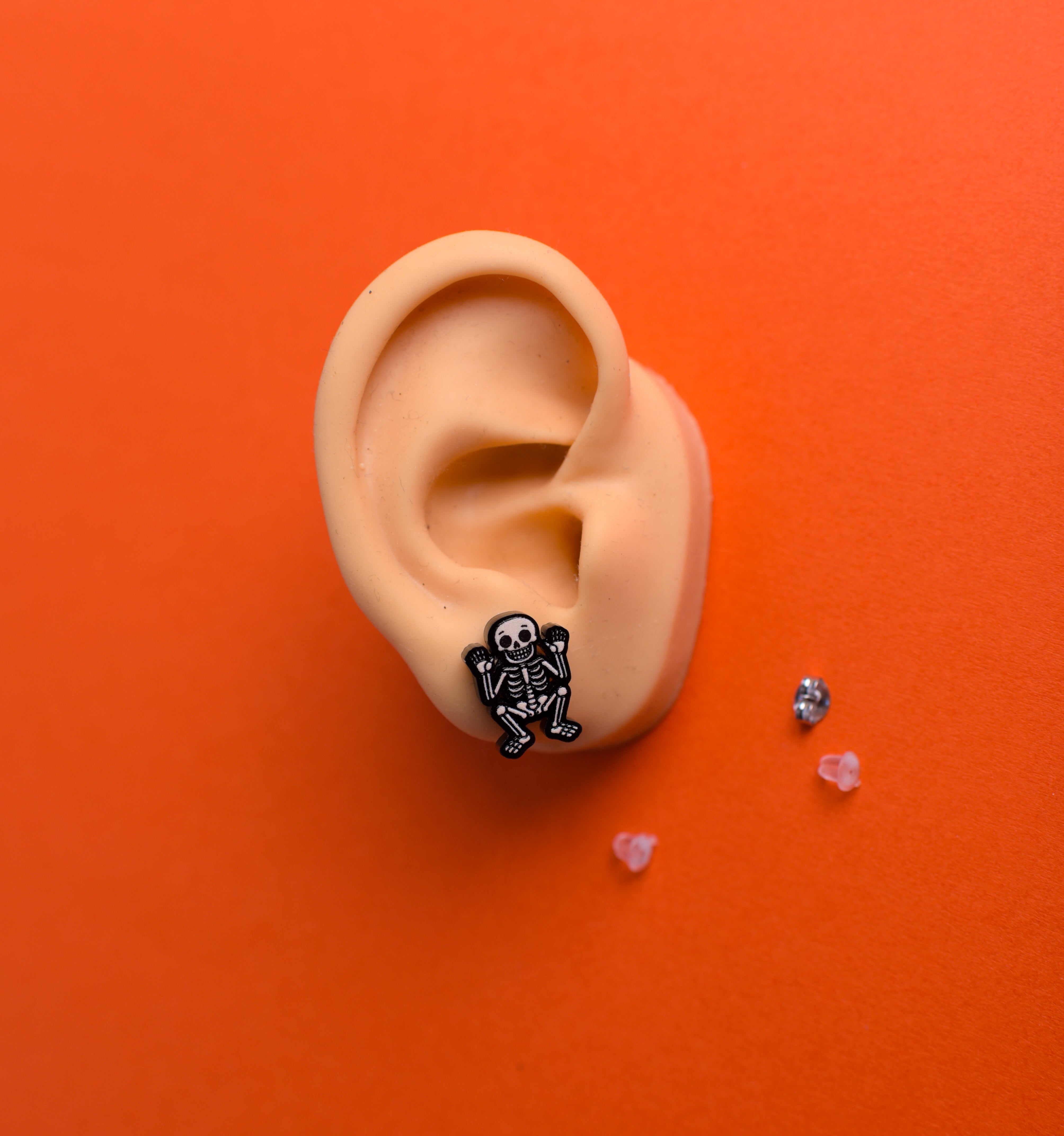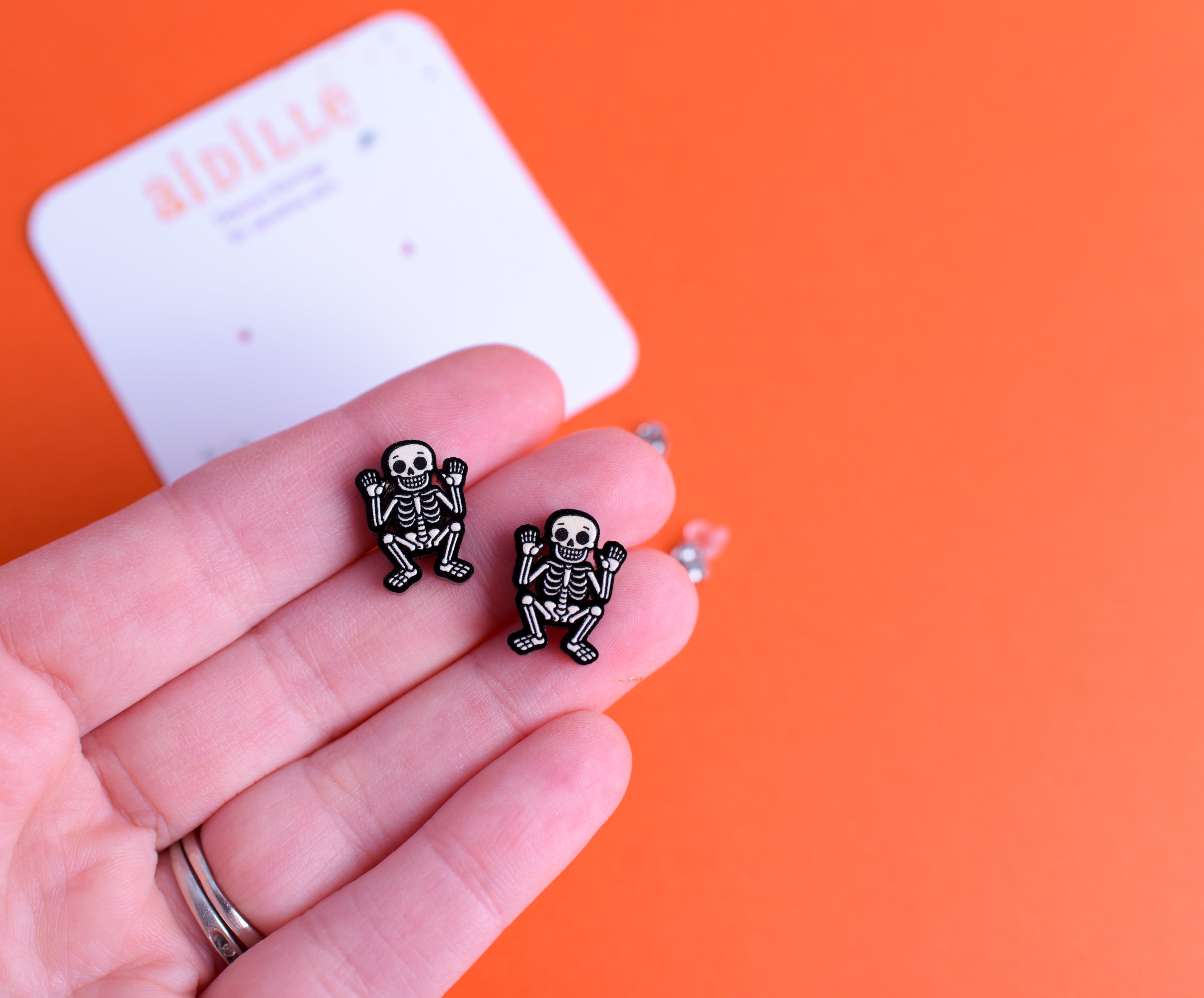 Fun printed acrylic skeleton earrings are made from US sourced charms and hypoallergenic titanium posts. Earrings measure a little over 1/2" tall; silicone model is based off the size of an average woman. Both stainless steel and silicone backings are included for choice. Only ONE pair available on a limited edition Aidille halloween card!