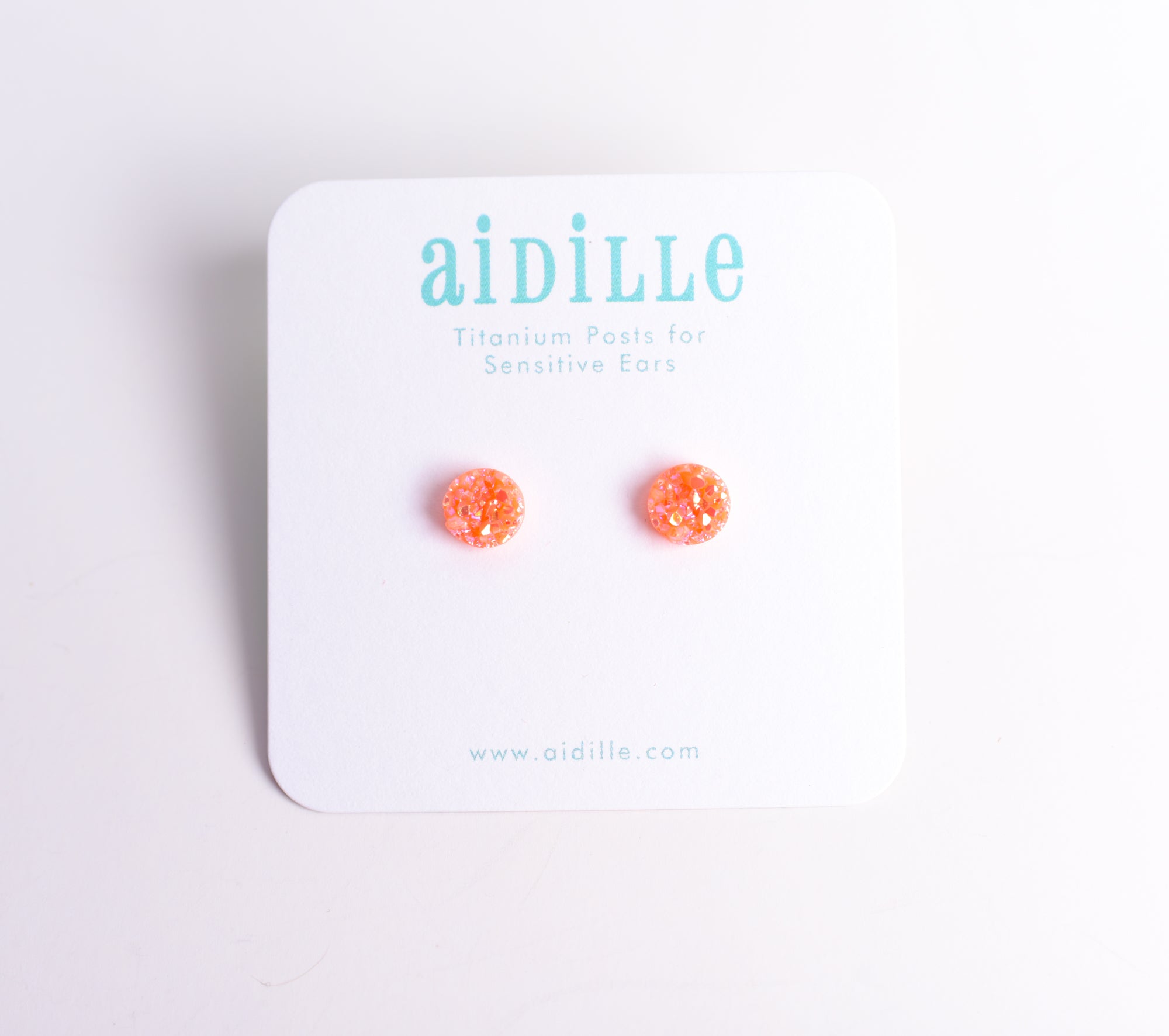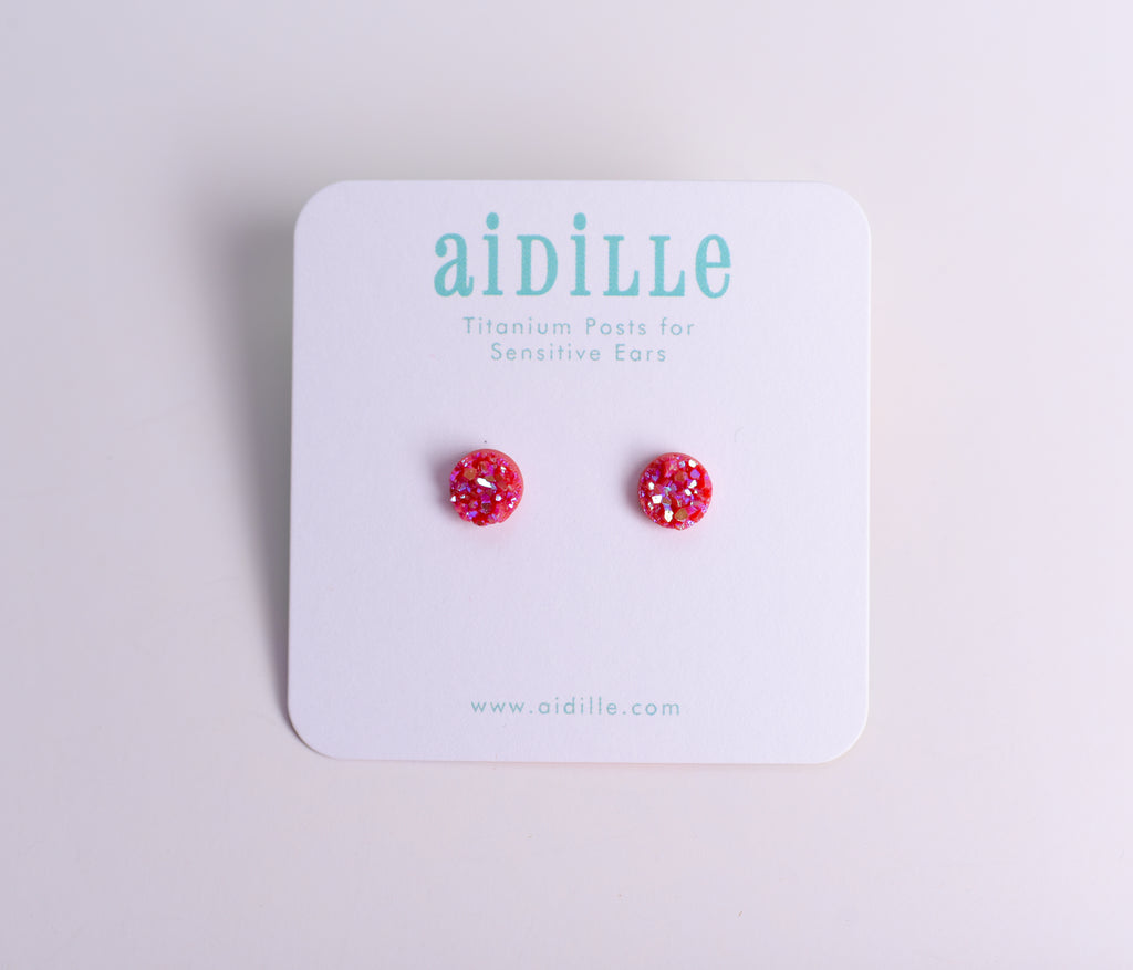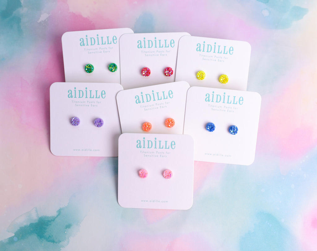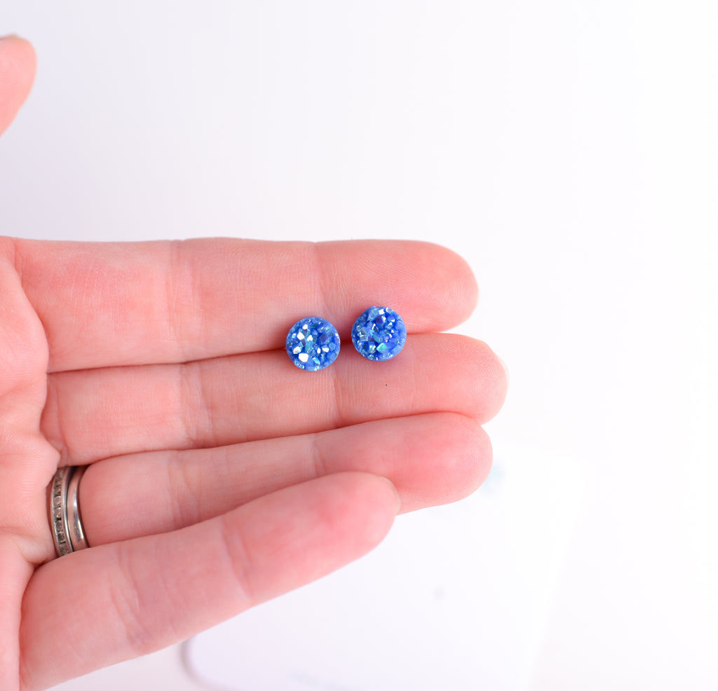 Sparkly little faux druzy earrings in a dainty 8mm size; choose from seven colors! Earrings are perfect for adults and kids and feature sparkly resin charms attached to hypoallergenic titanium posts for sensitive ears. Earrings include both stainless steel and silicone backings for choice.