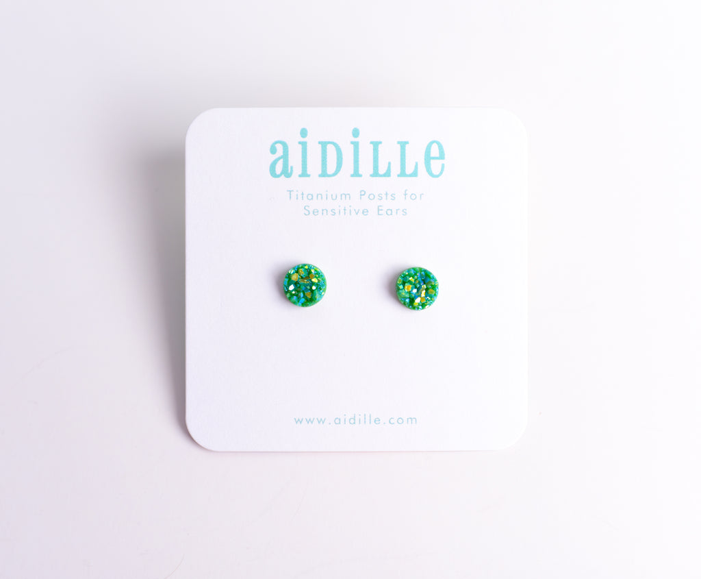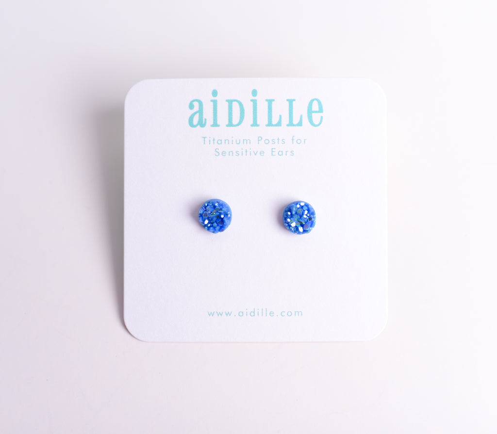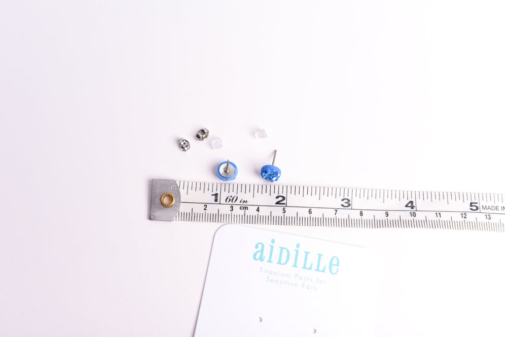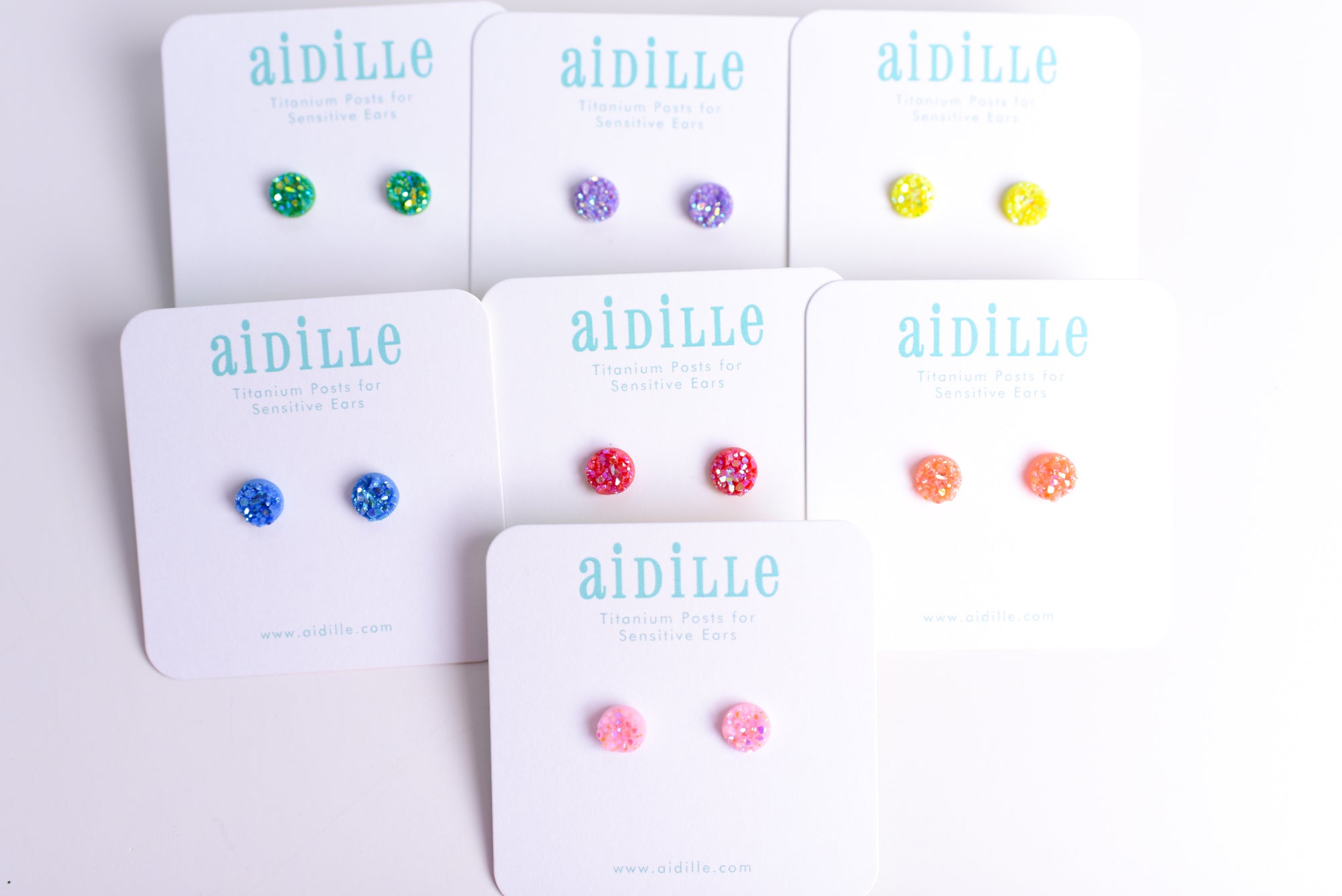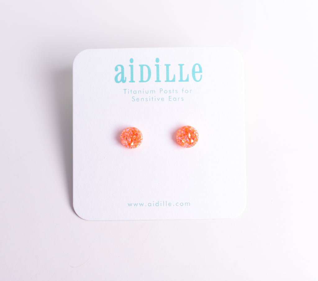 Sparkly little faux druzy earrings in a dainty 8mm size; choose from seven colors! Earrings are perfect for adults and kids and feature sparkly resin charms attached to hypoallergenic titanium posts for sensitive ears. Earrings include both stainless steel and silicone backings for choice.