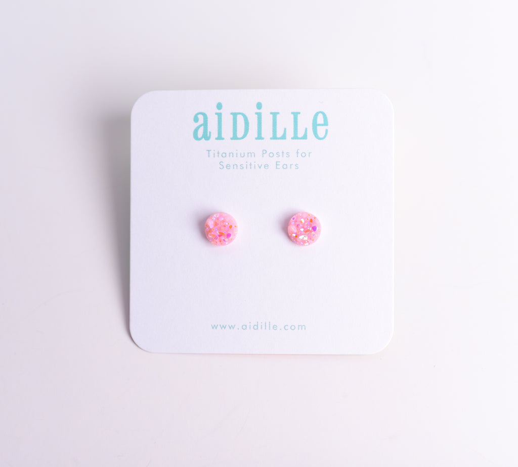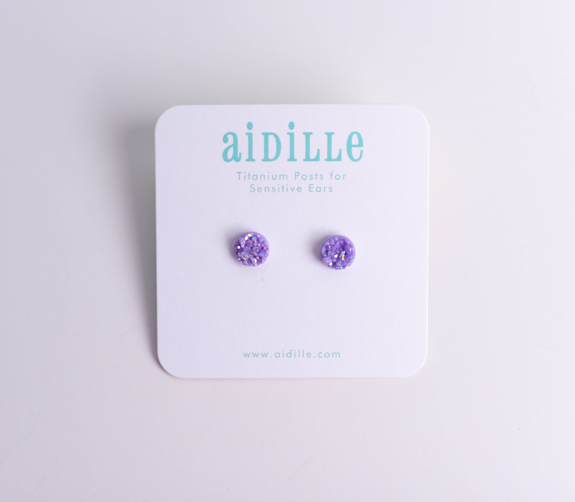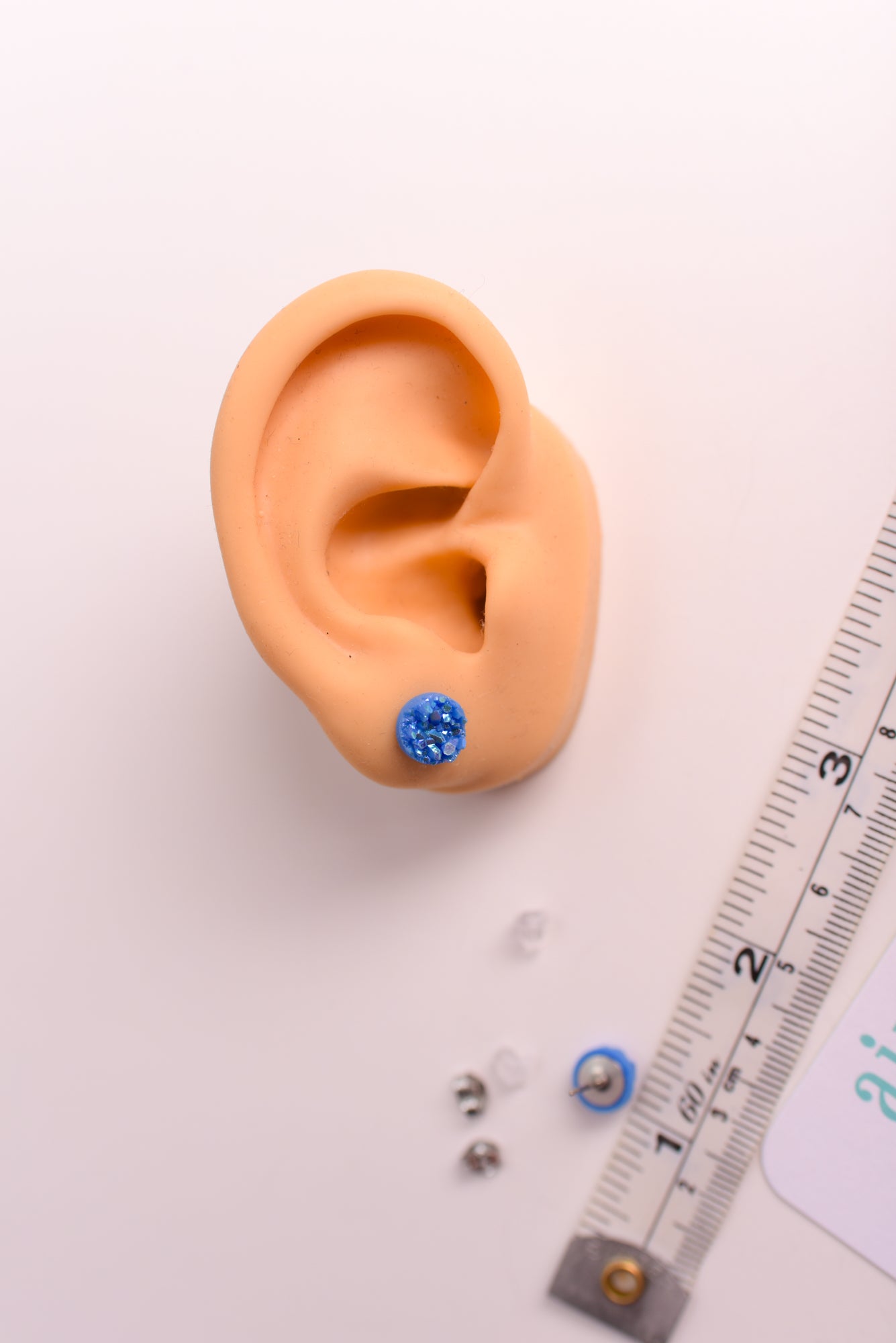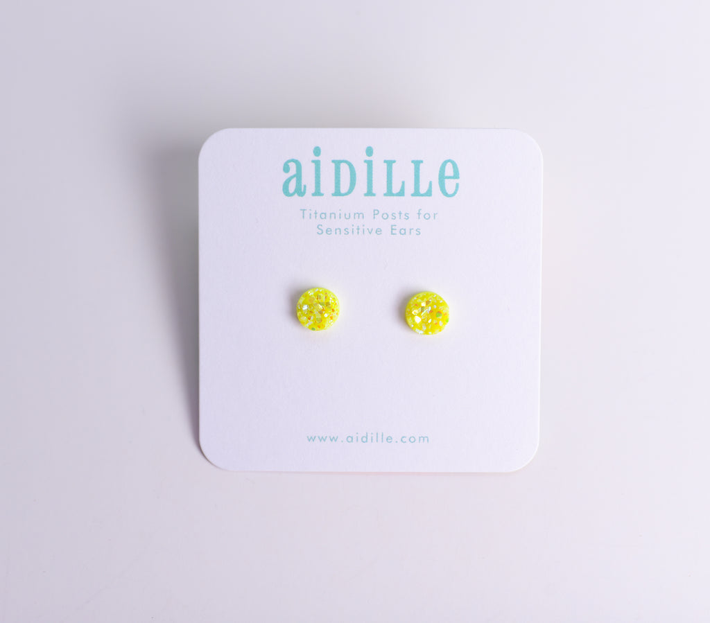 Sparkly little faux druzy earrings in a dainty 8mm size; choose from seven colors! Earrings are perfect for adults and kids and feature sparkly resin charms attached to hypoallergenic titanium posts for sensitive ears. Earrings include both stainless steel and silicone backings for choice.