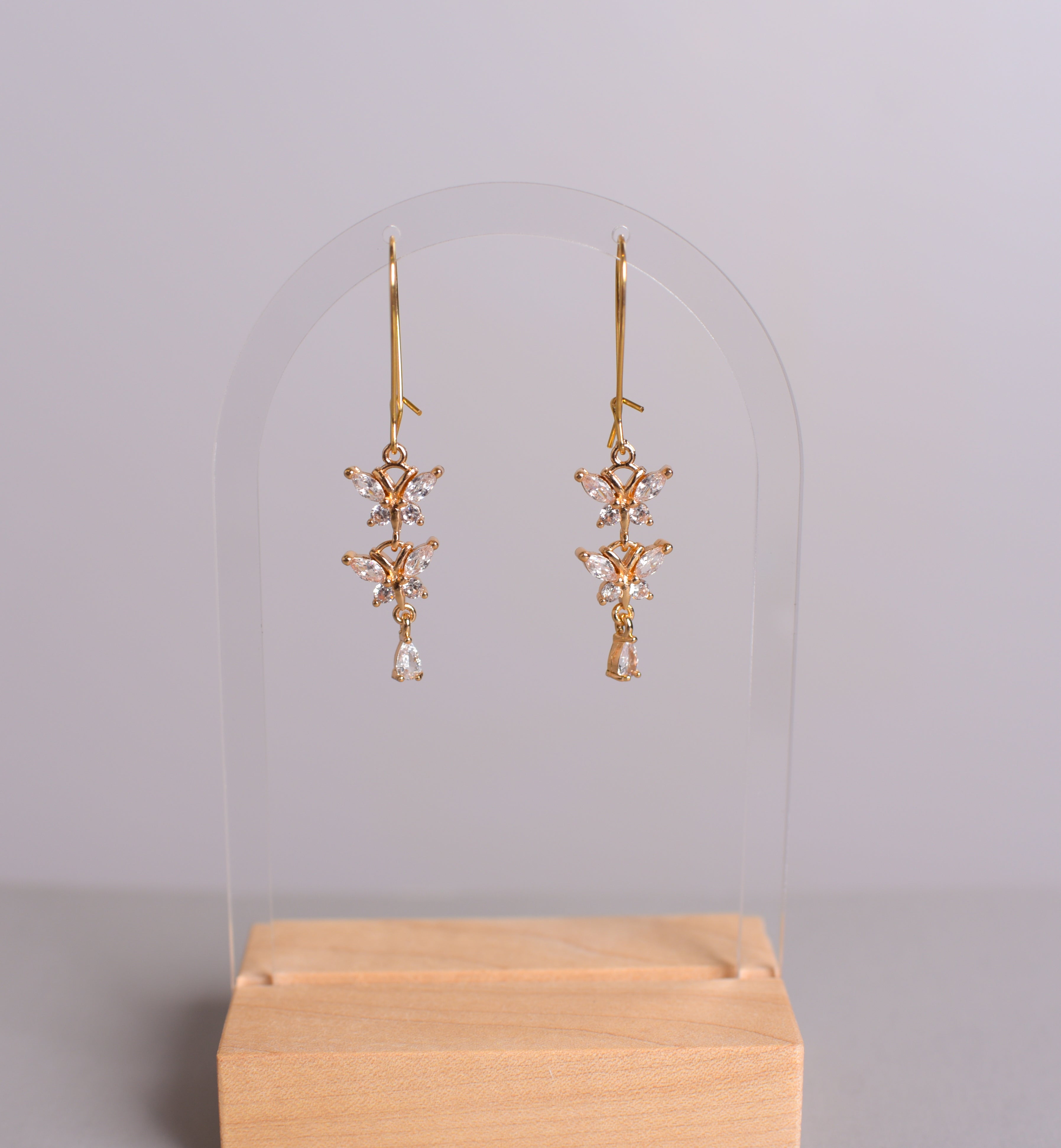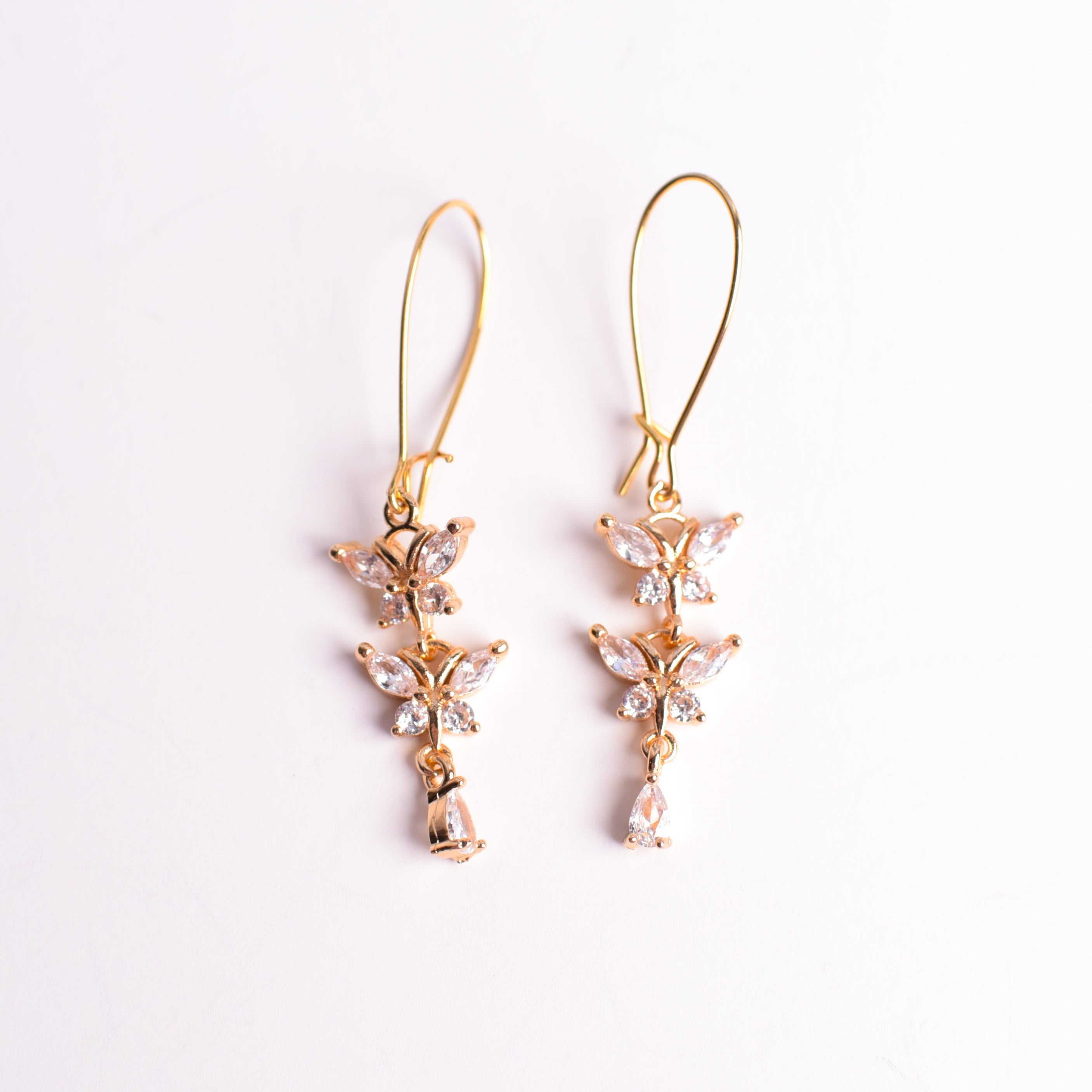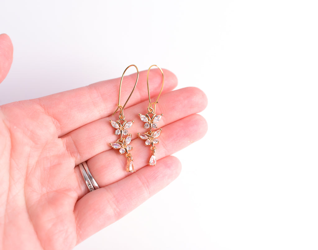 One pair of sparkly cubic zirconia butterfly dangle earrings in gold