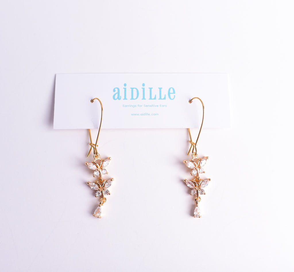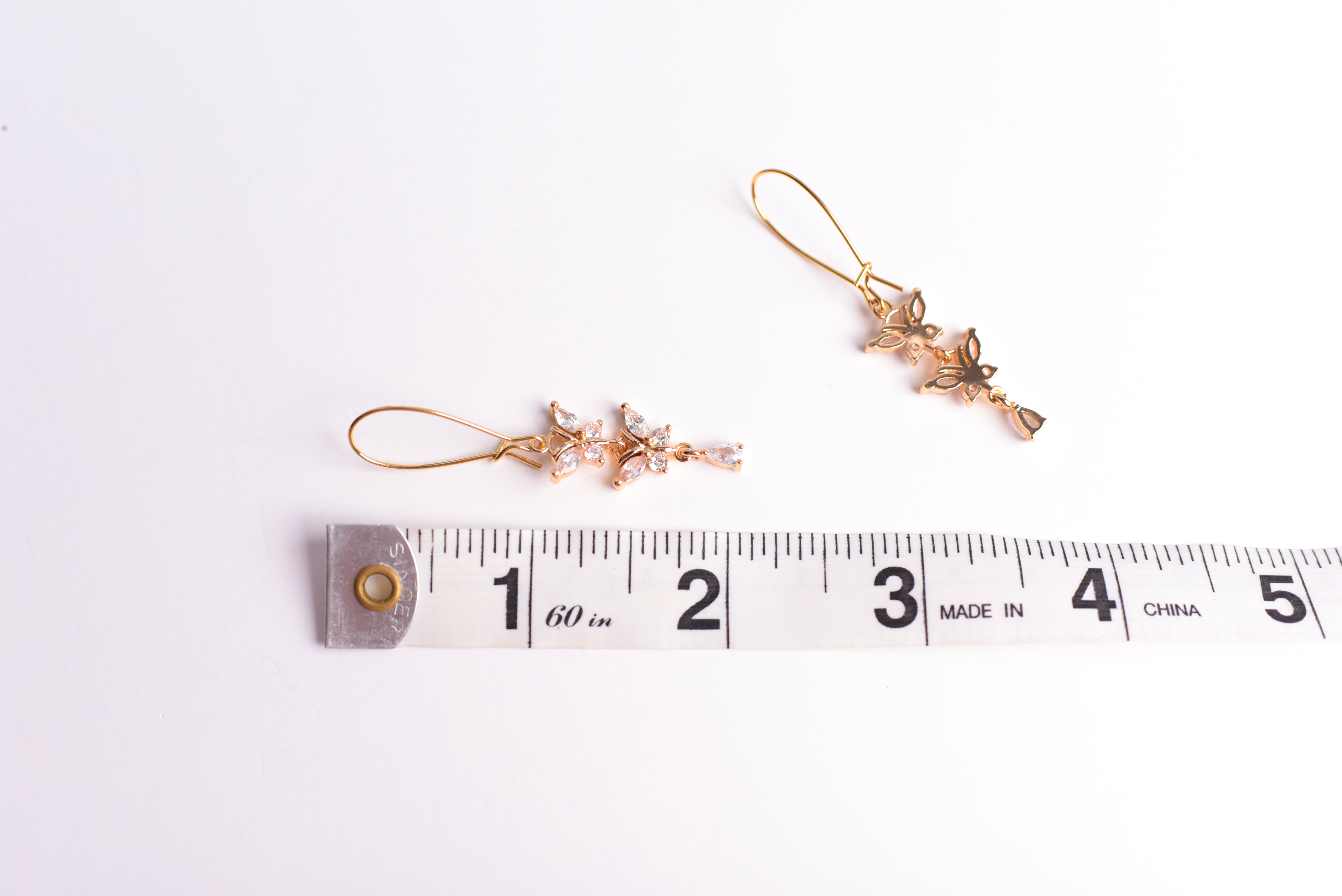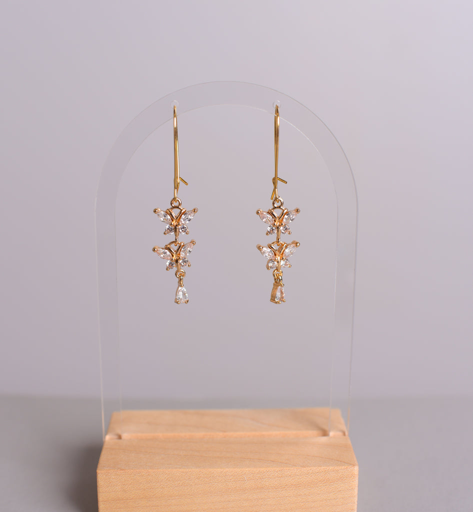 One pair of sparkly cubic zirconia butterfly dangle earrings in gold
