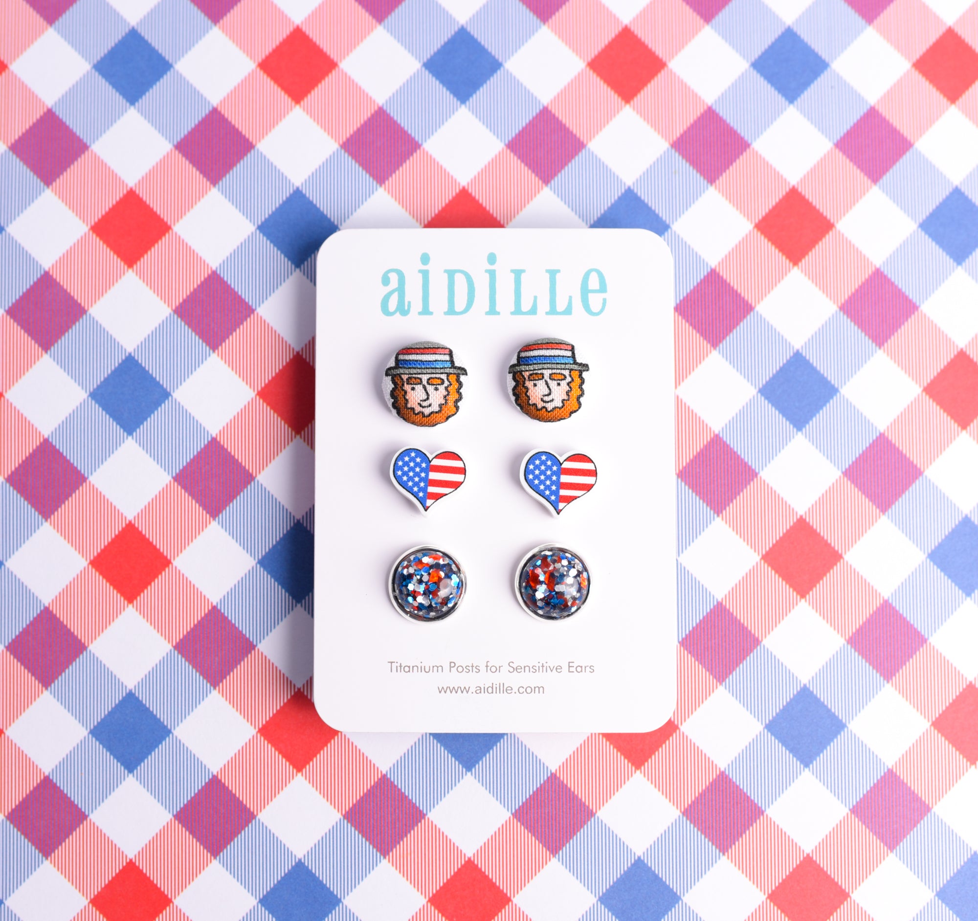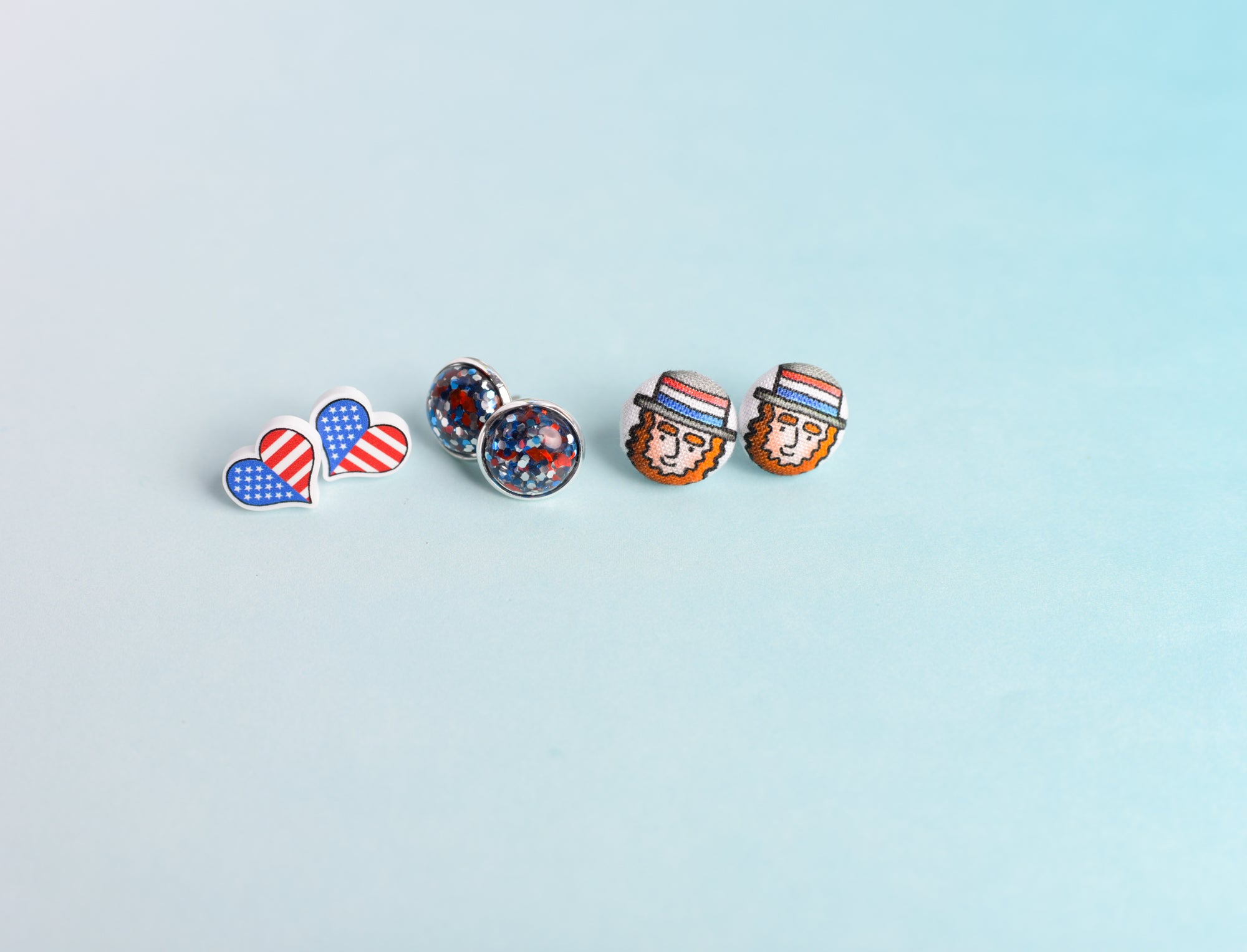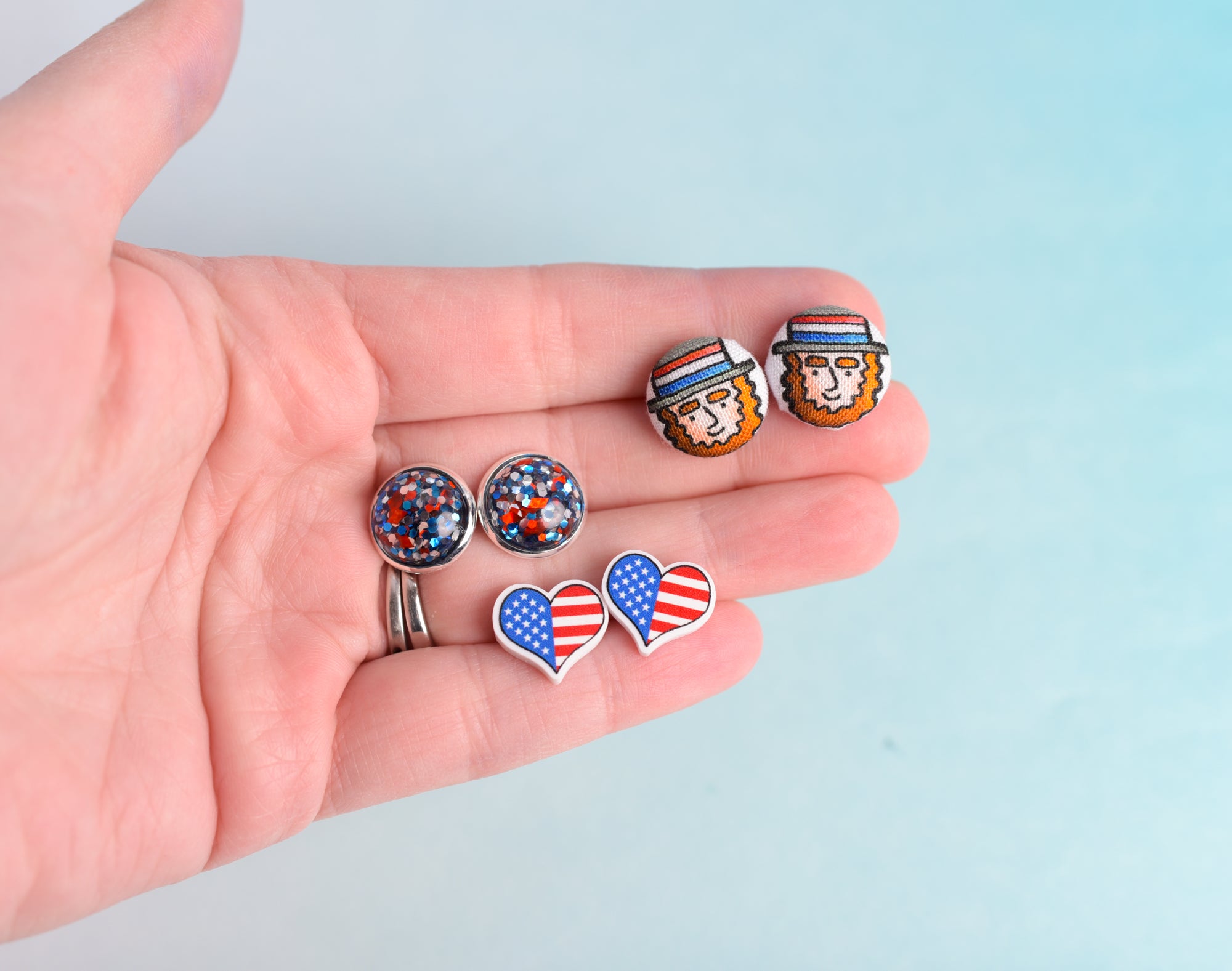 This fun earring multi pack trio features handmade fabric button Uncle Sam studs, acrylic stars and stripes heart studs, and confetti red, white, and blue charms placed into stainless steel metal trays with studs. Earrings vary in size around 1/2" +/- and are made right here in the USA! Earrings are made using titanium posts- great for even the most sensitive of ears. Both silicone and stainless steel backings are included for choice.