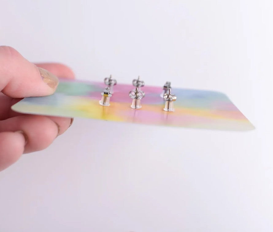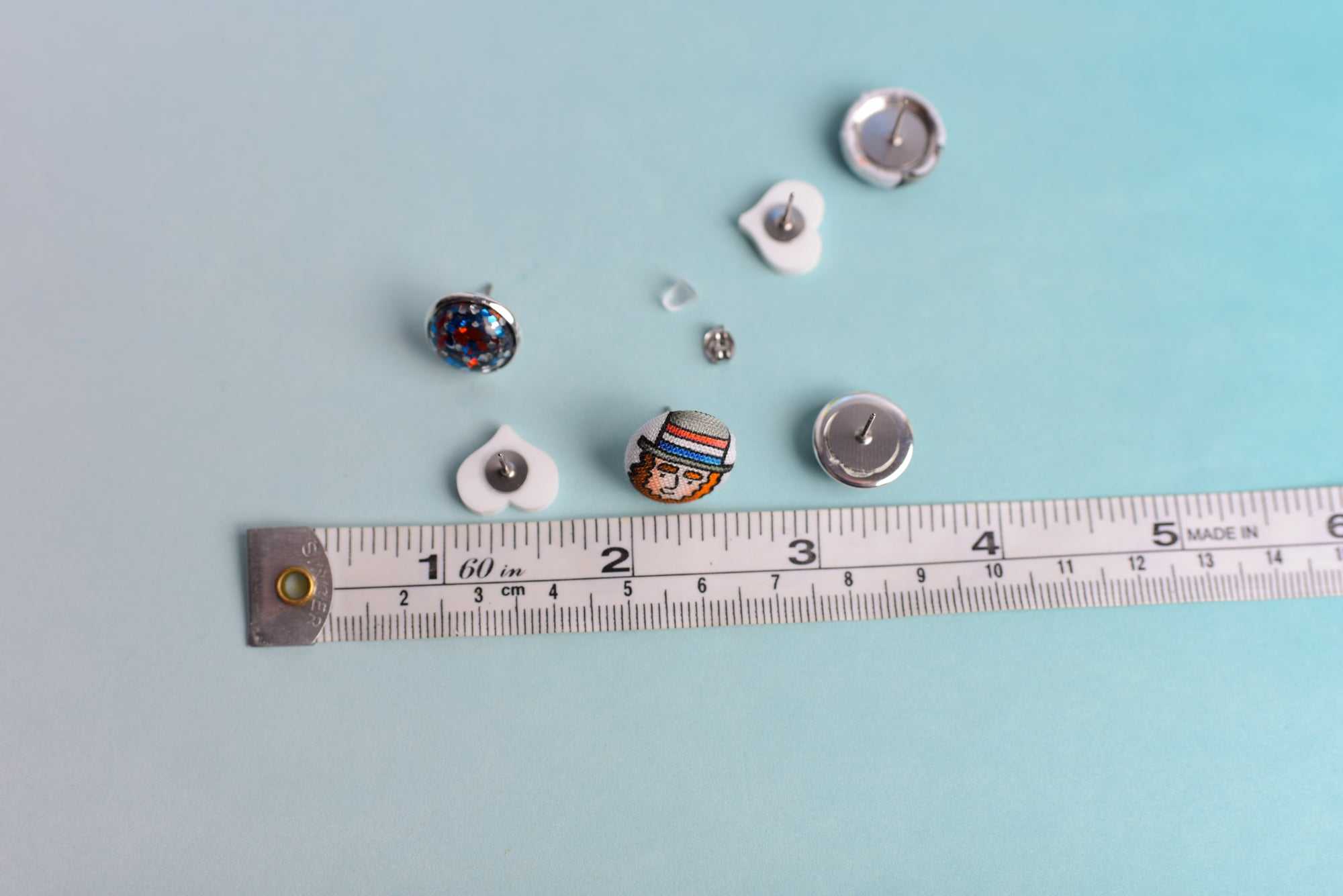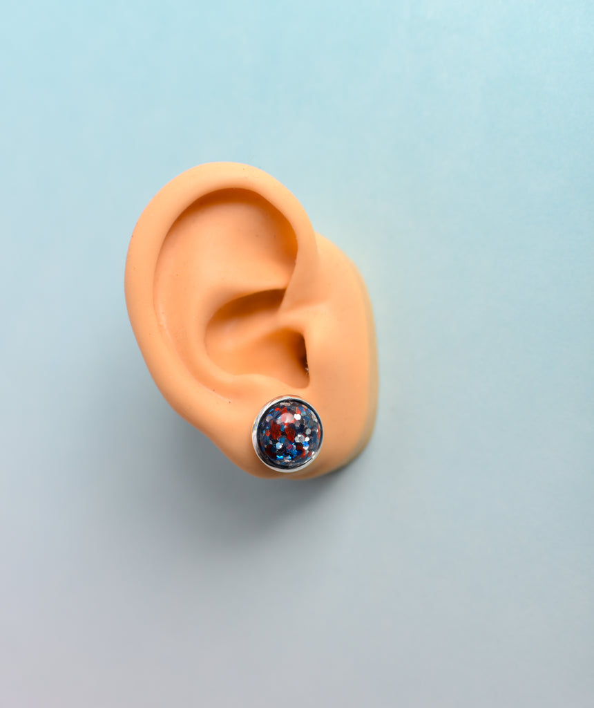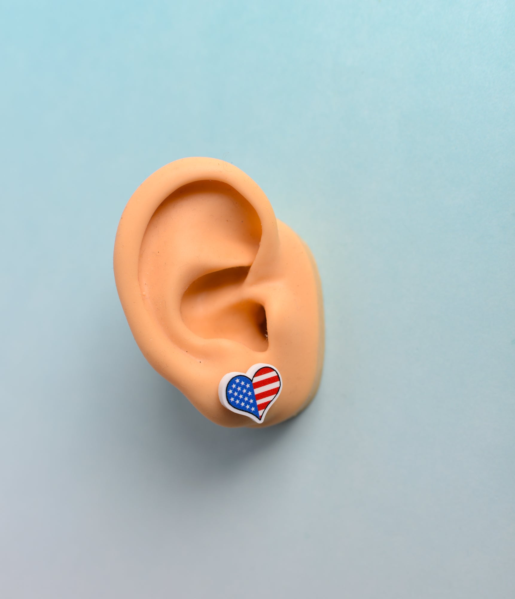This fun earring multi pack trio features handmade fabric button Uncle Sam studs, acrylic stars and stripes heart studs, and confetti red, white, and blue charms placed into stainless steel metal trays with studs. Earrings vary in size around 1/2" +/- and are made right here in the USA! Earrings are made using titanium posts- great for even the most sensitive of ears. Both silicone and stainless steel backings are included for choice.