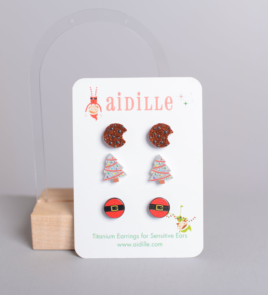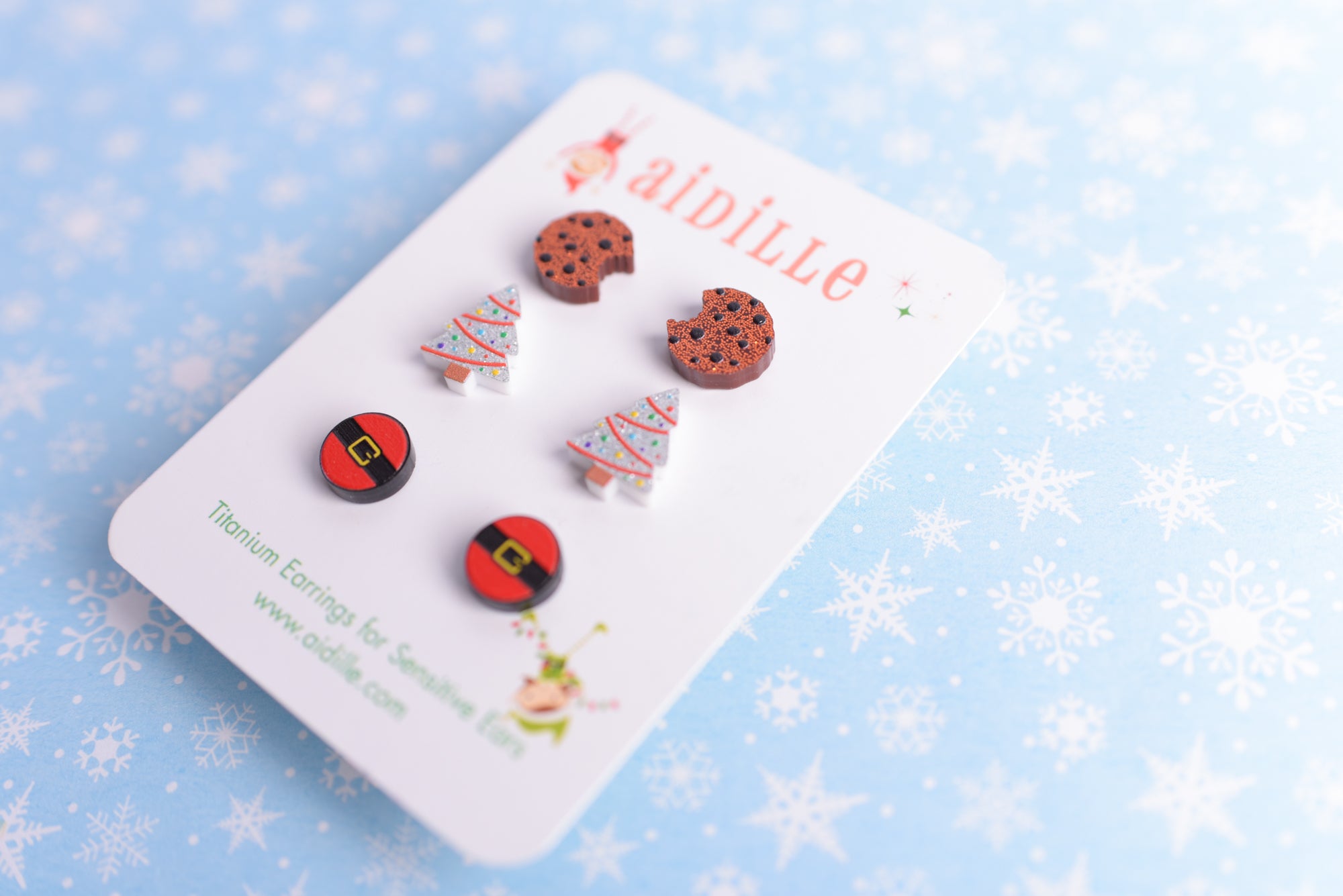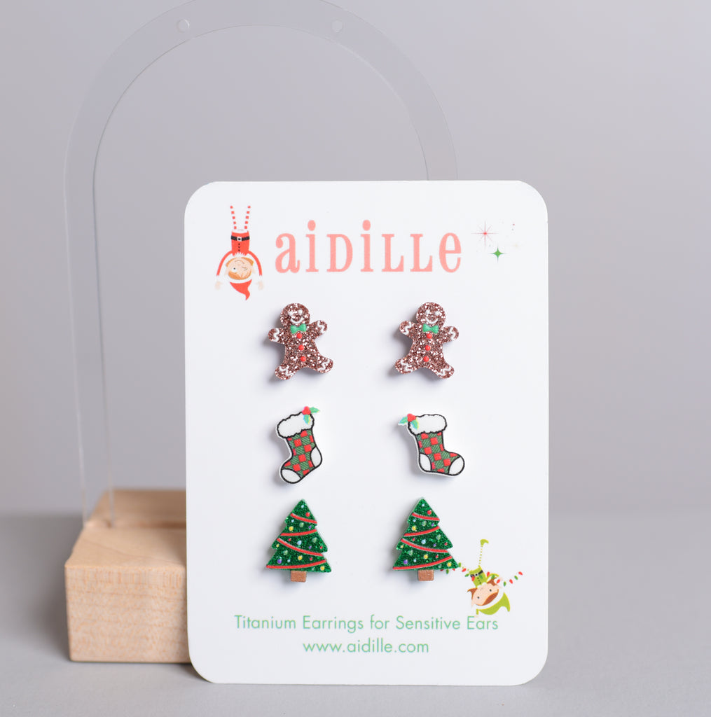 Made from US made laser cut acrylic charms, hypoallergenic titanium studs, and both silicone AND stainless steel backings for choice. Presented on a limited edition Aidille holiday earring card- perfect for gift giving!