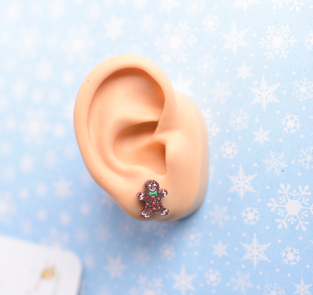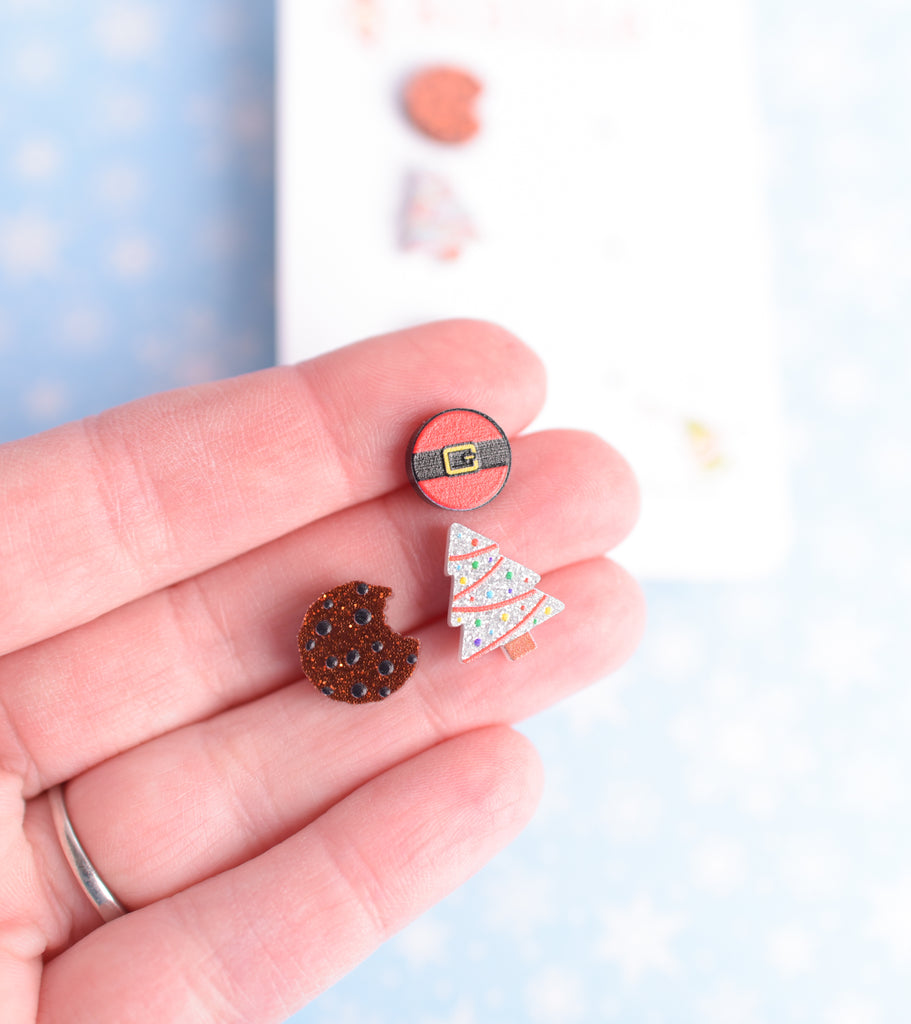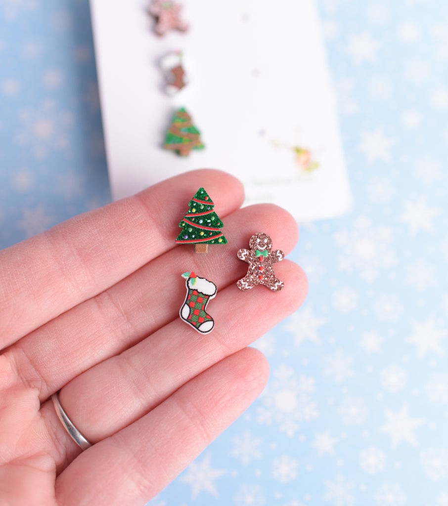Choose from two fun acrylic novelty earring Christmas multi pack sets; either gingerbread men, stockings, and a green glitter tree OR a chocolate chip cookie, silver glitter tree, and santa's belt. Earrings vary in size but most measure about 1/2" tall +/-. See all images for scale with a ruler, in a hand, and on a silicone ear model that is based off the size of an average woman. Only ONE of each set are available.