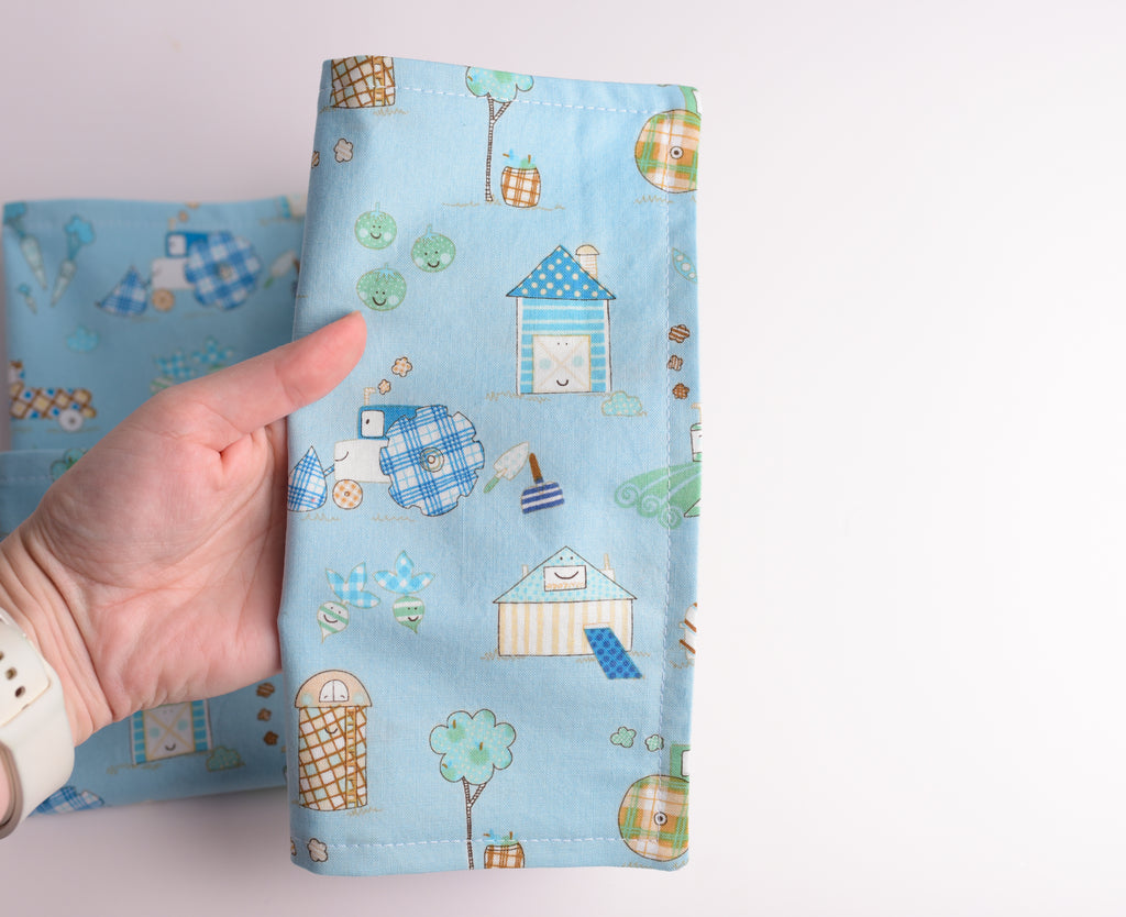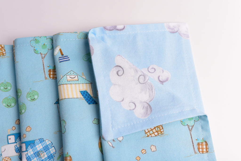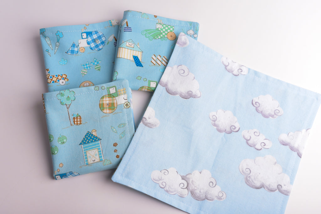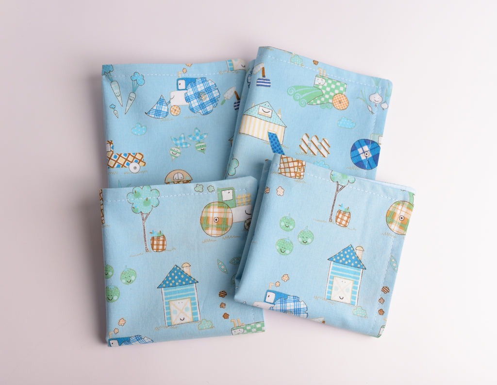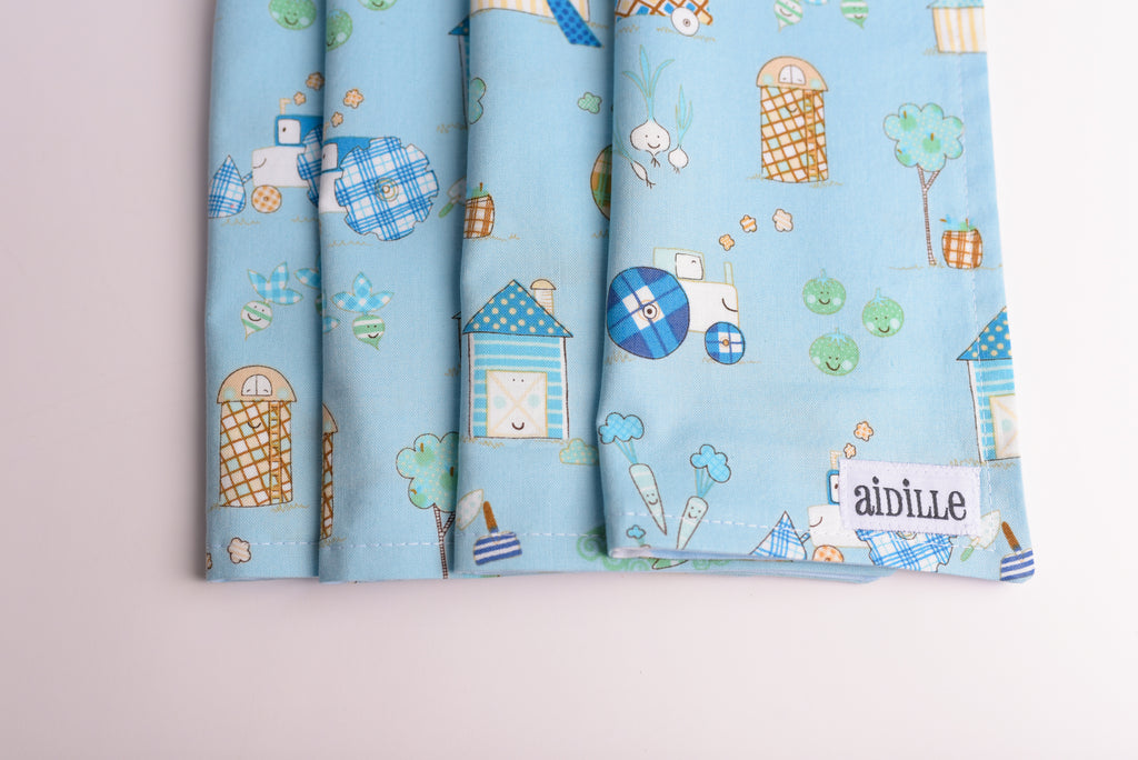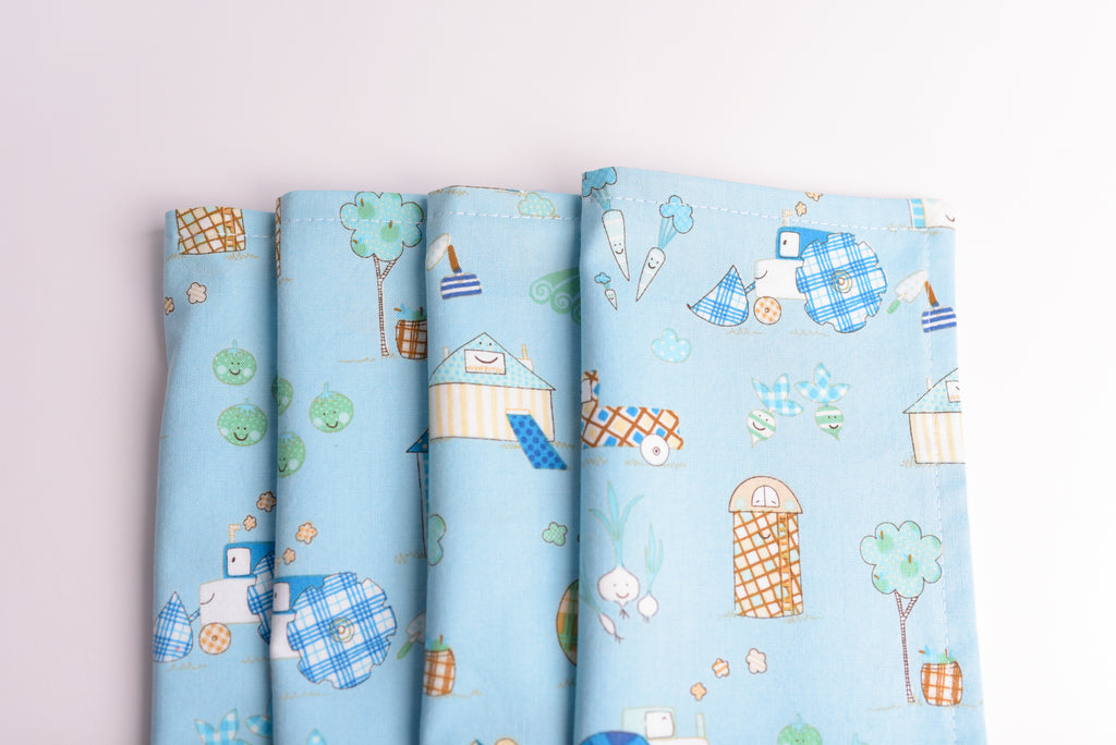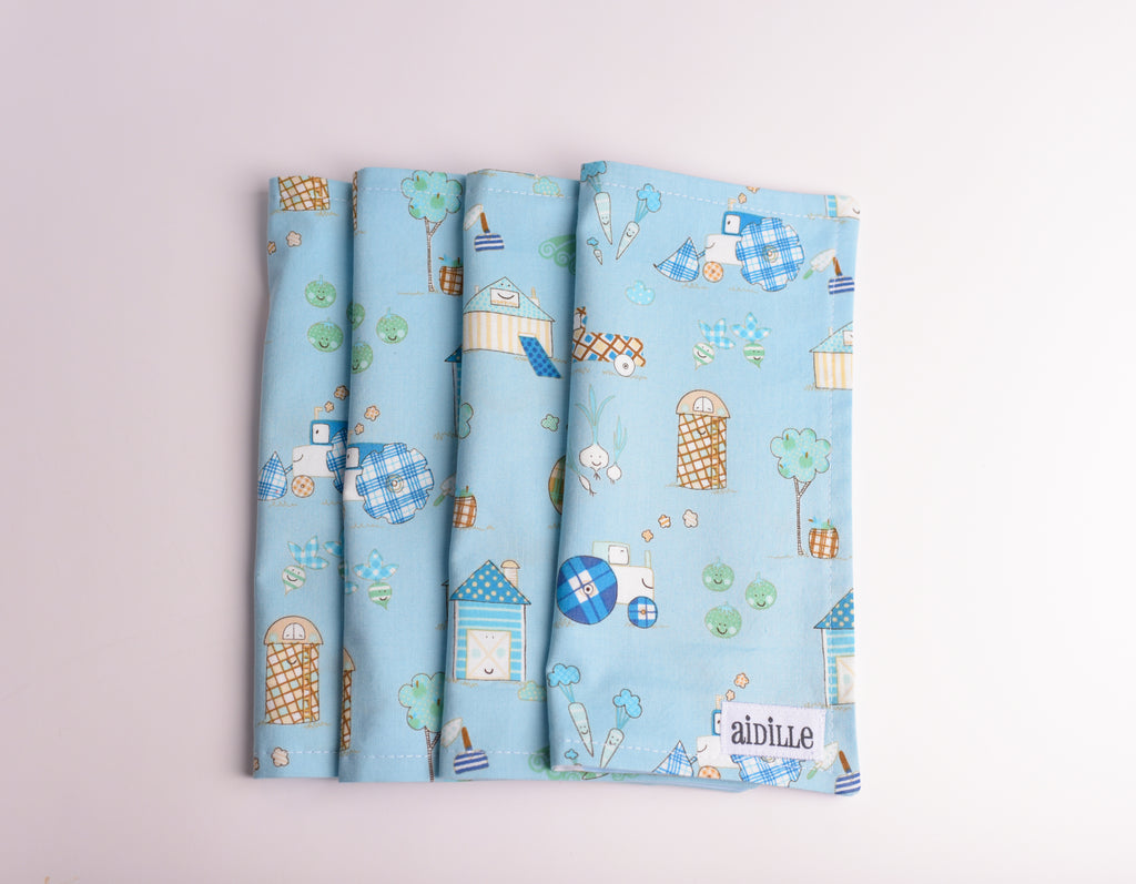 Beautiful set of 4 fabric napkins in a fun farm print on one side and blue sky with clouds on the reverse