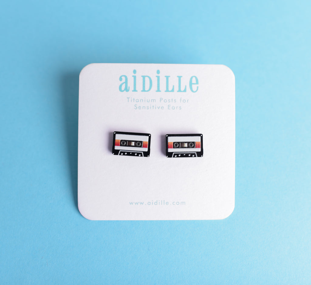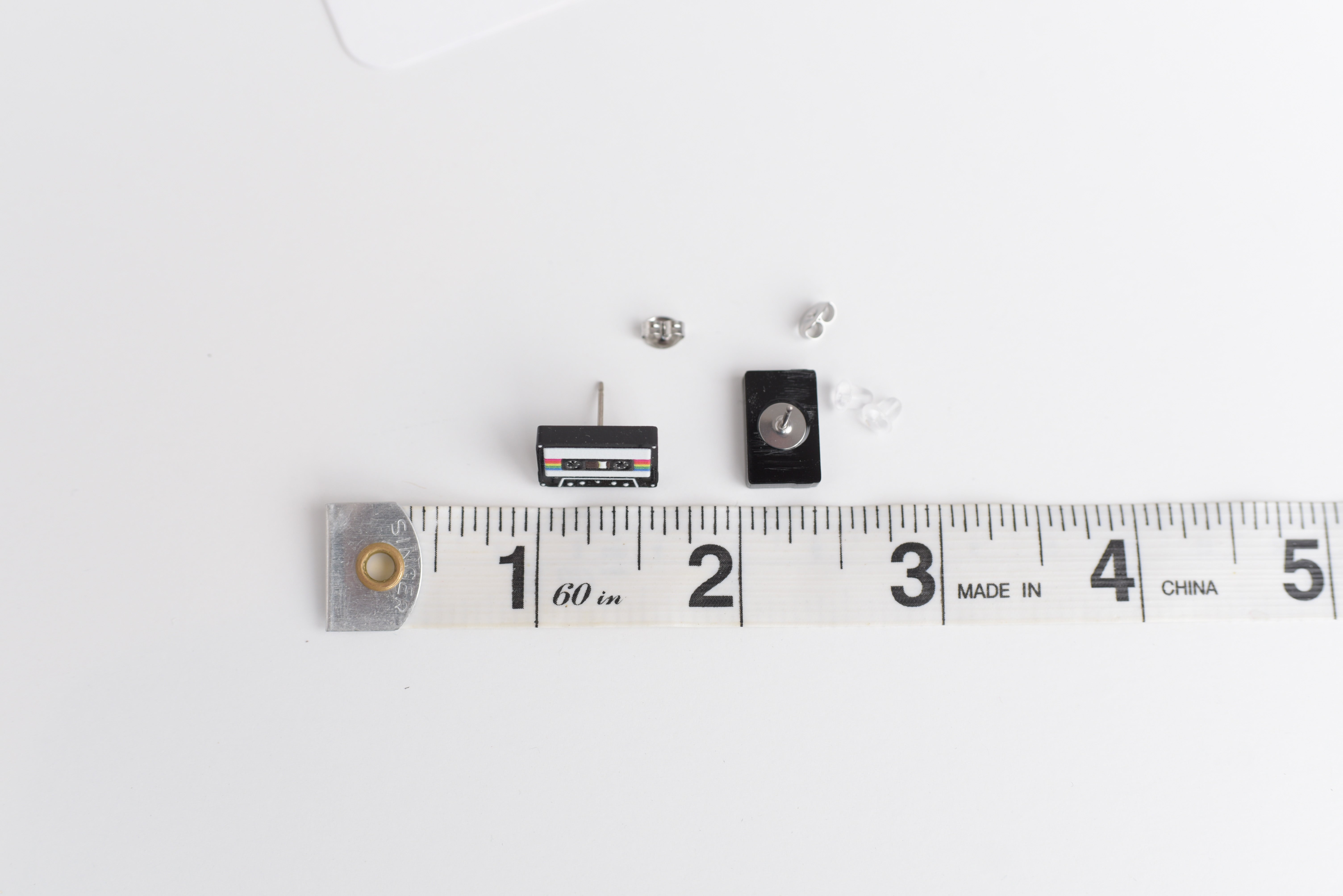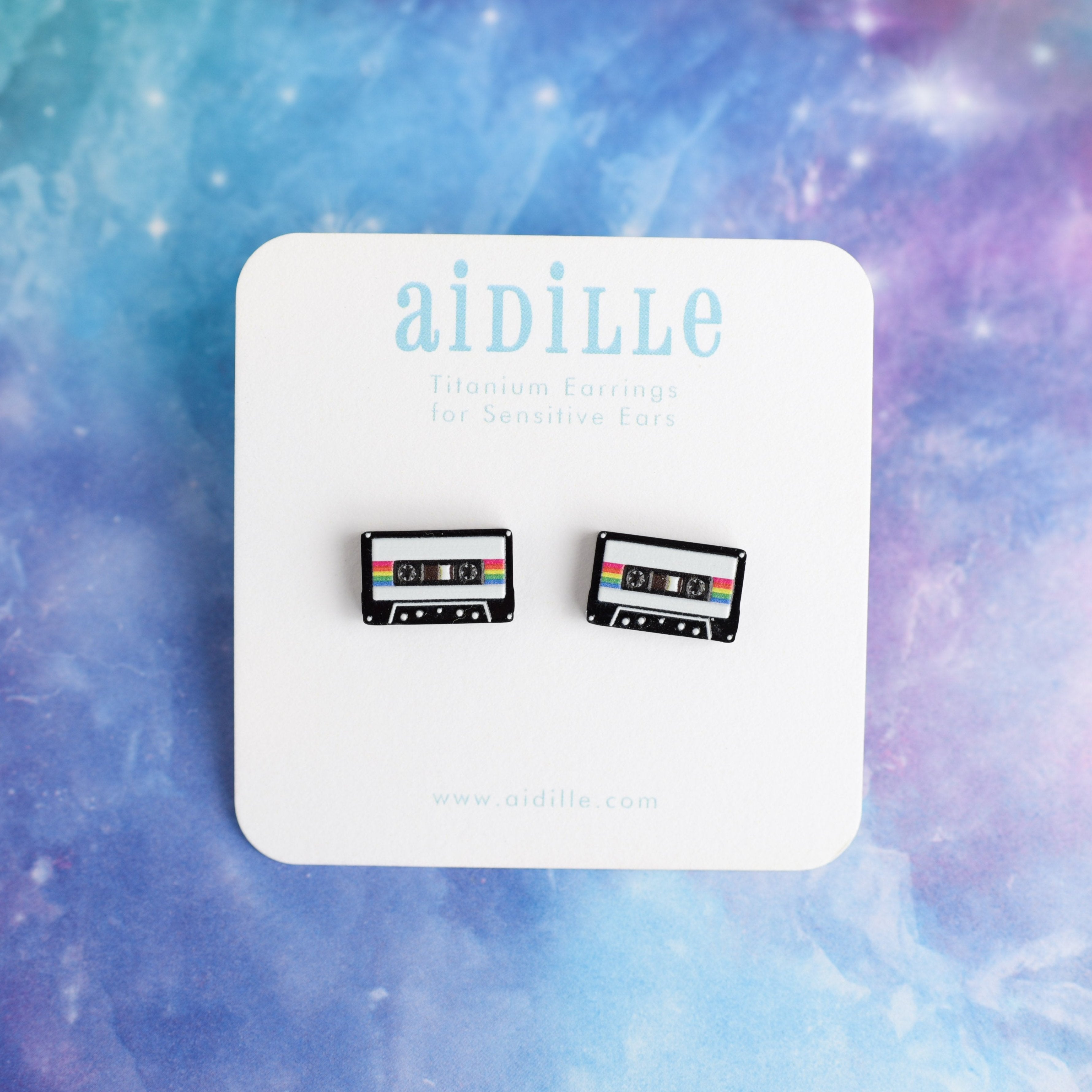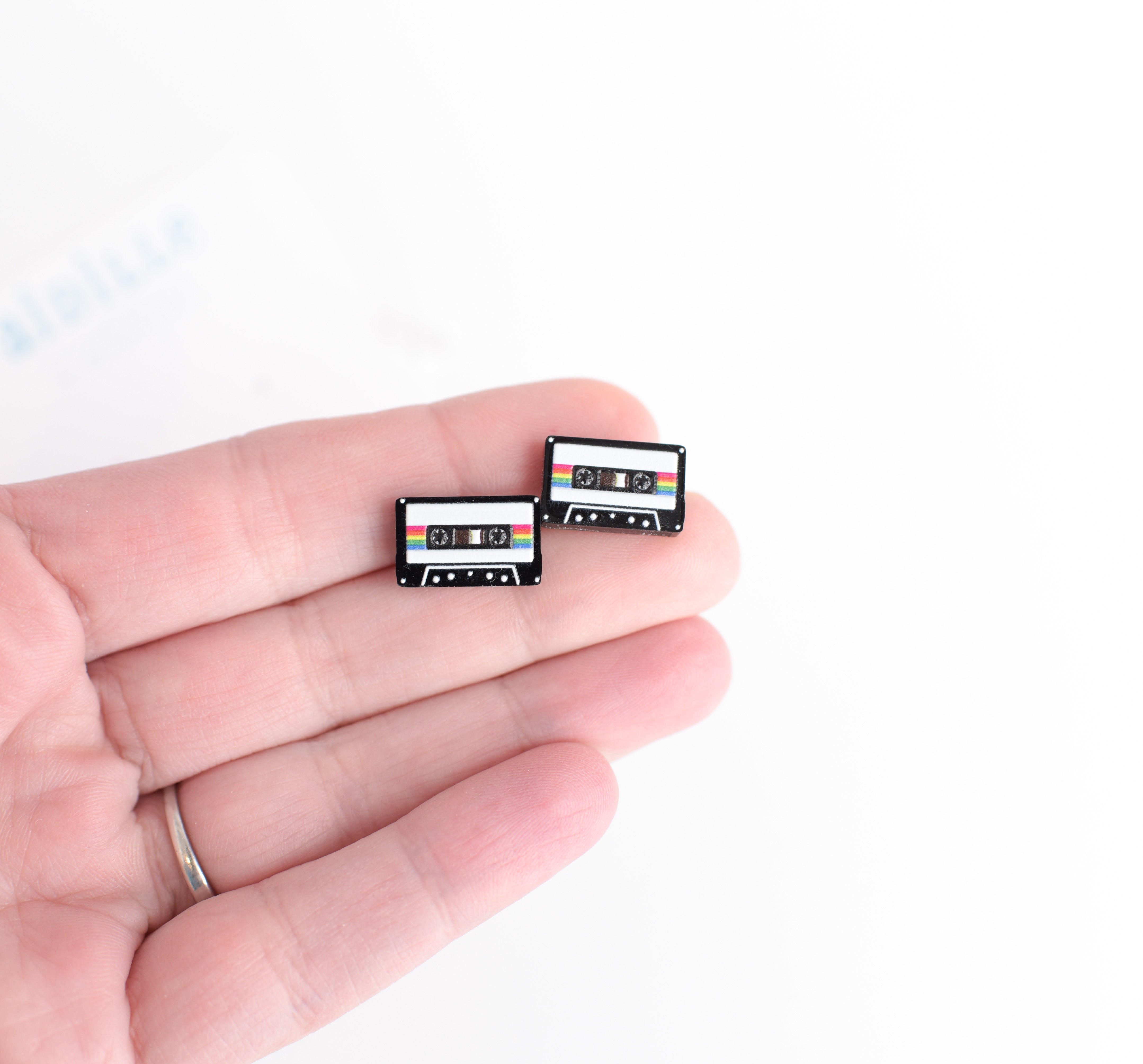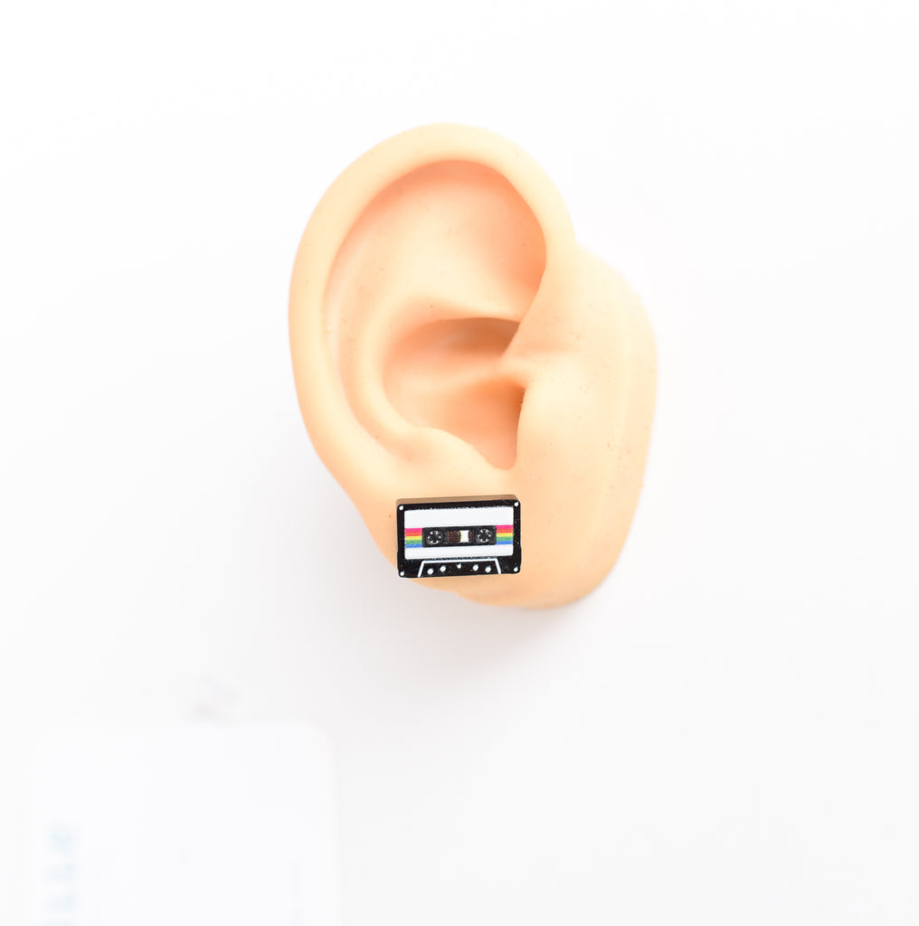 Anyone else getting a Stranger Things vibe looking at these fun cassette tape earrings? Made with lightweight printed acrylic charms and hypoallergenic titanium posts for sensitive ears. Choose from brown or rainbow. Earrings measure around 1/2" wide and include both silicone and stainless steel butterfly backings for choice.