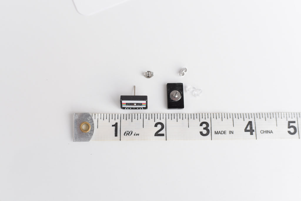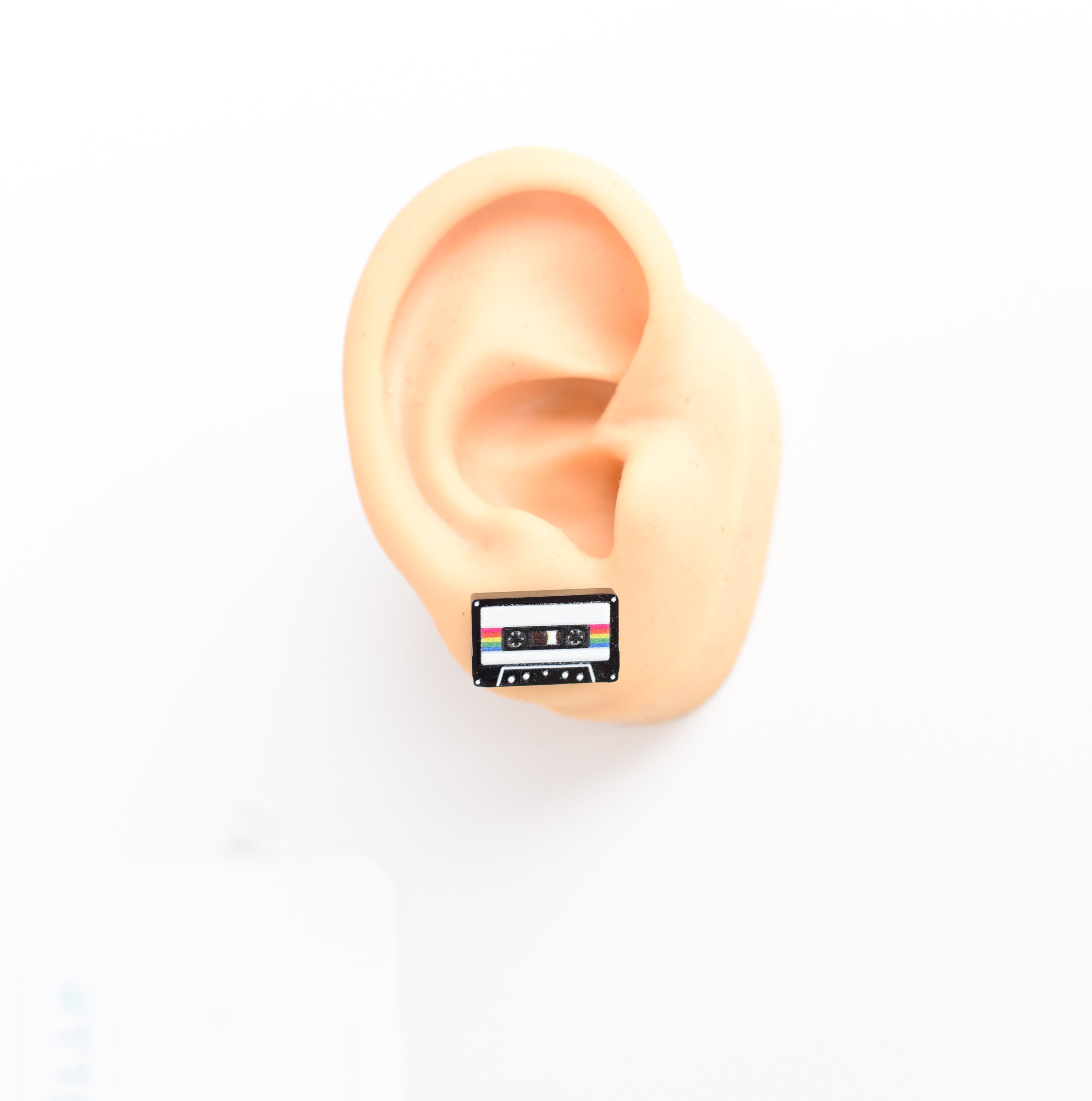 Cassette Tape Retro Earrings with Titanium Posts- Brown or Rainbow