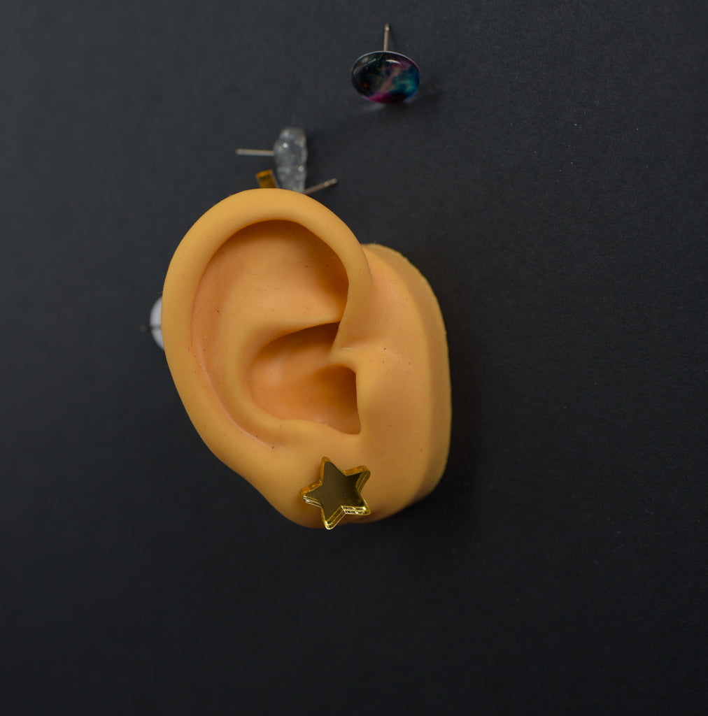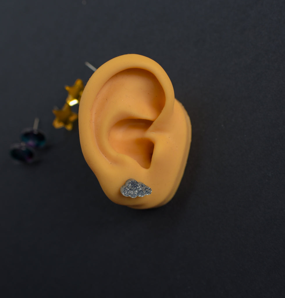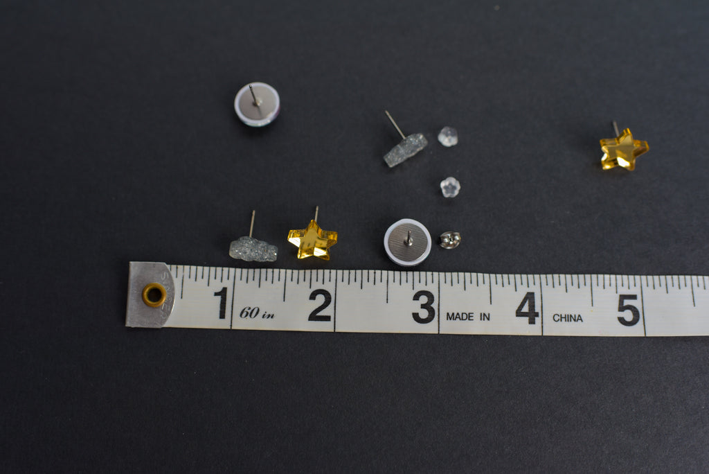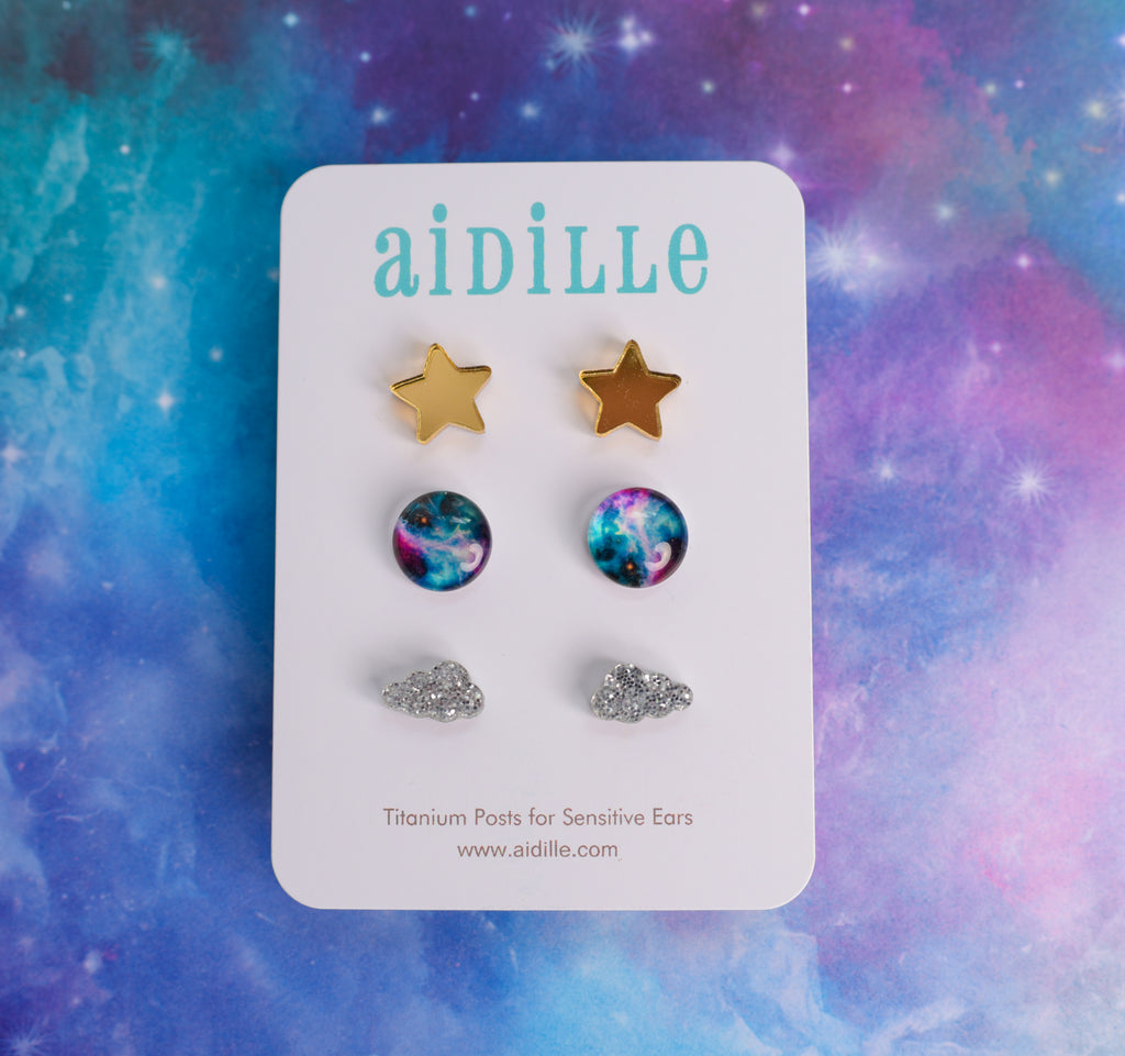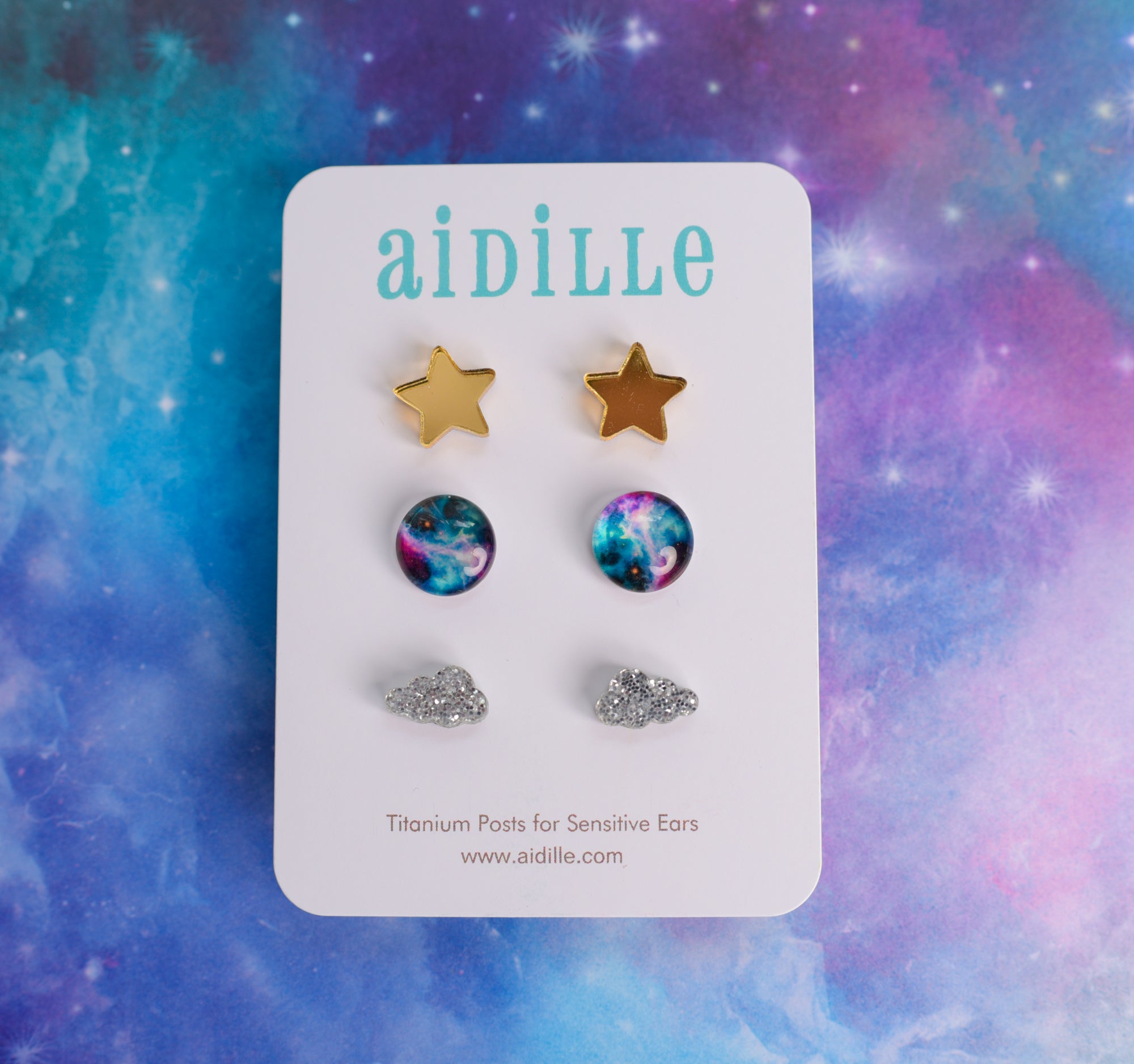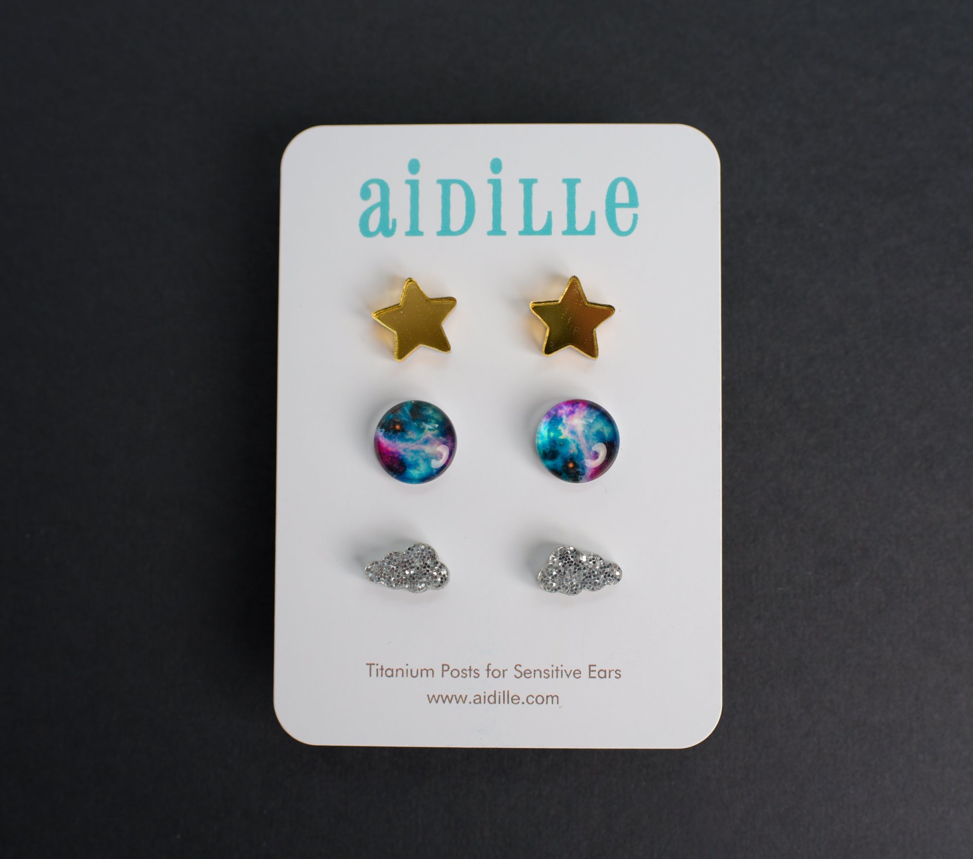 Out of this world earring multi pack set includes one pair each: resin galaxy 12mm circles, silver glitter acrylic clouds, and gold mirror acrylic stars. Earrings measure around 1/2" +/-, see images for scale (silicone model based off size of average woman). Earrings are hand assembled using quality charms and nickel free, hypoallergenic titanium posts. Stainless steel and silicone backings are included for choice and a secure fit. Perfect for space lovers and anyone who loves to look at the beautiful night sky!