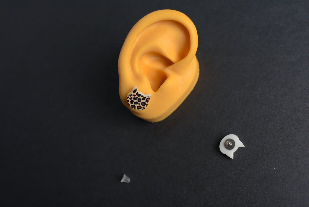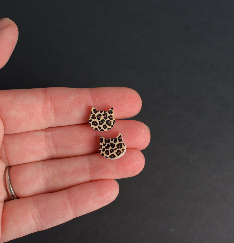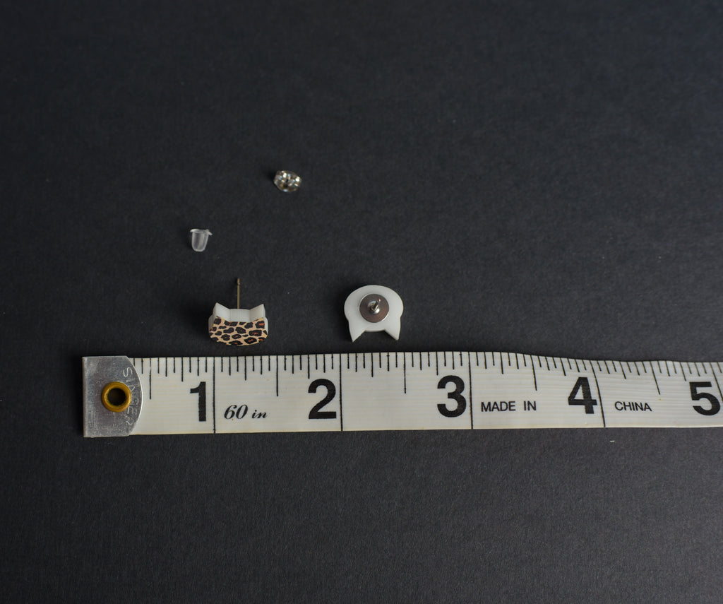 Animal print cat acrylic charm earrings feature hypoallergenic, nickel free titanium posts for sensitive ears. Earrings measure 1/2" wide and include both stainless steel and silicone backings for choice.