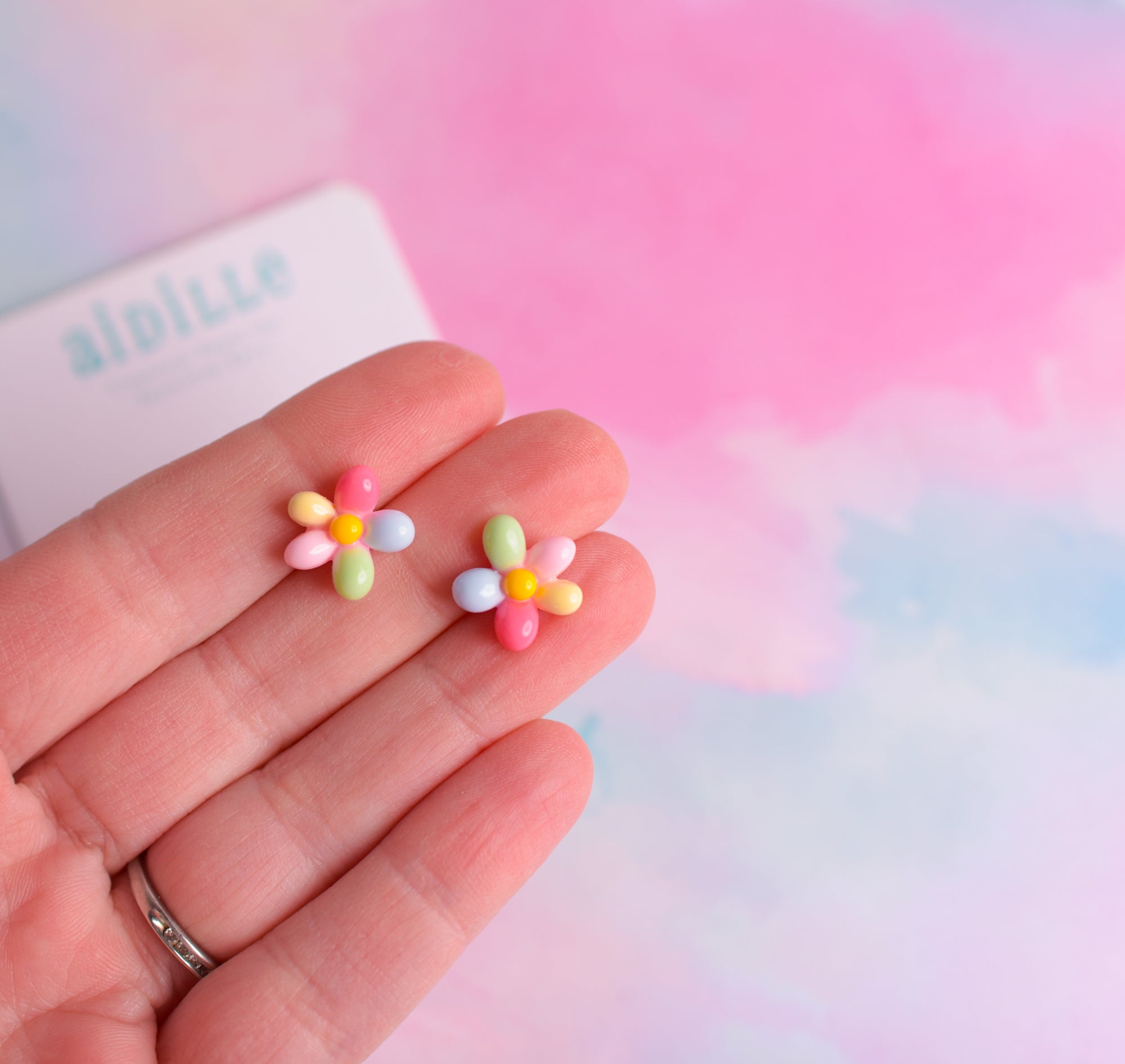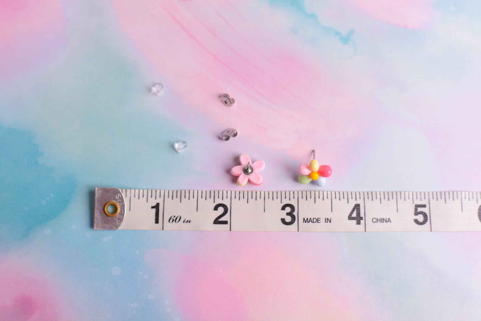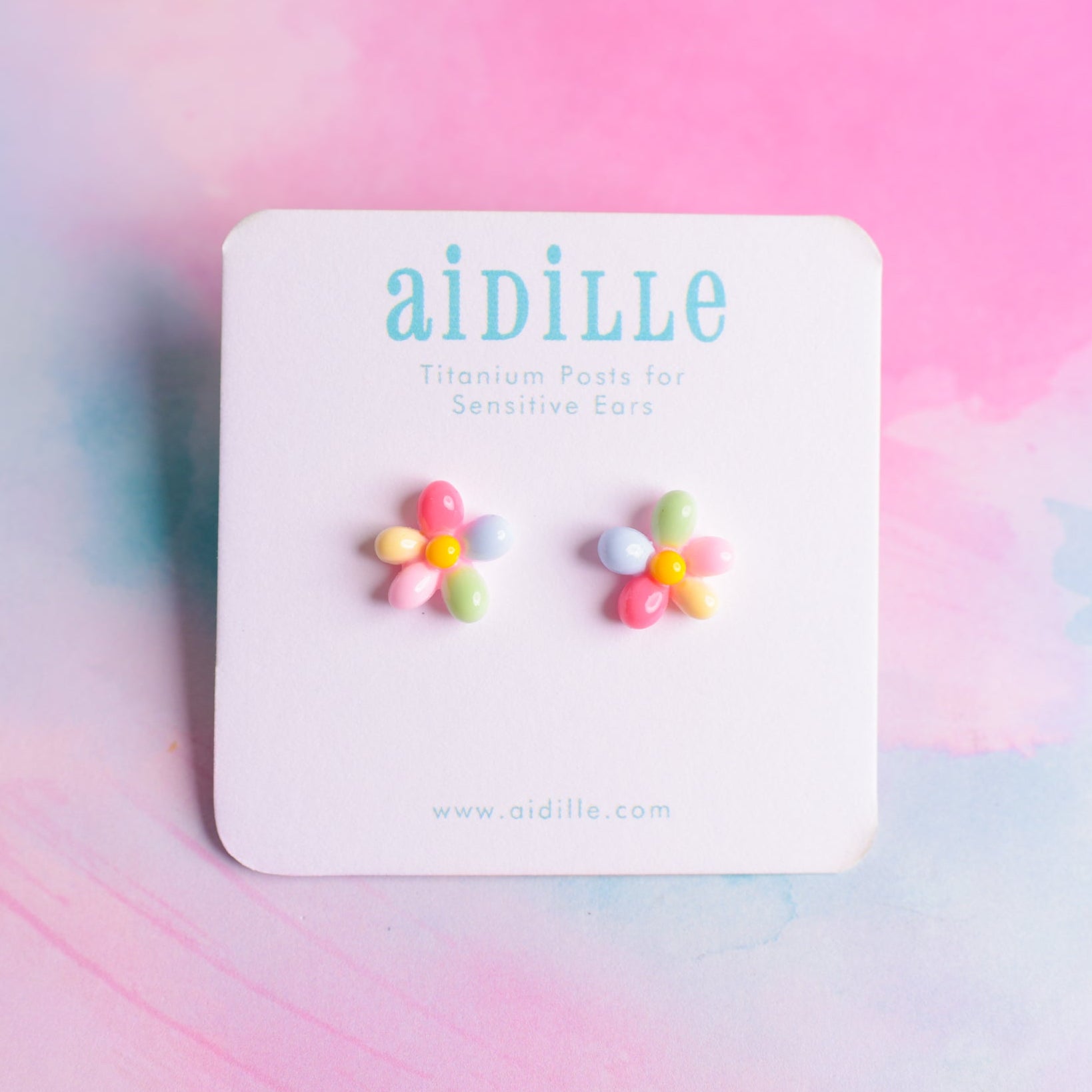 Sweet little rainbow flower earrings with titanium posts; great for sensitive ears. Earrings are lightweight and measure about 1/2" wide. Both stainless steel and silicone backings are included for choice.