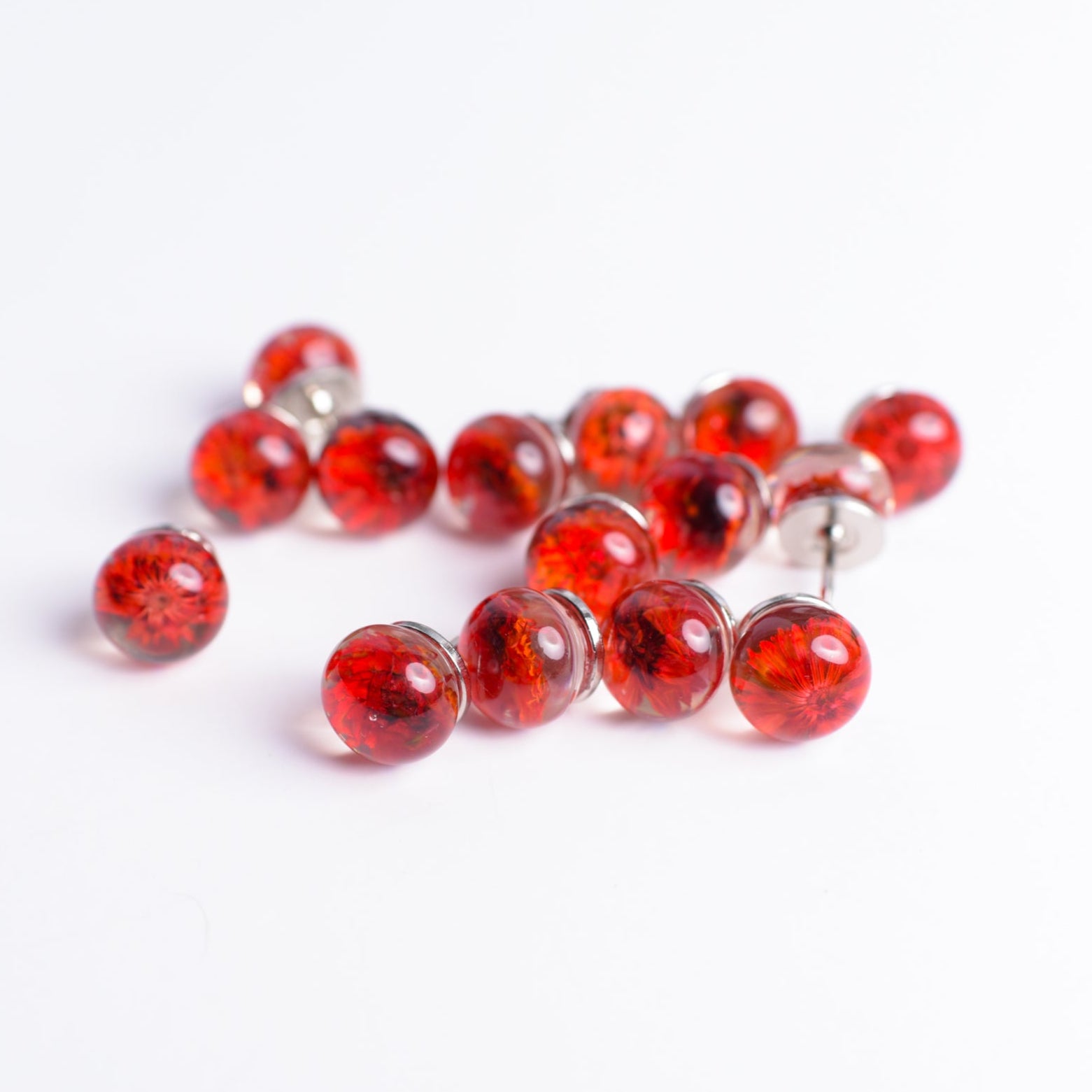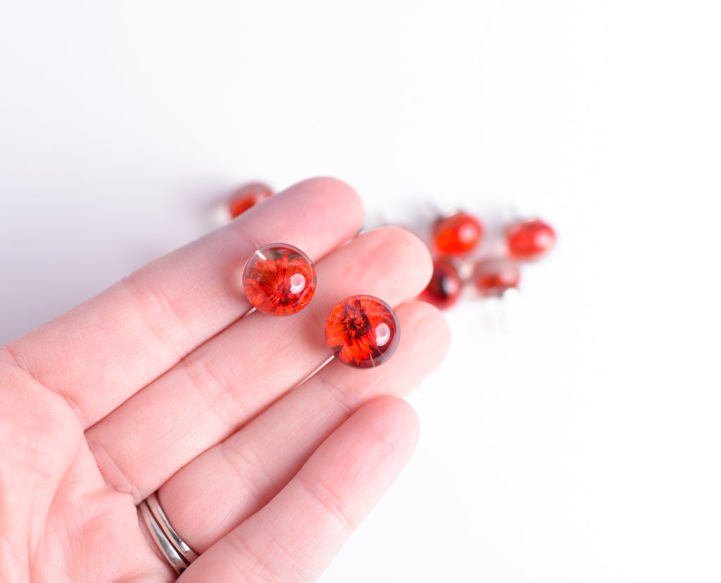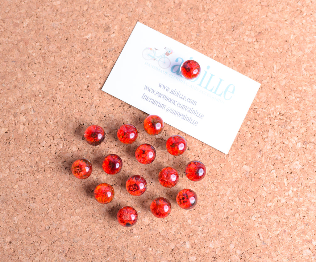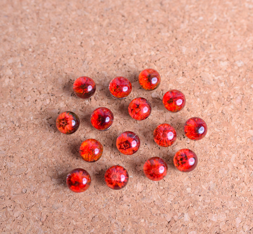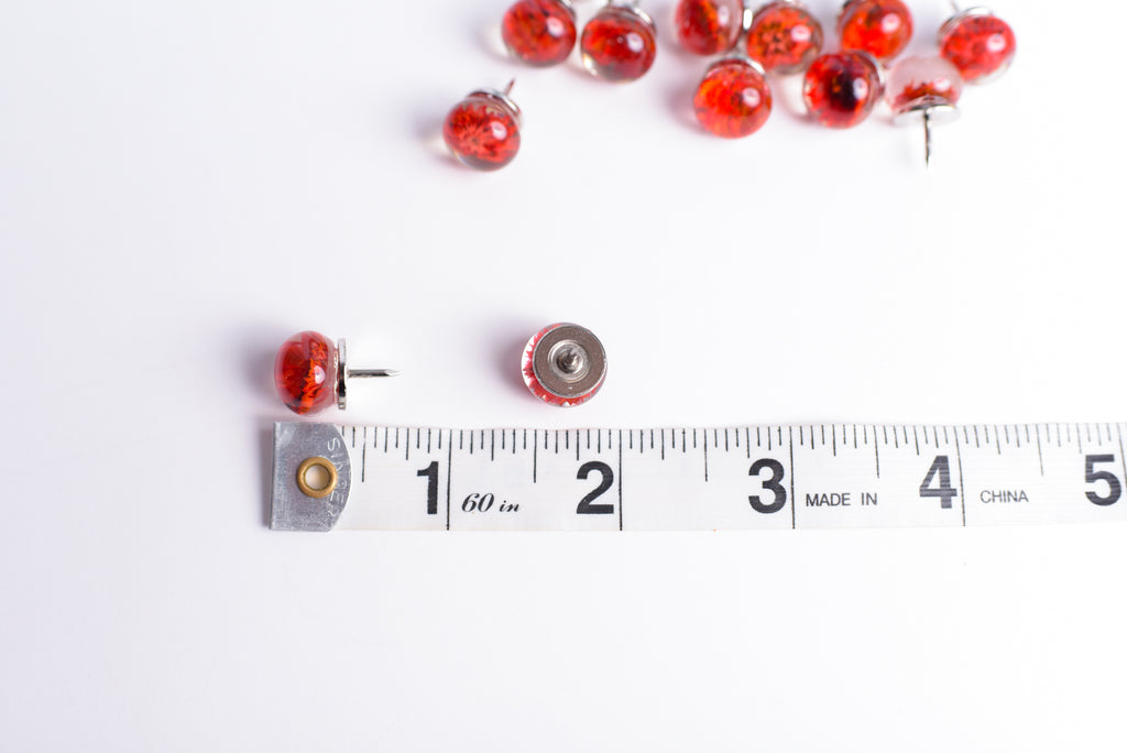 Small clear globes with red flowers inside are securely affixed to sturdy metal push pins- add an elegant touch to your home or office corkboard. Set includes 15 mini pins; charms measure around 10mm wide.