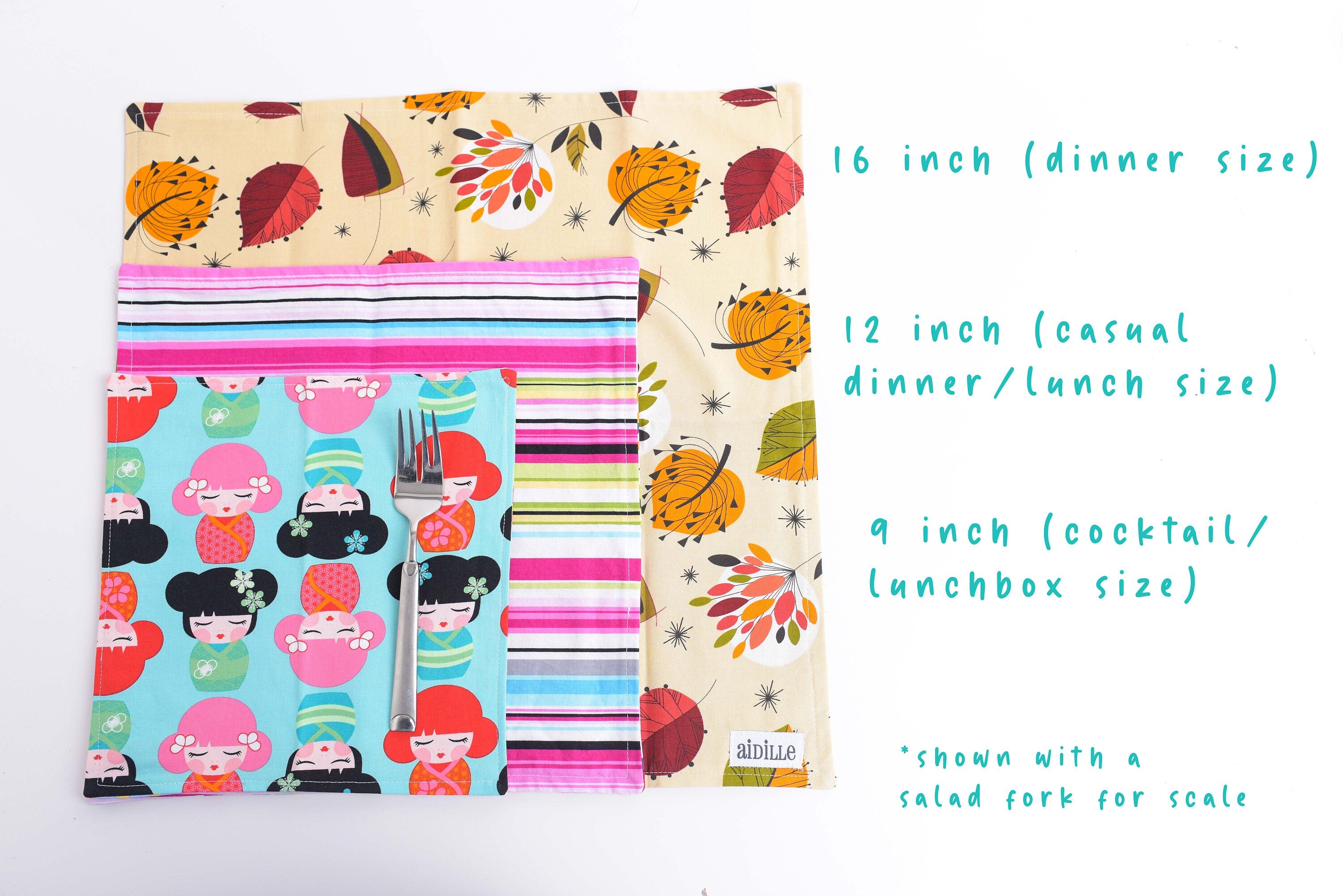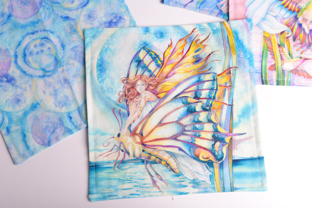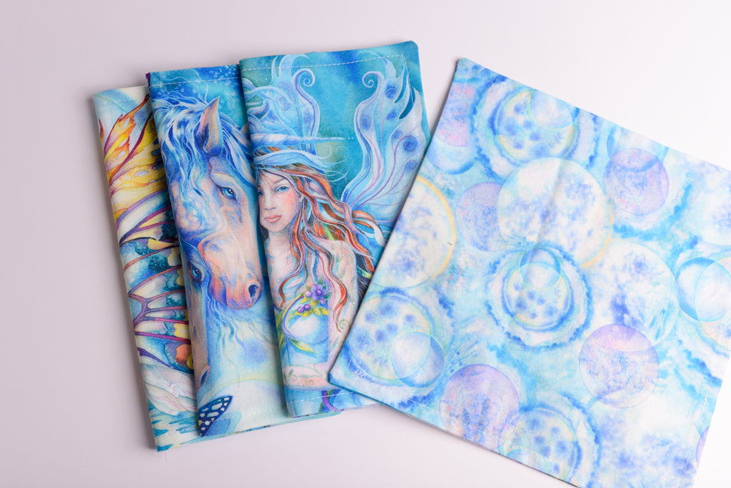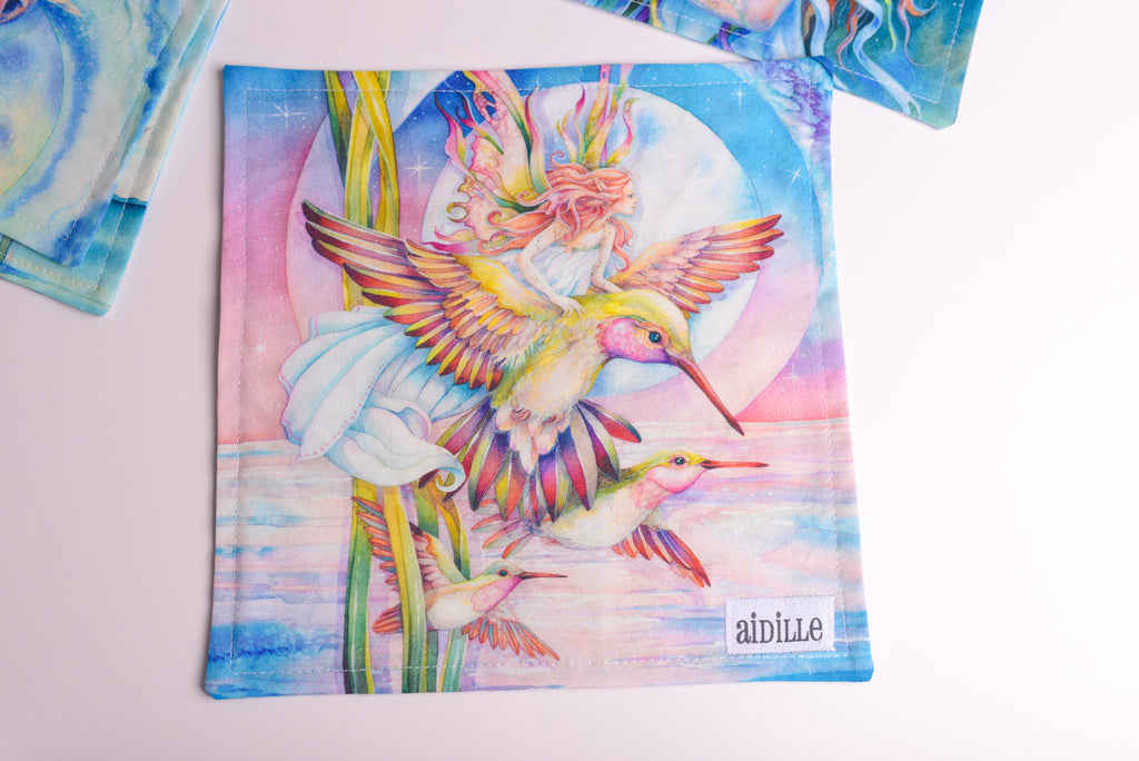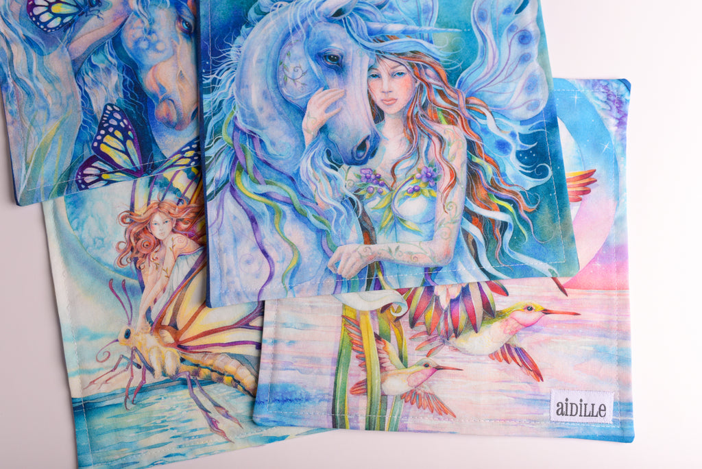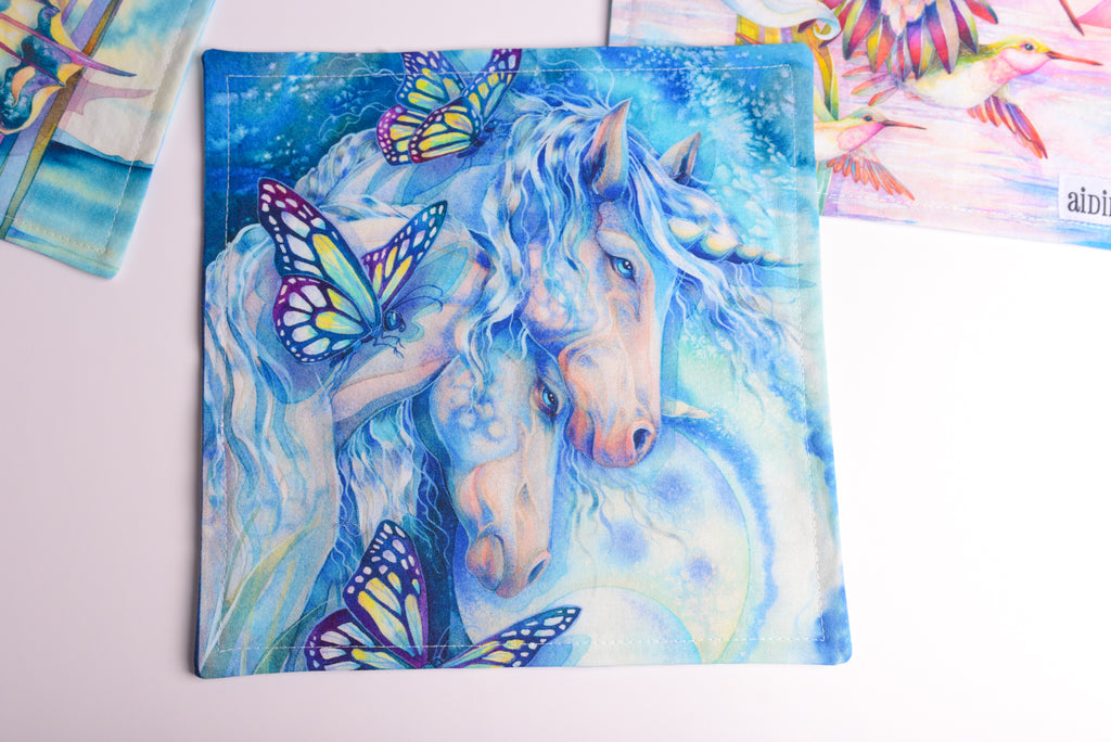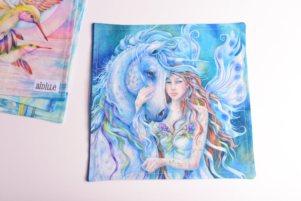 One of a kind fairy and unicorn print small lunch sized cocktail napkin set- reversible with a celestial scene on the back! You will receive 4 handmade napkins as shown. Napkins measure around 9" square and an Aidille woven label is sewn to the bottom of one napkin. 100% cotton fabric is rare and out of print. Only ONE set is available!