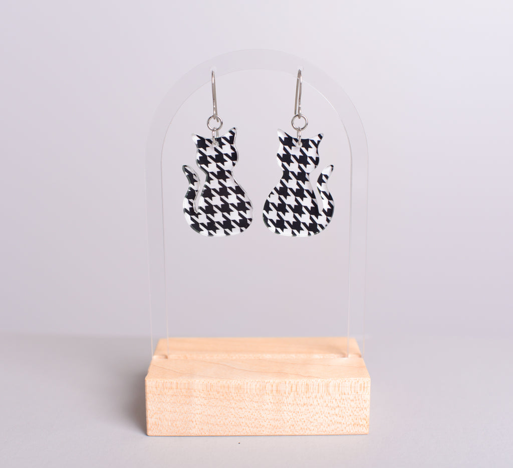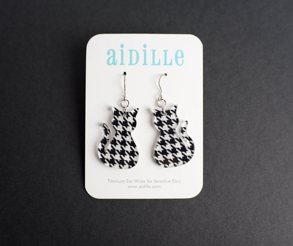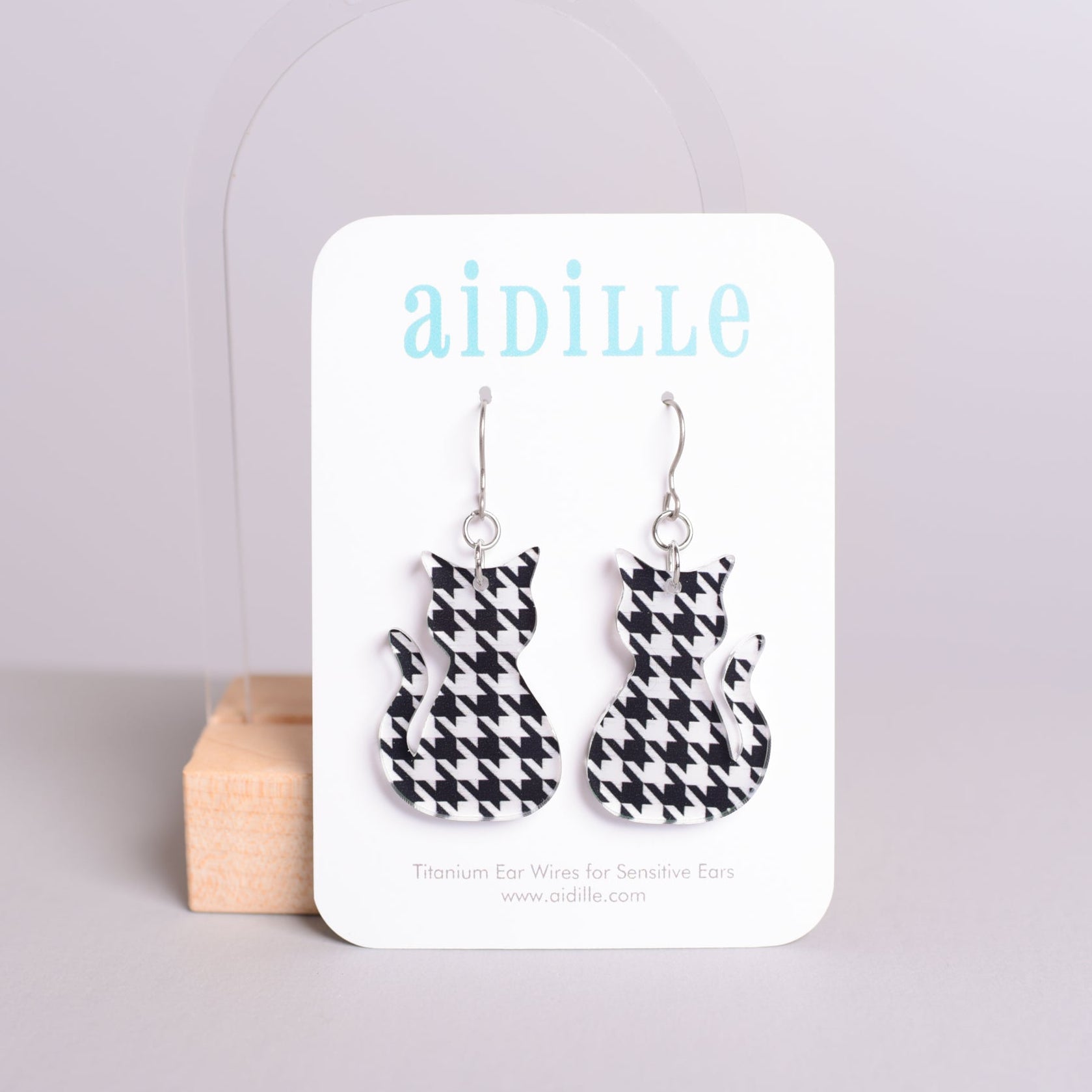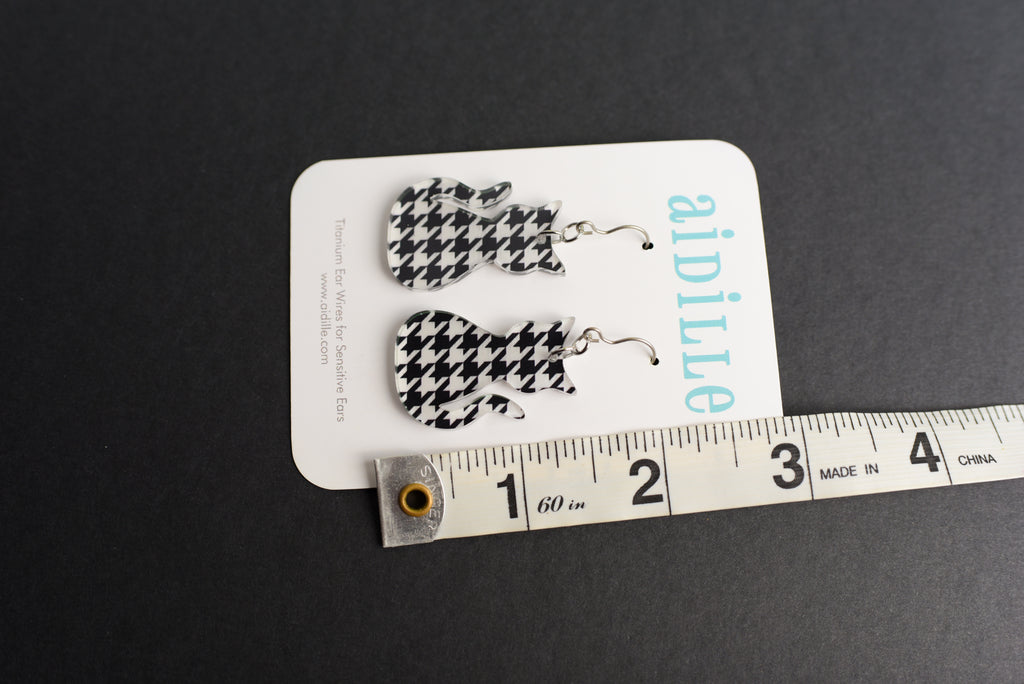 Houndstooth Cat Acrylic Dangle Earrings with Titanium Ear Wires