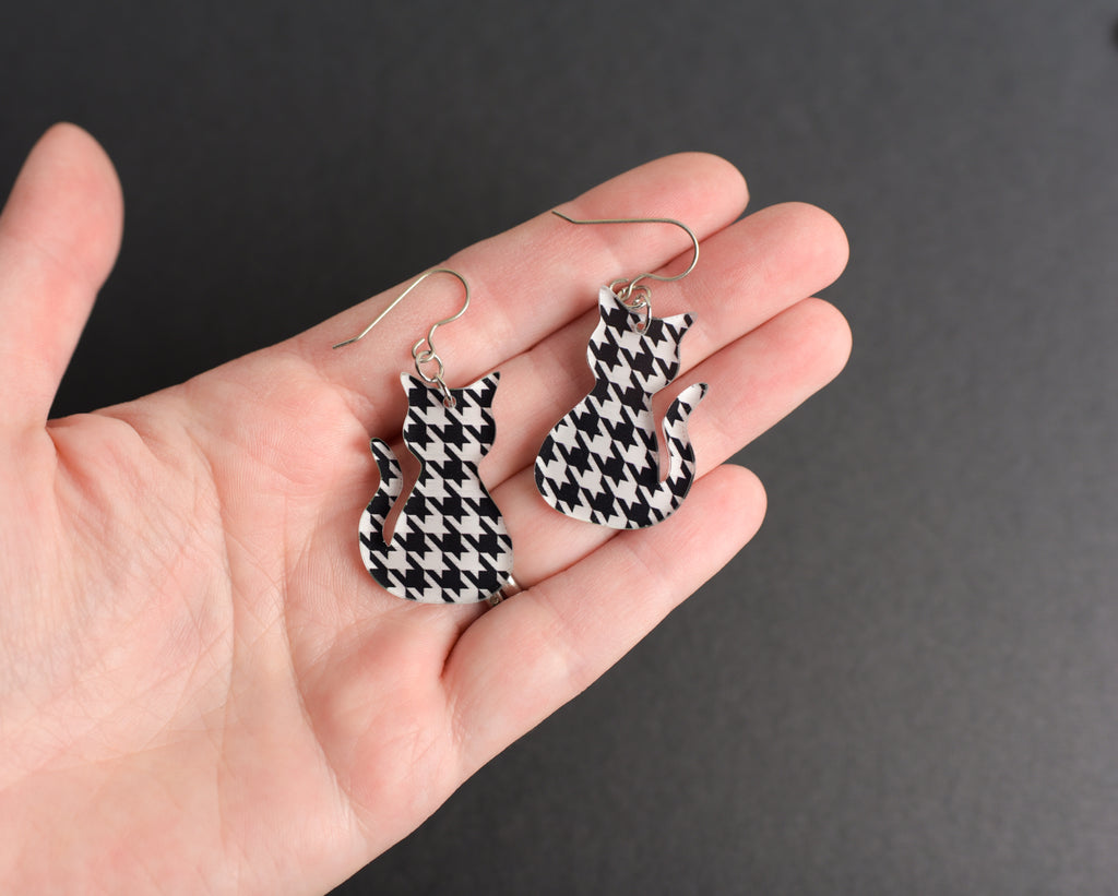 Fun black and white houndstooth cat silhouette dangle earrings are hand assembled using made in the USA lightweight acrylic charms and hypoallergenic, nickel free titanium ear wires. Earrings measure around 2" tall with the ear wires.