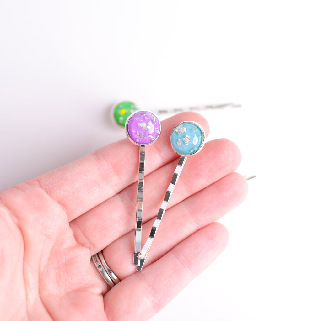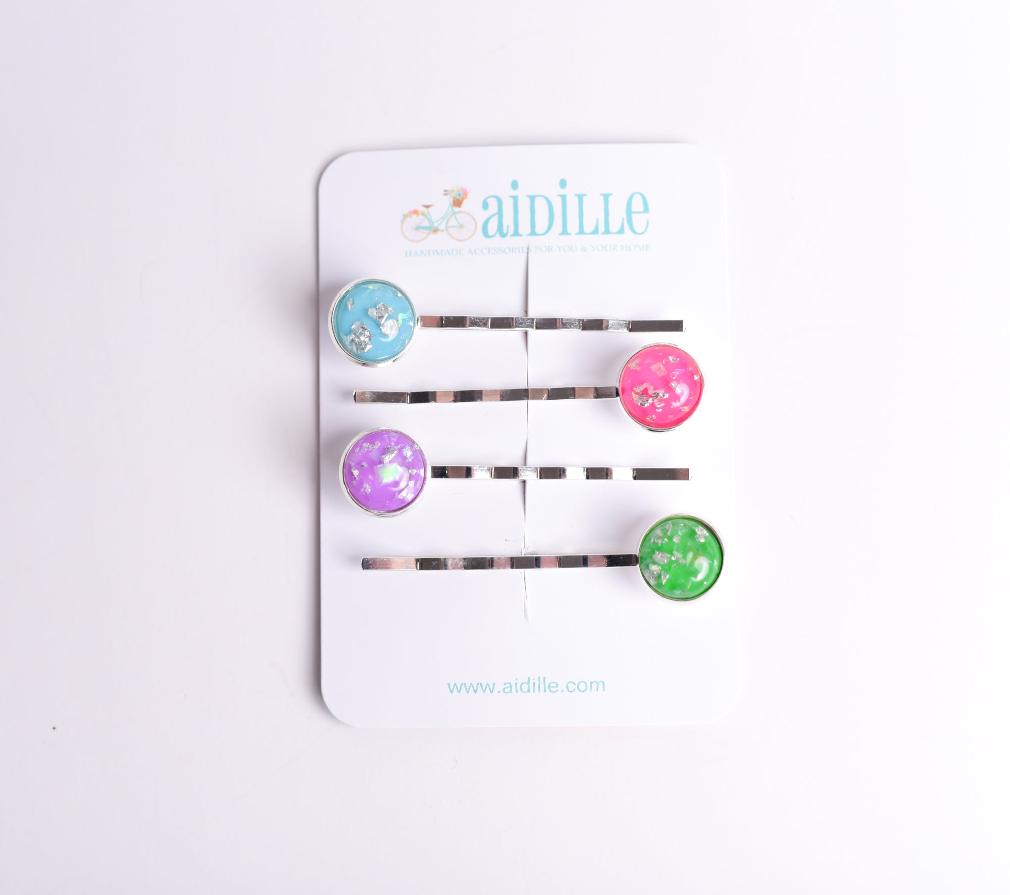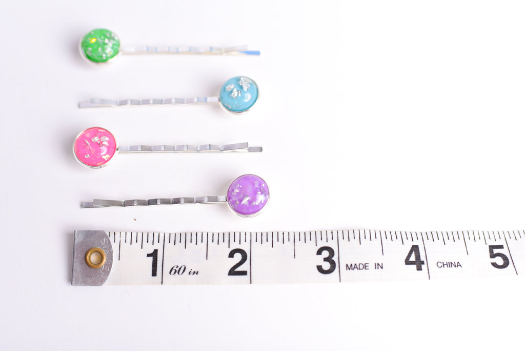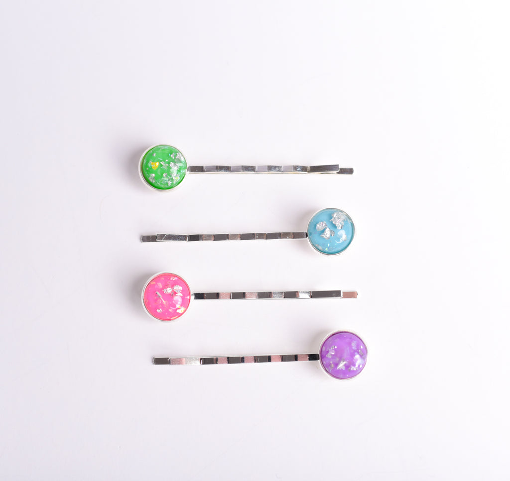Set of 4 colorful iridescent flecked silver plated bobby pins