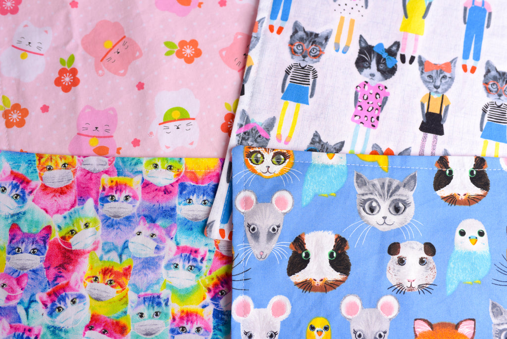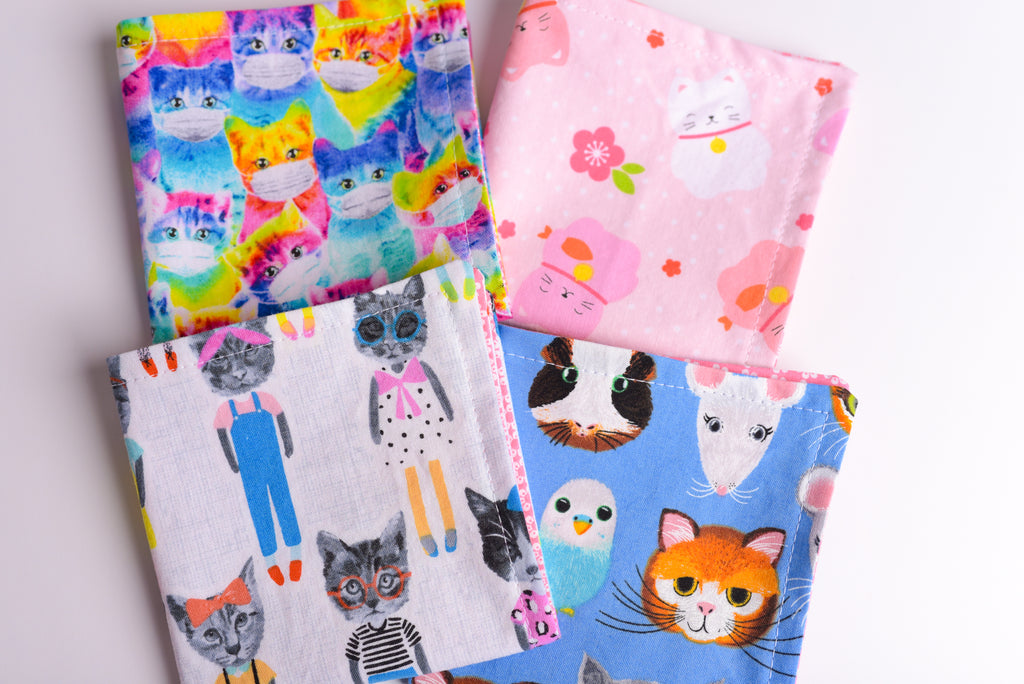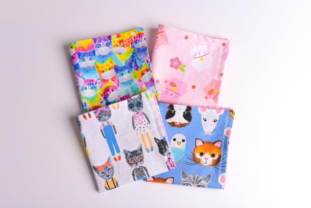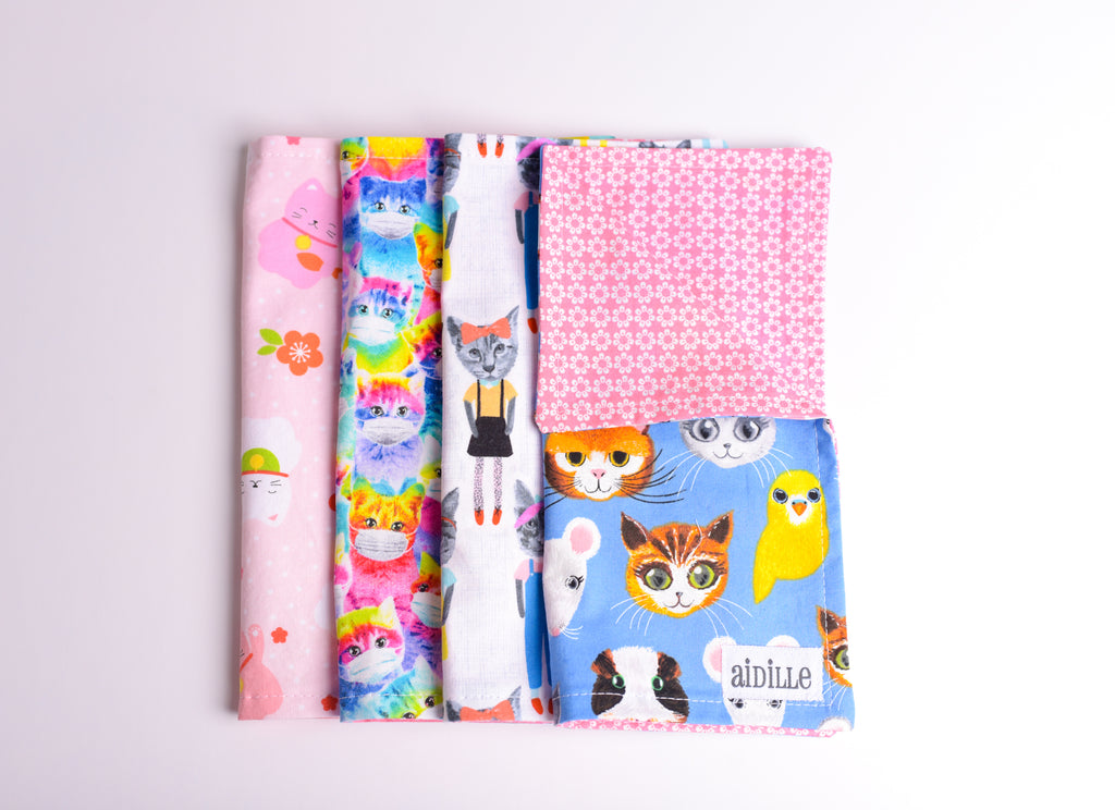 If you like cats you are going to LOVE this sweet assorted cat print cocktail napkin set! You'll receive 4 prints; kawaii Japanese cats, rainbow cats in facemasks, school girl cats, and assorted animals with more cats! Napkins measure a petite 9"x9" size and are perfect for cocktail parties and lunchboxes. Reversible side is a pink daisy print- 100% cotton with an aidille woven label sewn to the bottom of one napkin.
